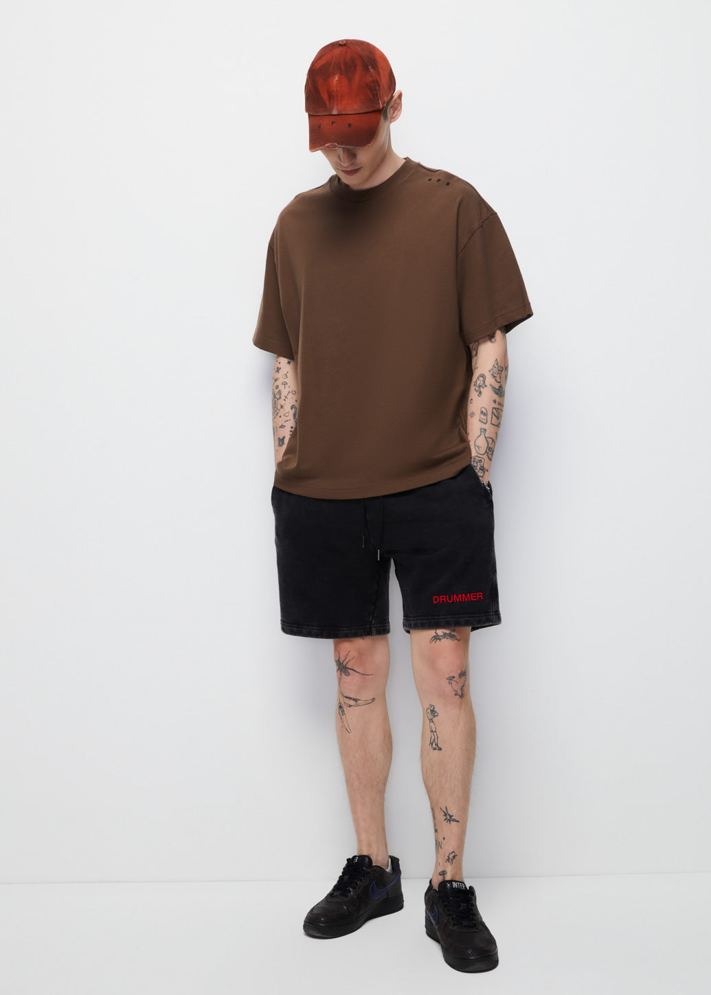 Embroidered shorts from the C P S x Bodyslam collection offer the band's signature cool. Inspired by Chat, Bodyslam's drummer, the design stands out with bold red 'DRUMMER' embroidery at the hem—a piece for casual looks across every season.