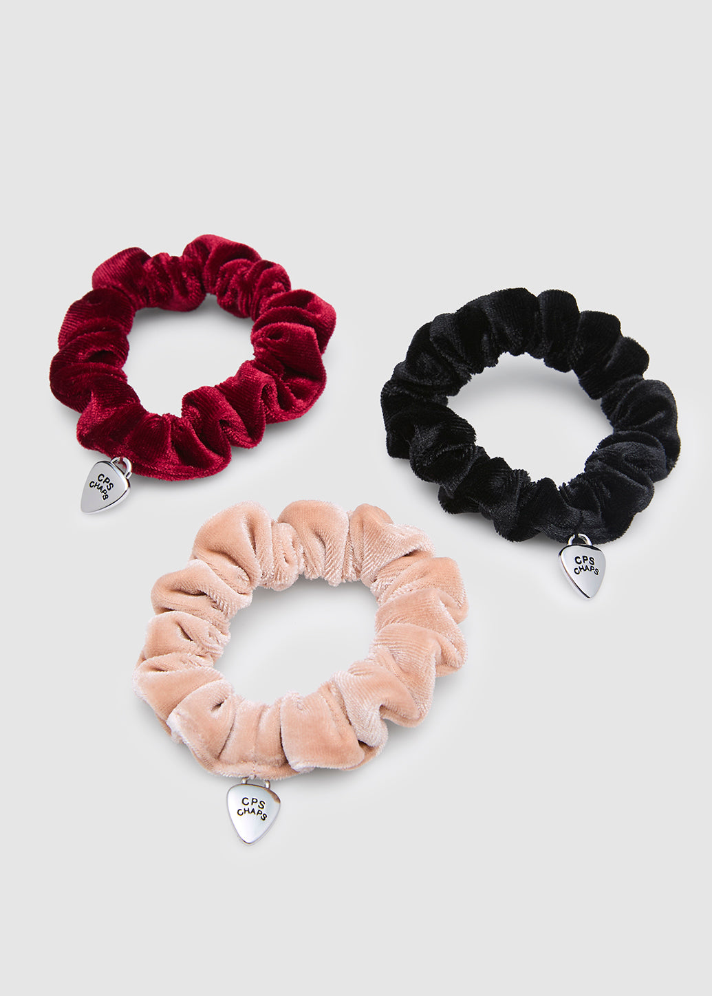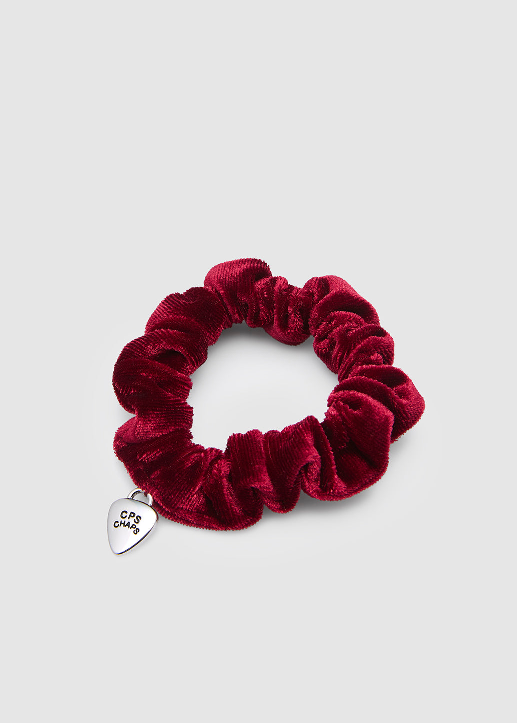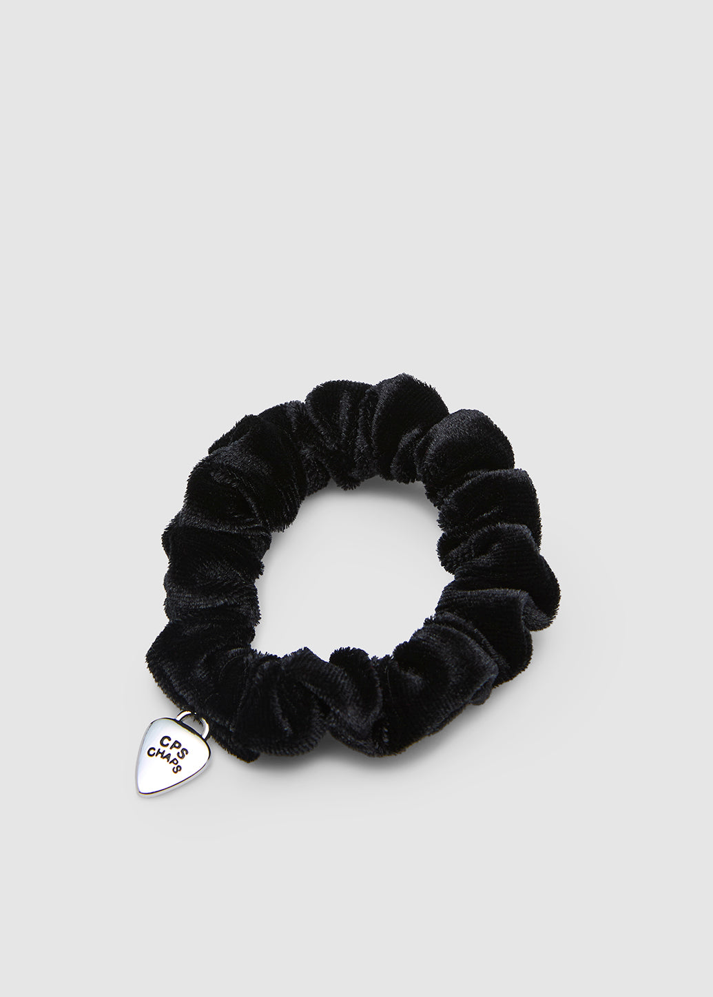 This velvet scrunchie offers a soft and luxurious feel with a refined edge. Accented with a signature silver guitar pick charm, it blends elegance and attitude seamlessly. The piece is perfect for tying up your hair in a unique look.