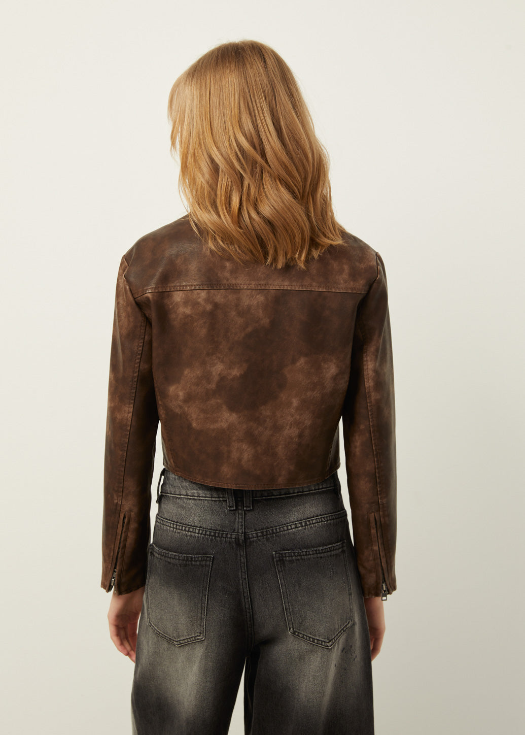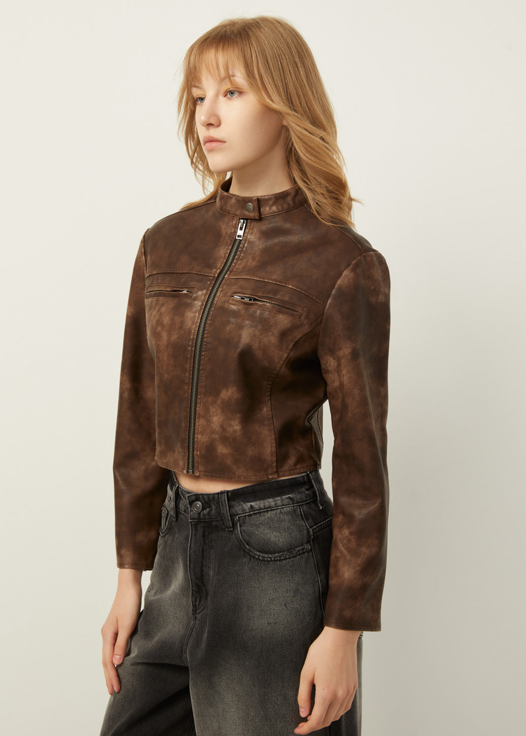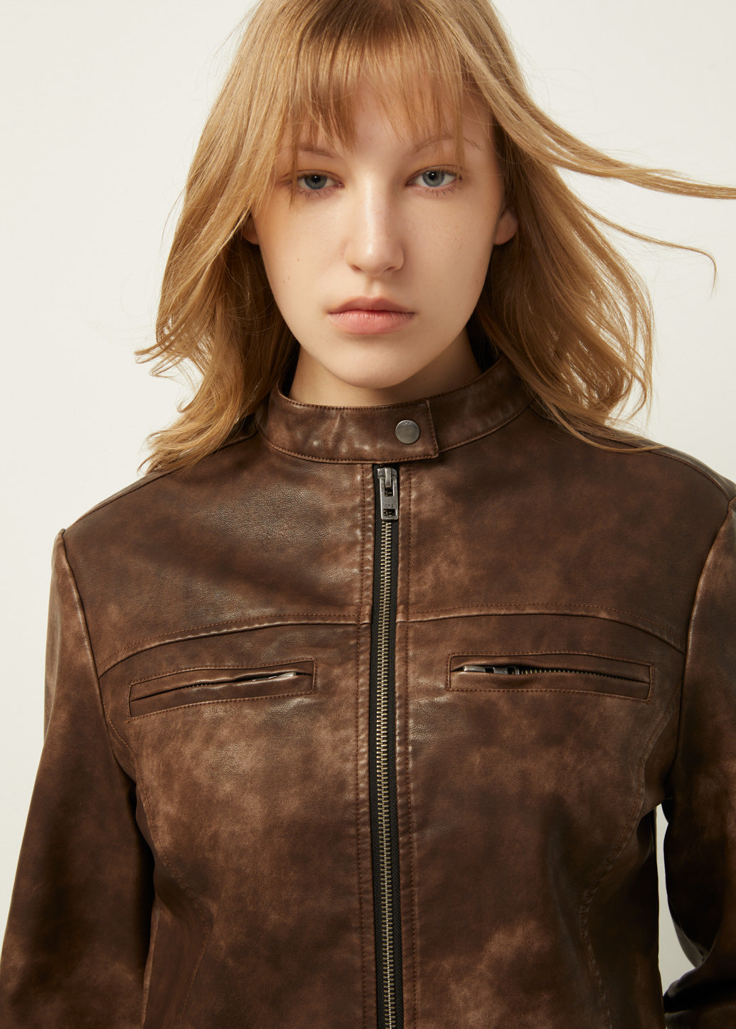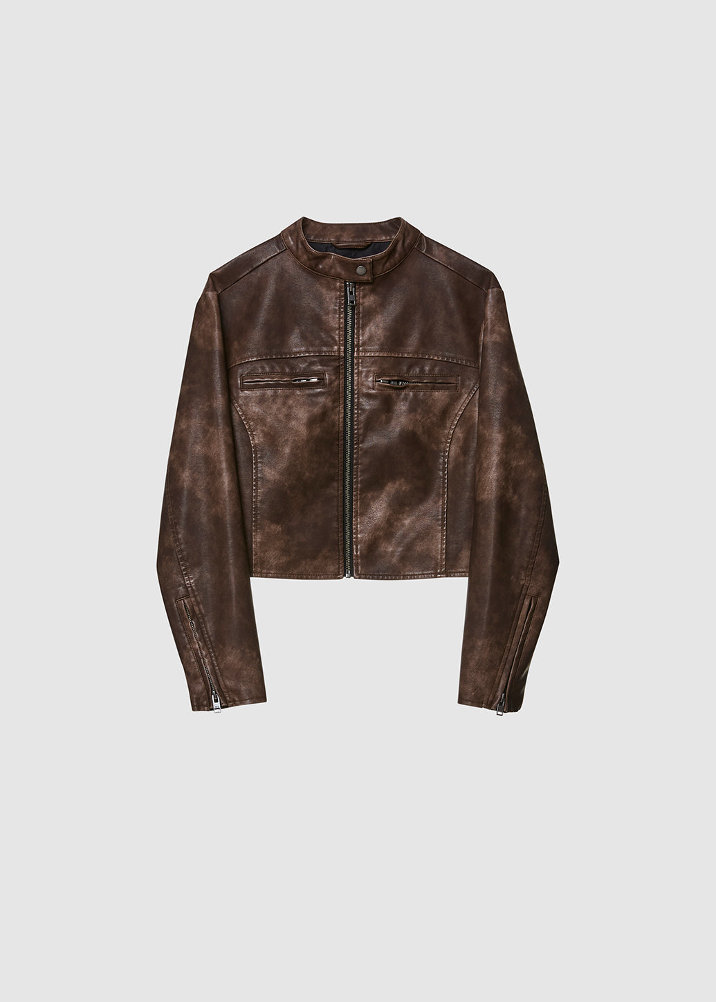 Make a cool statement with this leather jacket that comes with a front zipper and a wrap snap-button collar. It effortlessly combines rugged charm with refined style to give your look a sporty and chic vibe.