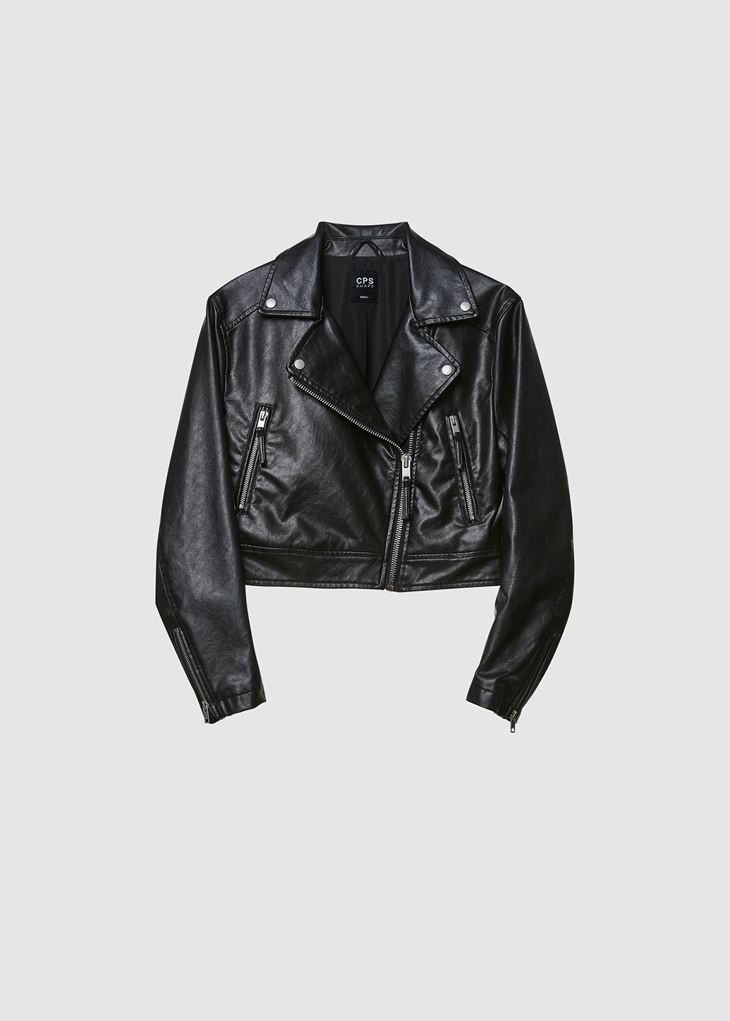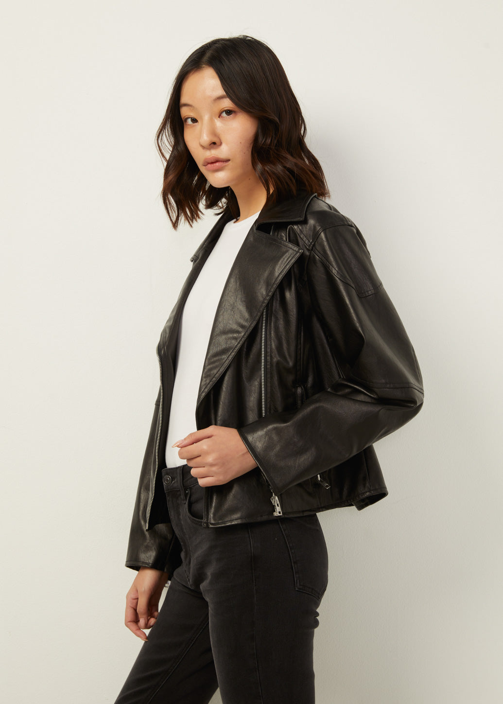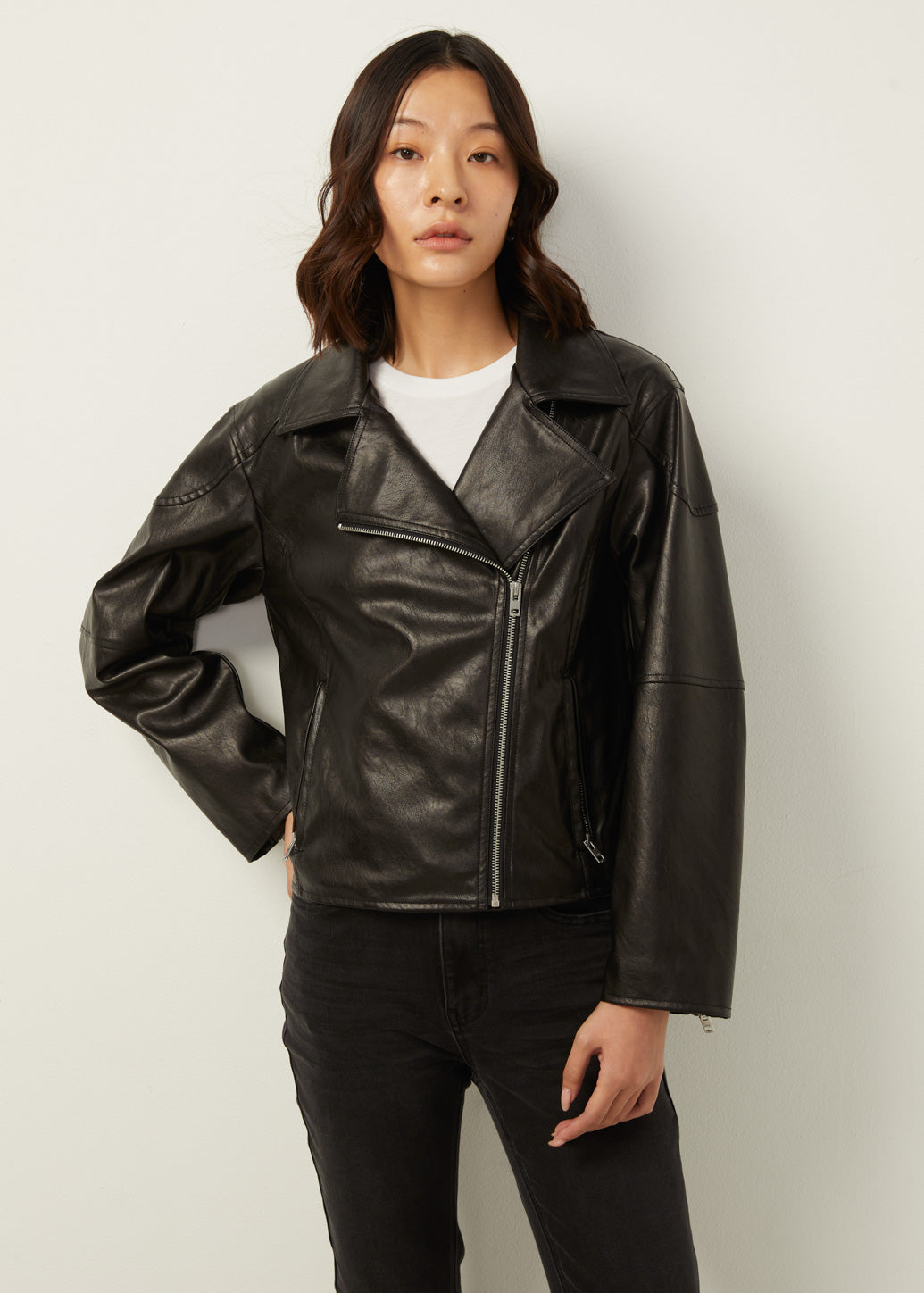 Black faux leather women's jacket featuring a wrap zip and front panel seam for a modern biker style. Designed with functional zip pockets and a classic collar, it's perfect for creating layered outfits with an effortlessly cool vibe.