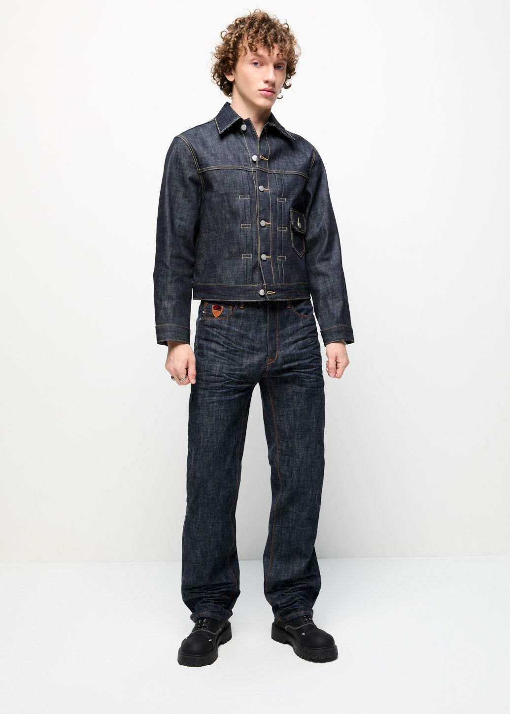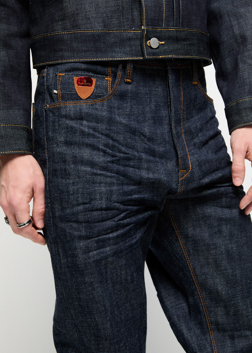 Dark-wash straight-leg denim from the CPS x Selvedgework collaboration for our 45th Anniversary. Crafted from classic raw denim, this design reflects a rugged yet timeless attitude. Signature details include a guitar pick accent with a leather guitar-pick holder on the front pocket, and distinctive stitching inspired by Selvedgework’s iconic craftsmanship—delivering an authentic, confident denim look.