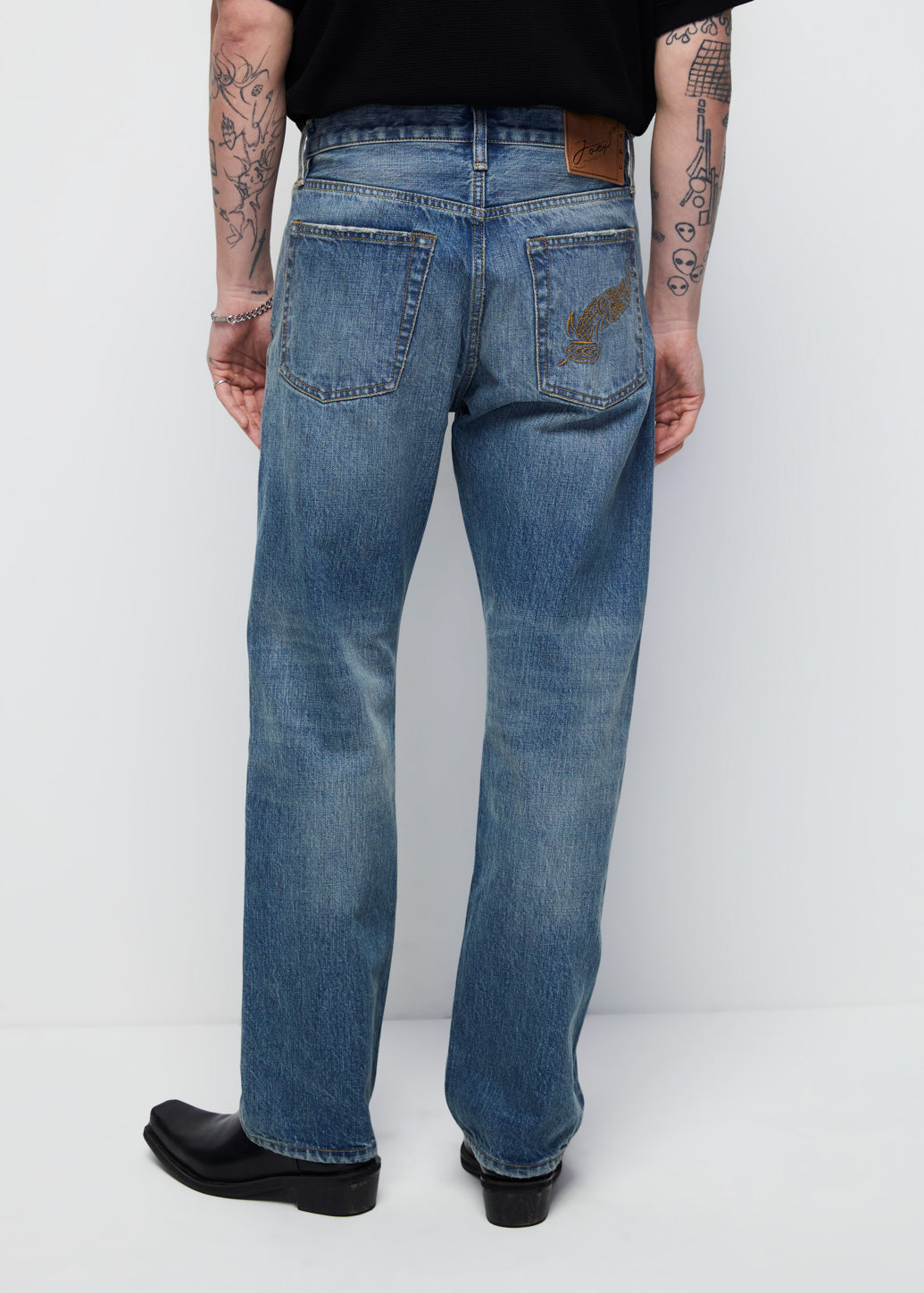 Straight-leg jeans from the C P S x Joey Phuwasit collaboration with our 45th Anniversary, celebrating the brand’s 45th anniversary and featuring a washed denim finish and signature details—including a metal guitar-pick logo with the artist’s name. Finished with a leather patch at the back and the artist’s exclusive artwork on the right back pocket, this design offers a modern and confident look.