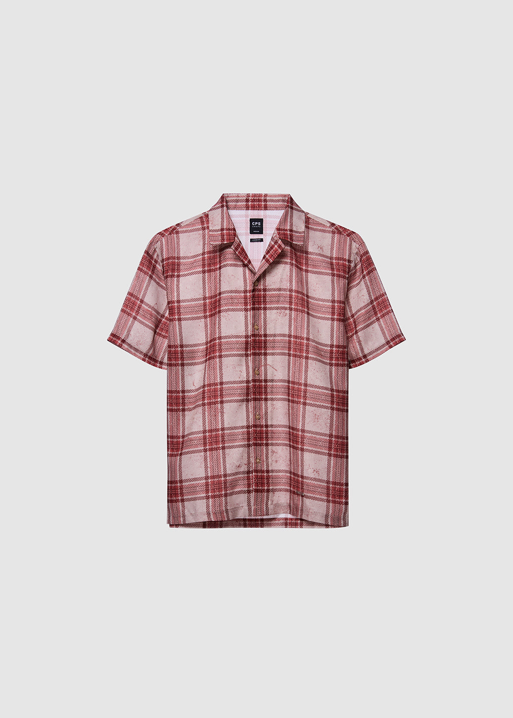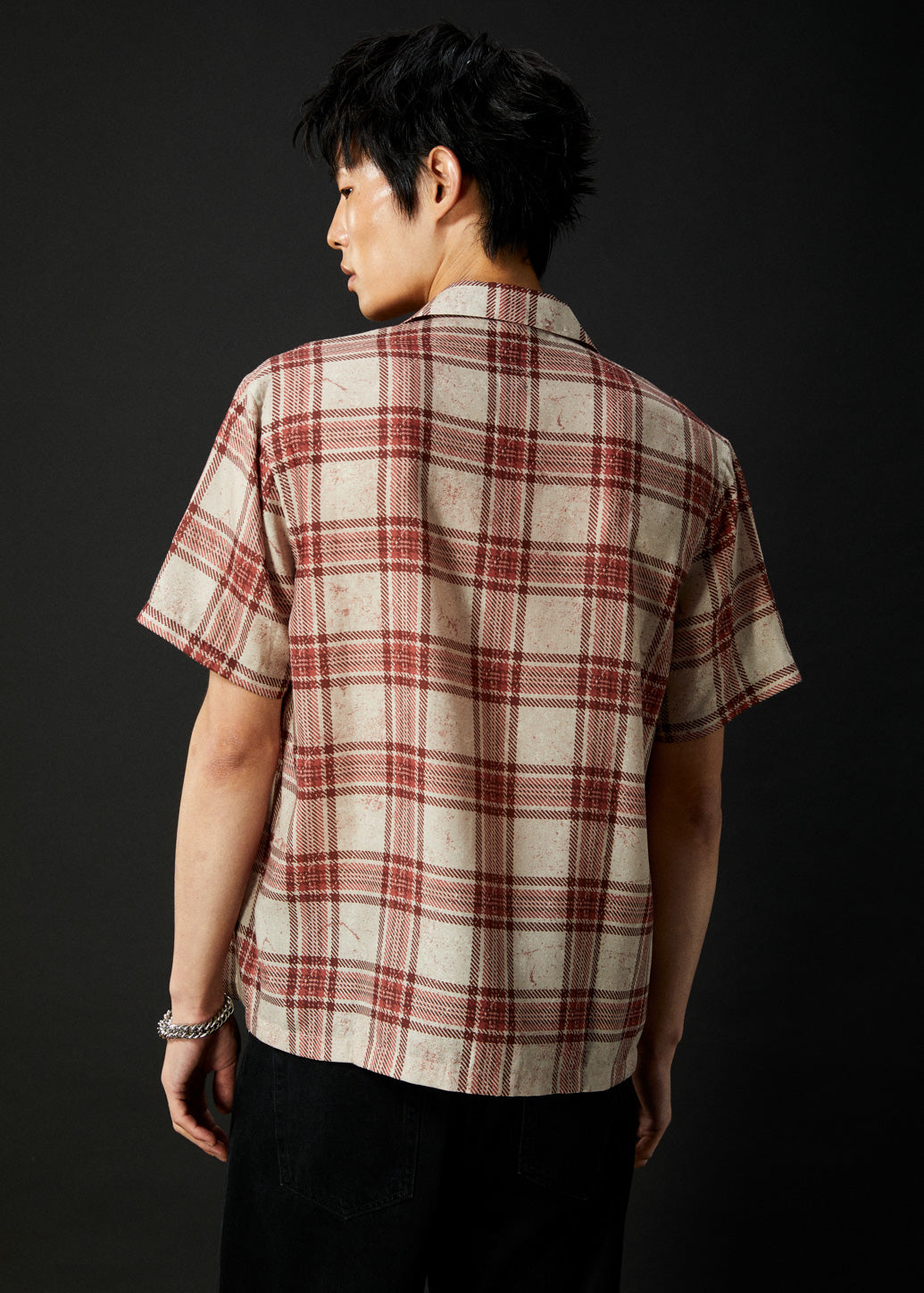 This oversized, short-sleeve check shirt features a confident, cracked, and bleached wash. Style it up with denim or layer it open for a perfect street look or elevated party vibe. It's effortlessly iconic with a red Christmas tone.