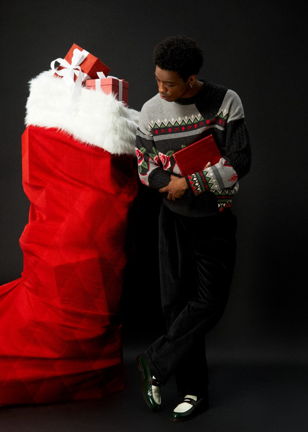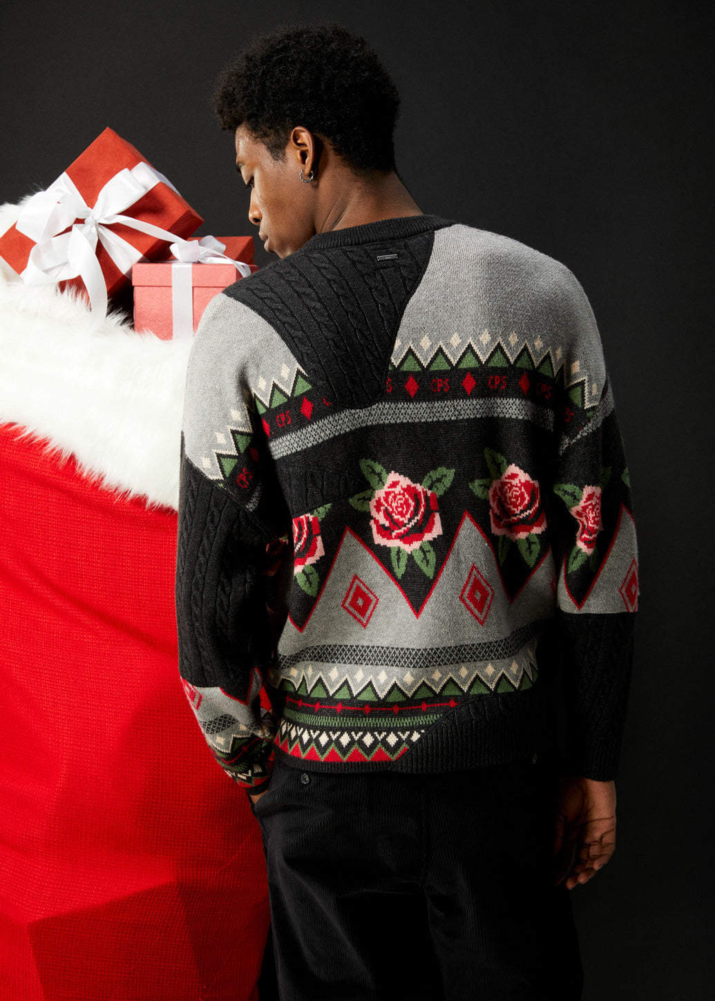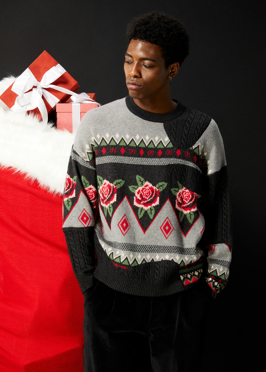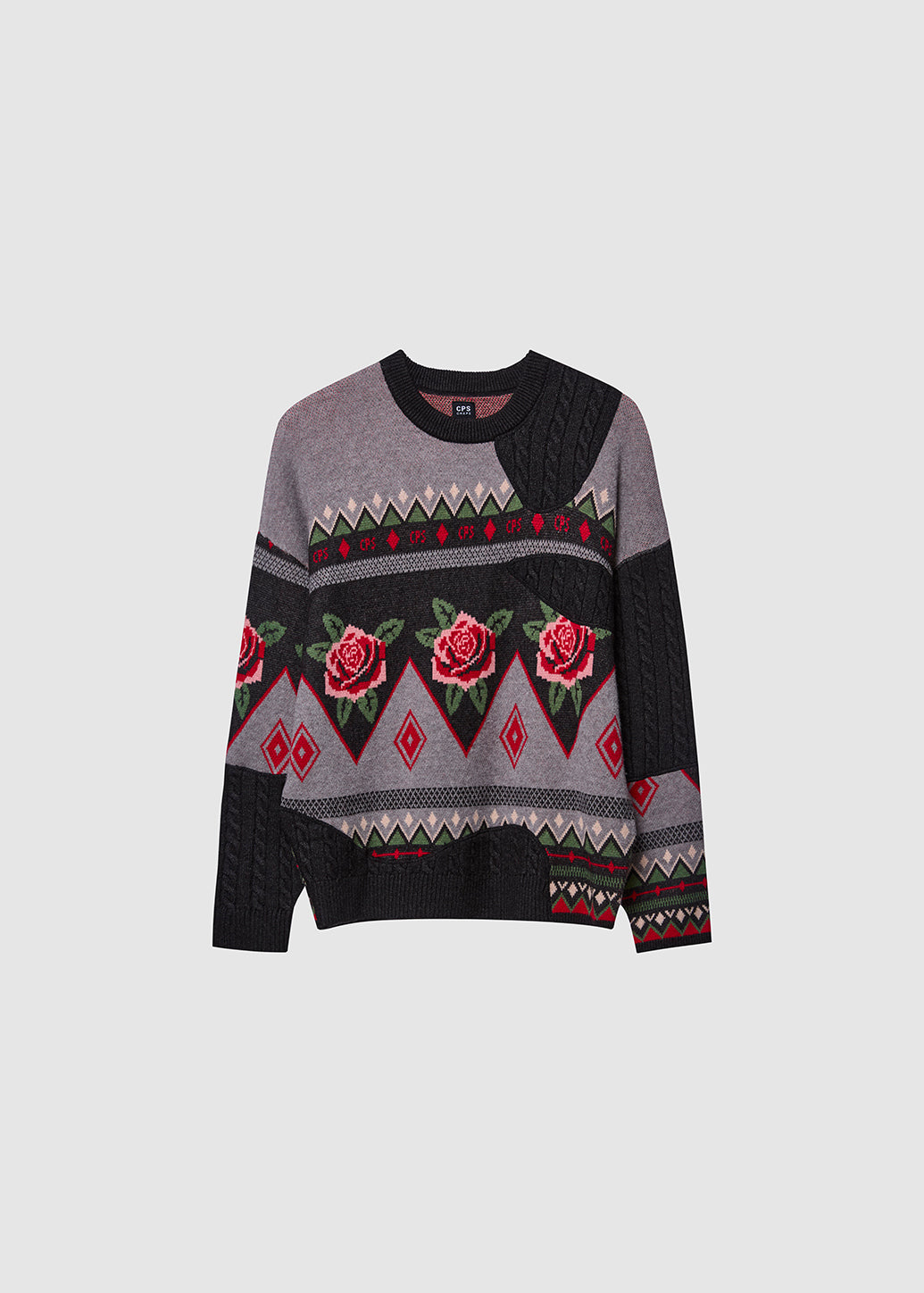 This rose knit sweater makes a bold statement by featuring an unexpected textuted patch detail. It masterfully merges the romantic vibe of the floral pattern with street-style geometric lines to channel the festive Christmas spirit.
