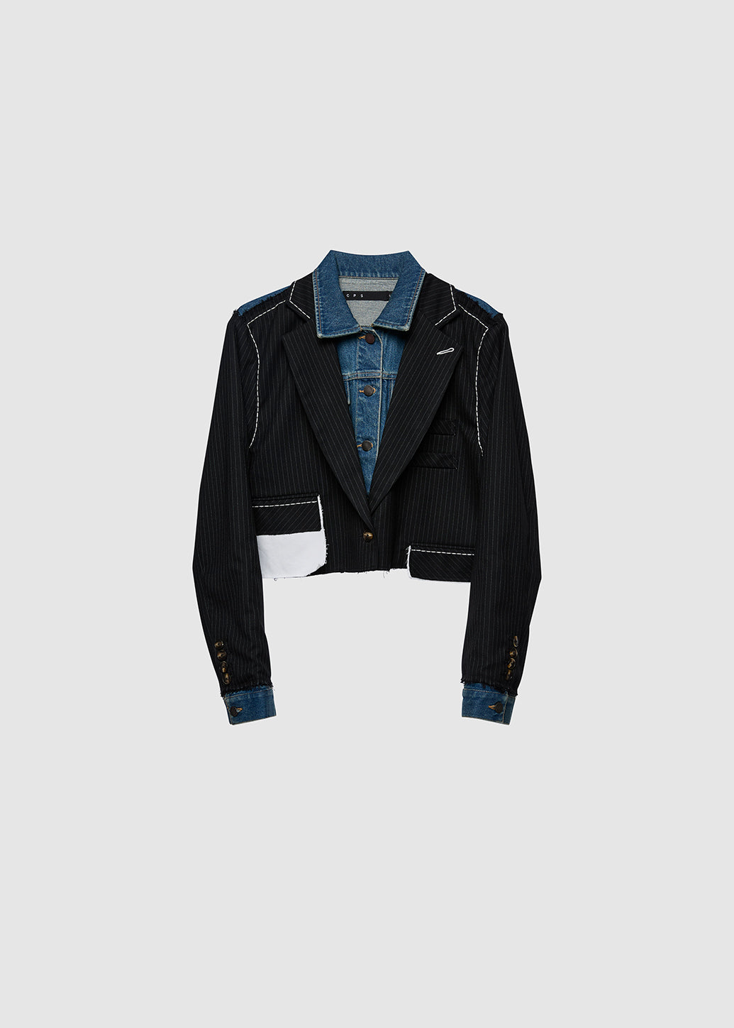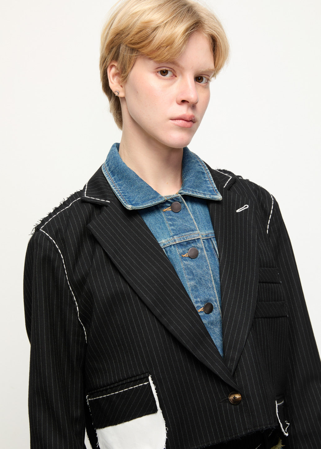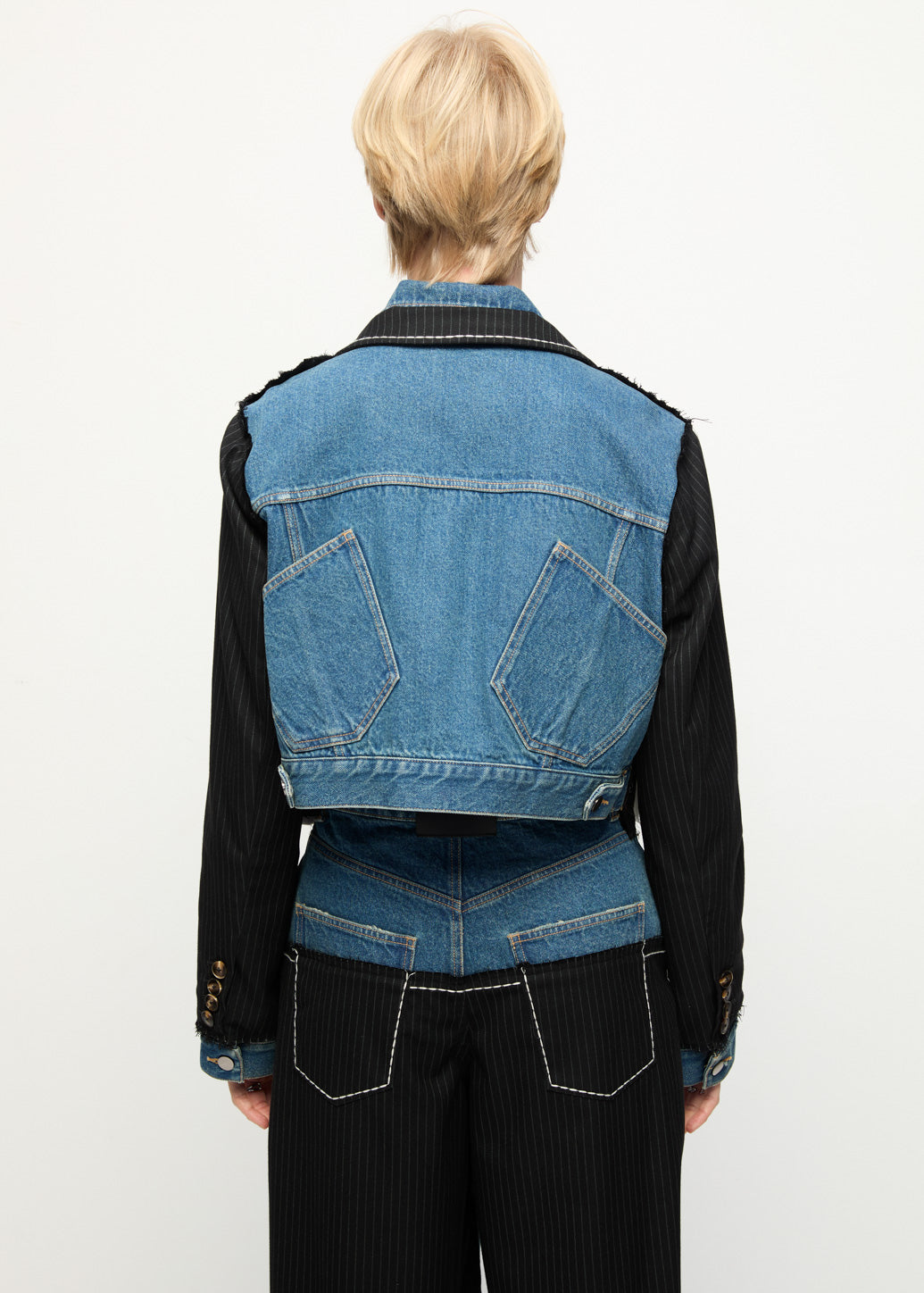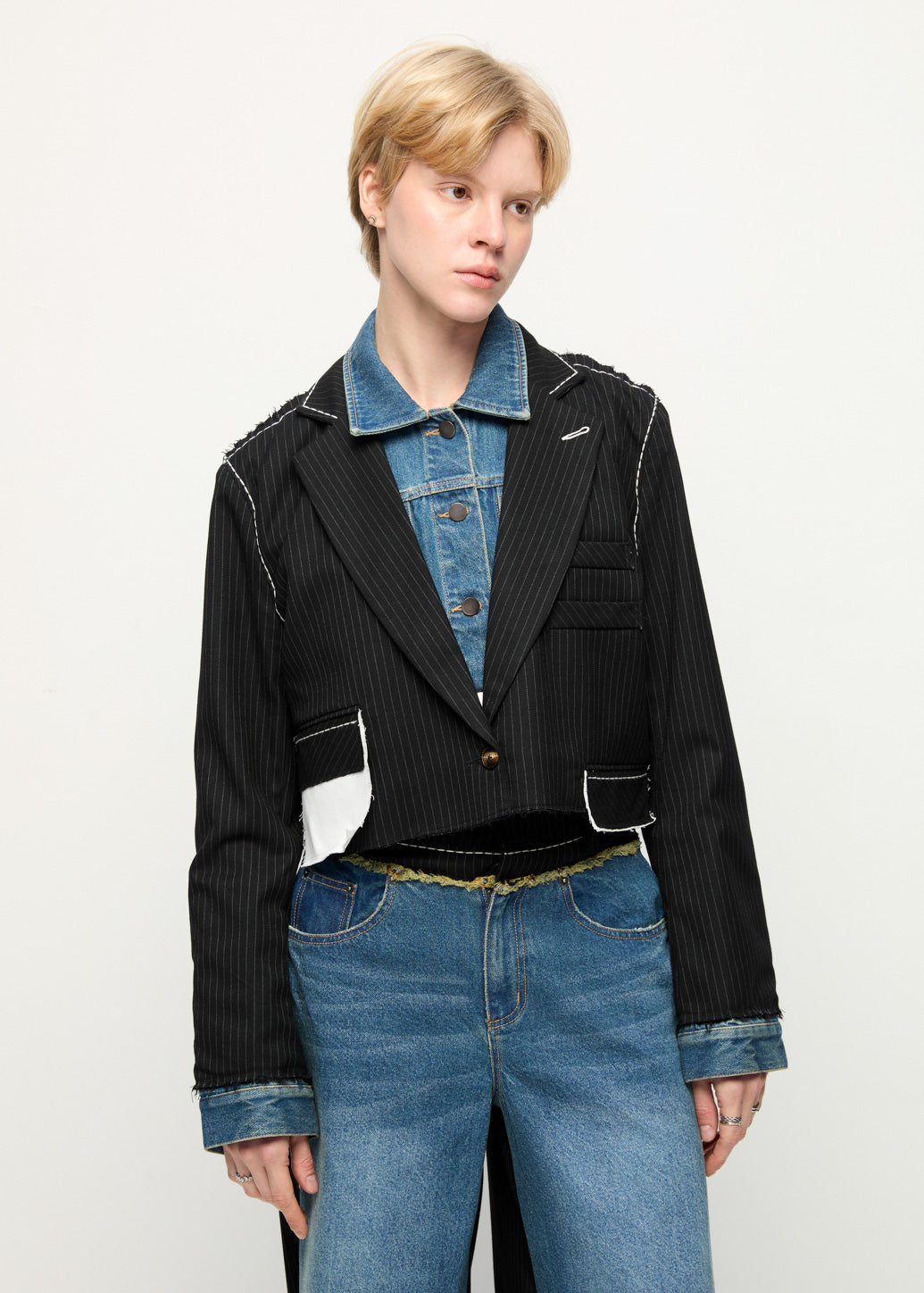 This statement blazer rework classic tailoring by layering structured elements over a denim construction. Cut in an oversized silhouette with a cropped length, it features contrast stitching and raw-edge detailing that add depth and character. The back incorporates a denim jacket panel with patch pockets, creating a distinctive, deconstructed look. This piece is ideal for elevating everyday outerwear with a bold, modern edge.