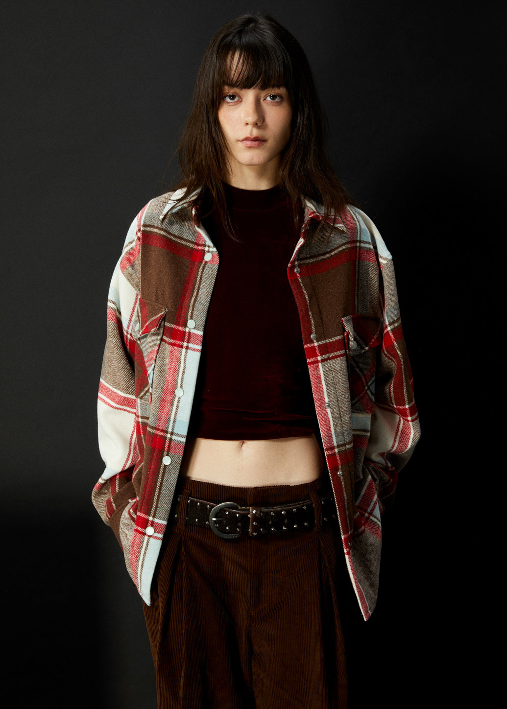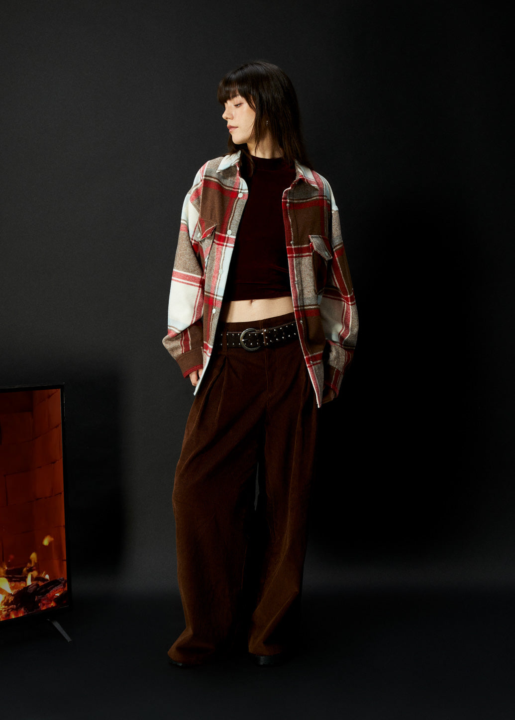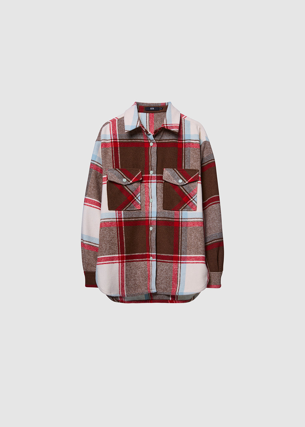 Oversized checkered jacket in white, red, and brown tones, evoking a warm Christmas vibe. Designed with double front flap pockets for a stylish touch—perfect for layering and elevating your winter look with effortless cool.
