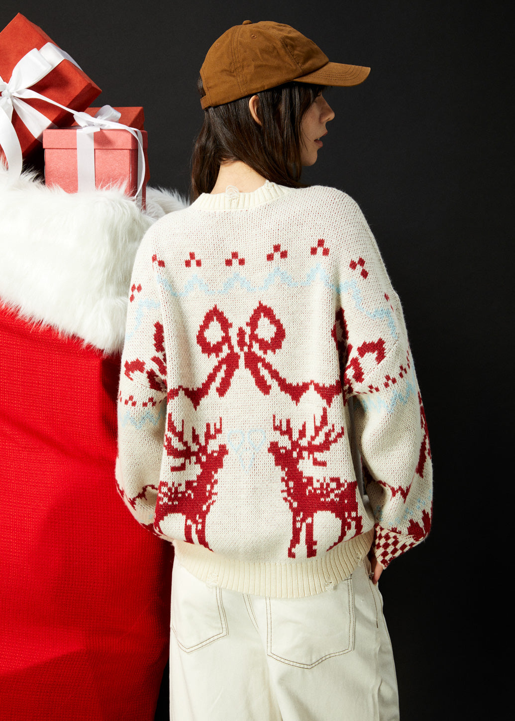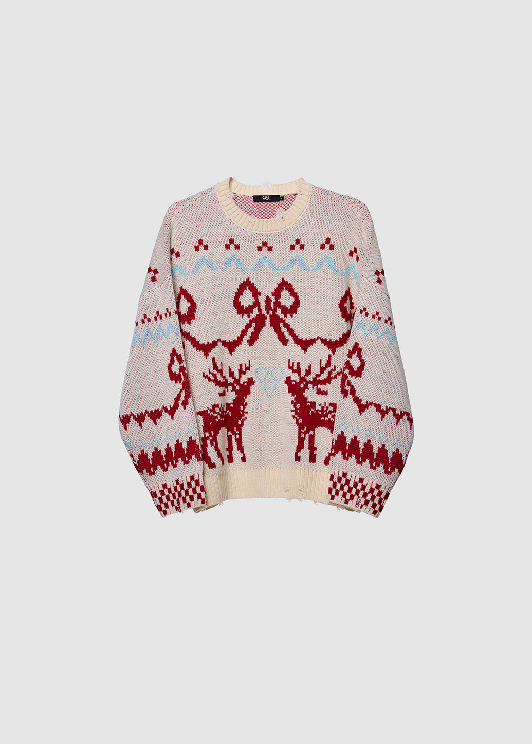 Experience a festive touch to your look with this sweater featuring reindeer and red bow patterns that capture the Christmas spirit. Designed with a raw-cut hem for an edgy vibe, bringing warmth and signature CPS style to the season.