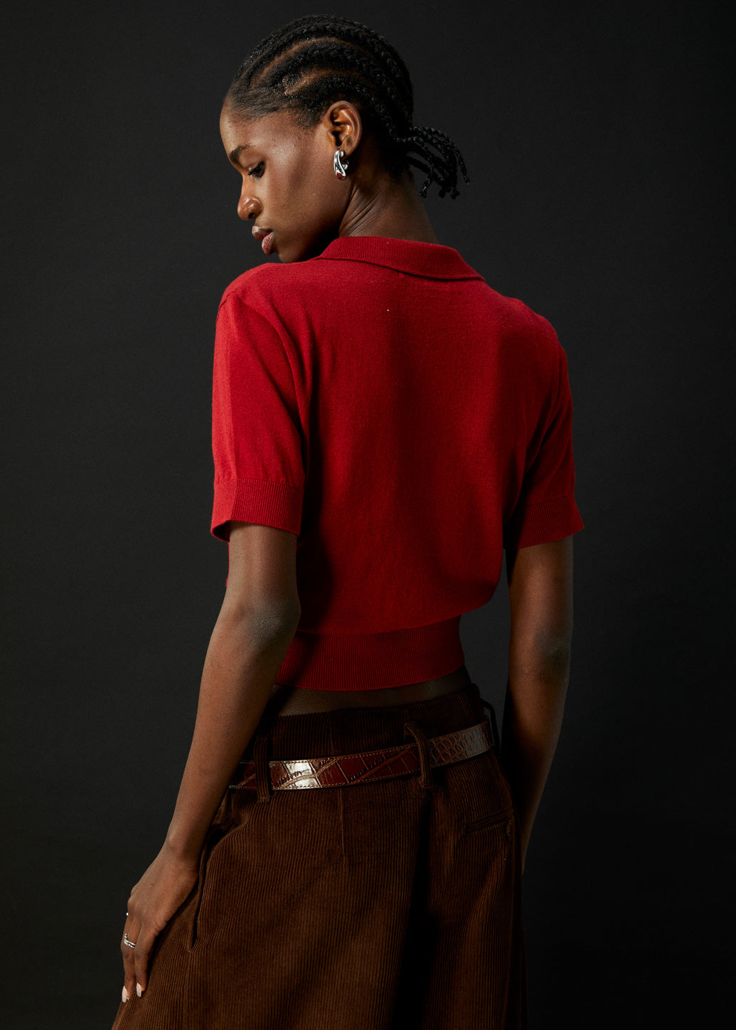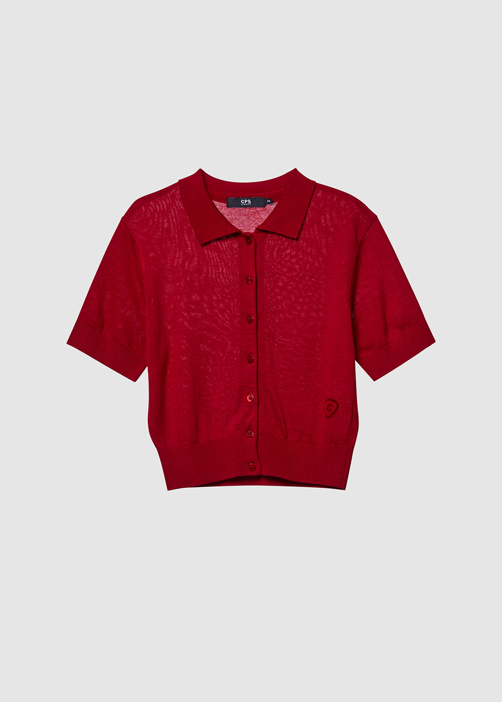 Red short-sleeve polo shirt featuring a full button-down front and a velvet-printed guitar pick logo near the hem. A perfect blend of classic and edgy, it captures the unique signature style of CPS.