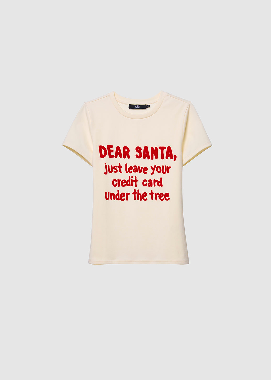 A regular-fit short-sleeve T-shirt that adds a playful touch to the festive season, featuring the red graphic text 'Dear Santa, just leave your credit card under the tree.' Witty yet stylish, it perfectly captures the Christmas spirit and is sure to bring smiles to every party.