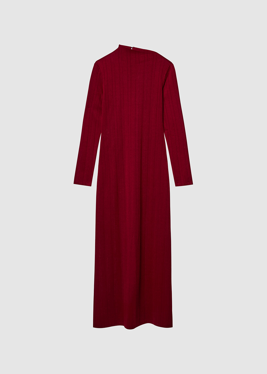 Textured long-sleeve woven dress in a rich red tone, exuding luxury and depth—perfect for the Christmas season. Featuring a standout asymmetrical mock neck, this winter piece transitions effortlessly from office wear to chic party looks.
