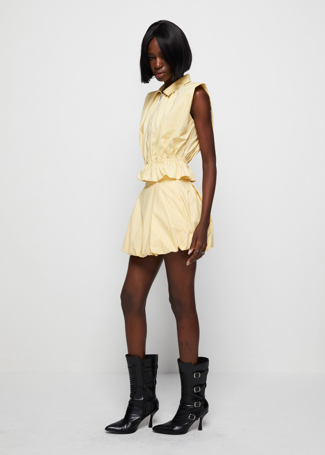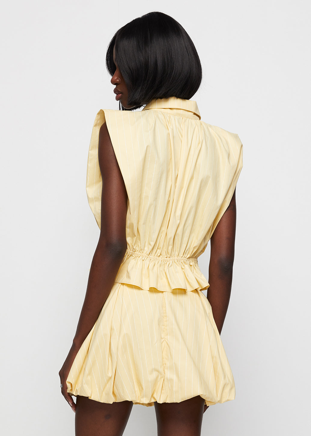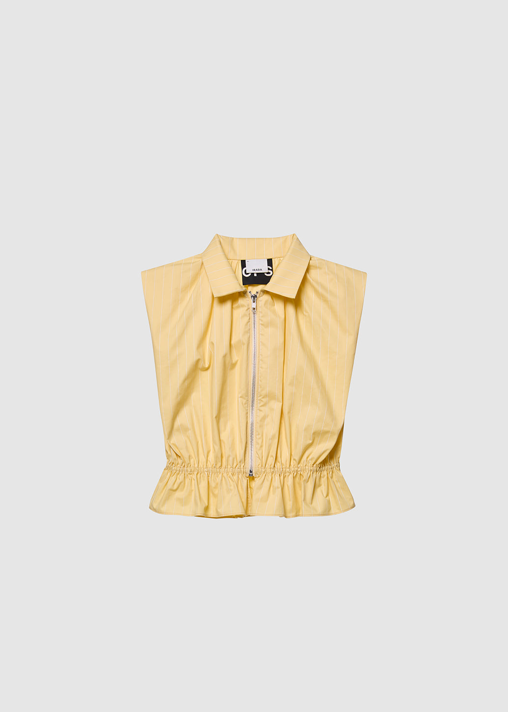 Sleeveless striped blouse featuring a ruffle hem and padded shoulders for a refined silhouette. Designed in an oversized fit with a full-length front zipper and smocked waist for added shape in a soft butter-yellow hue. This piece from the exclusive CPS x IRADA collaboration blends modern femininity with effortless chic appeal.