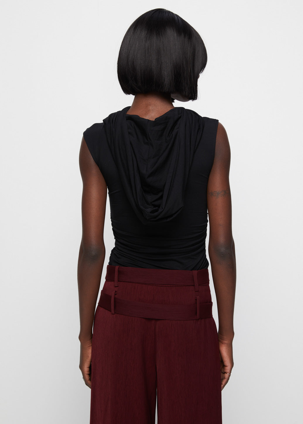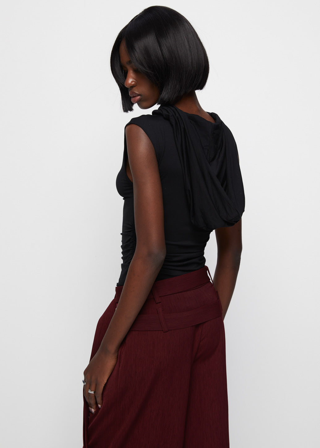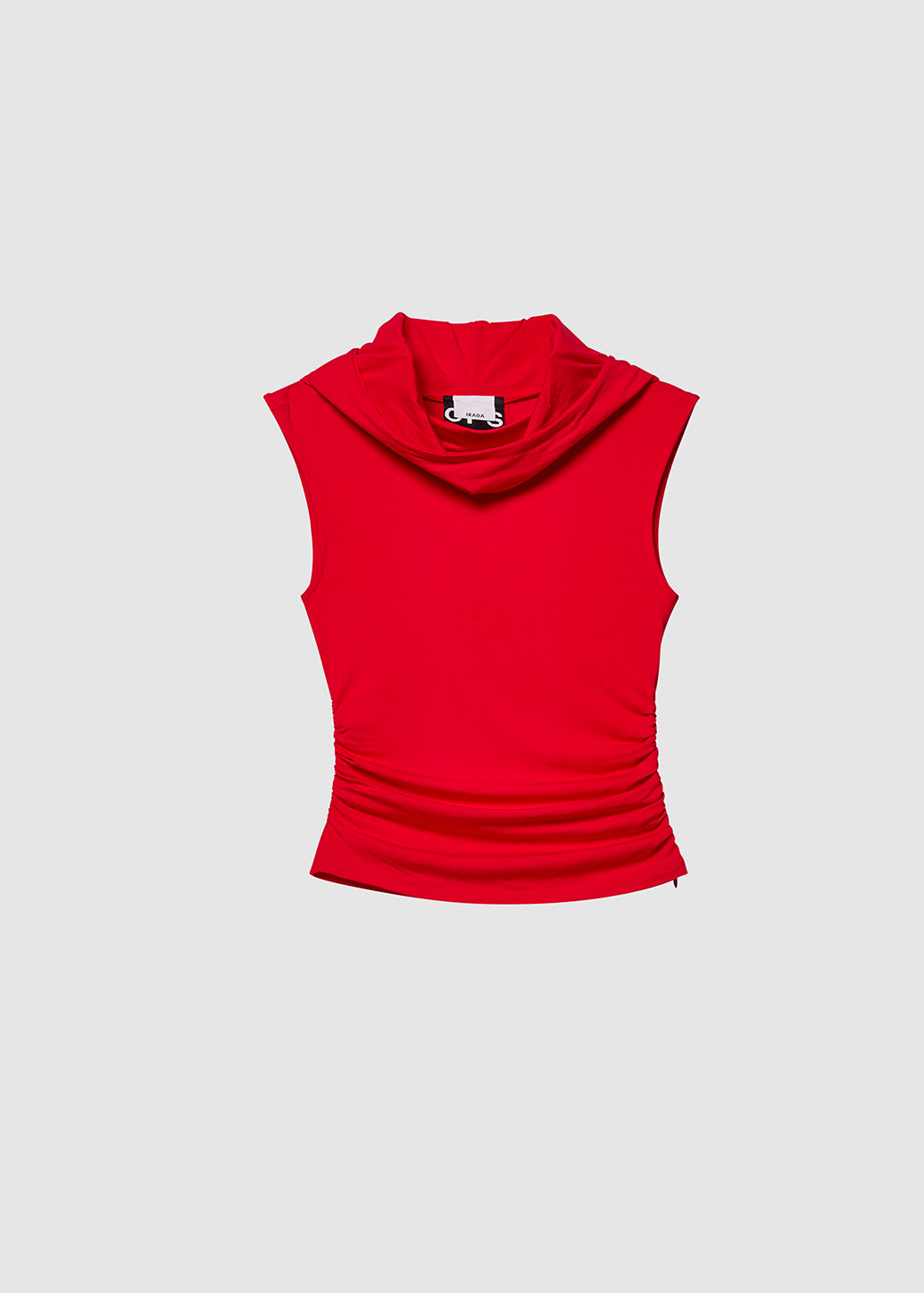 A cap sleeve hoodie with a chic draped design from the special with the IRADA collaboration. Blending femininity with an edgy touch, this minimal yet refined piece pairs effortlessly with jeans or your favorite trousers to create a casual look that turns heads with effortless style.
