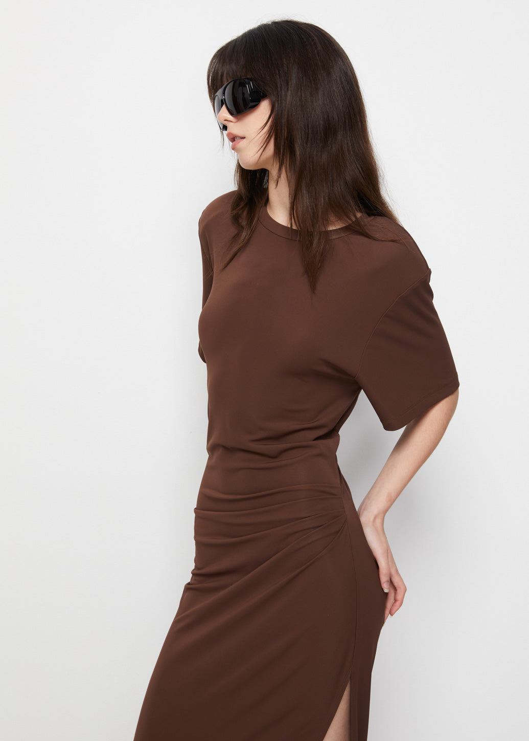 Maxi dress with short sleeves and a high side slit, enhanced with feminine side drapes at the waist. Available in two classic tones from the exclusive CPS x IRADA collaboration, this minimal piece adds a modern touch while maintaining an effortlessly chic feel in every wear.