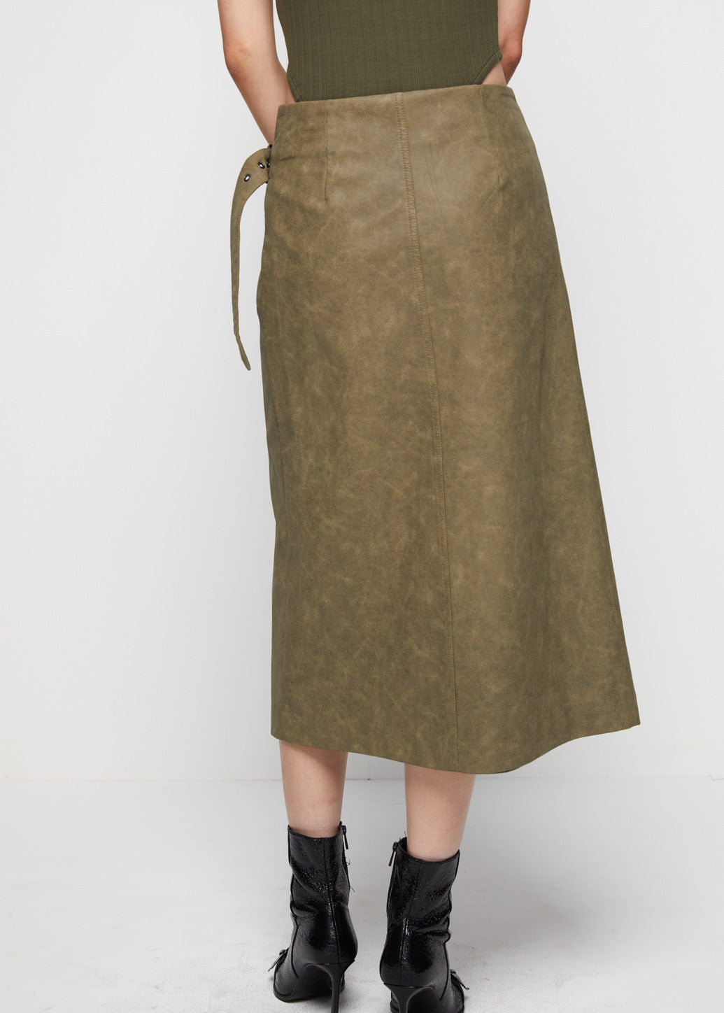 Green wrap faux leather skirt with an adjustable side belt—this is the minimal CPS x IRADA collaboration. The military-green tone adds a modern edge to a feminine look, making it a statement of style for a variety of chic, versatile outfits.
