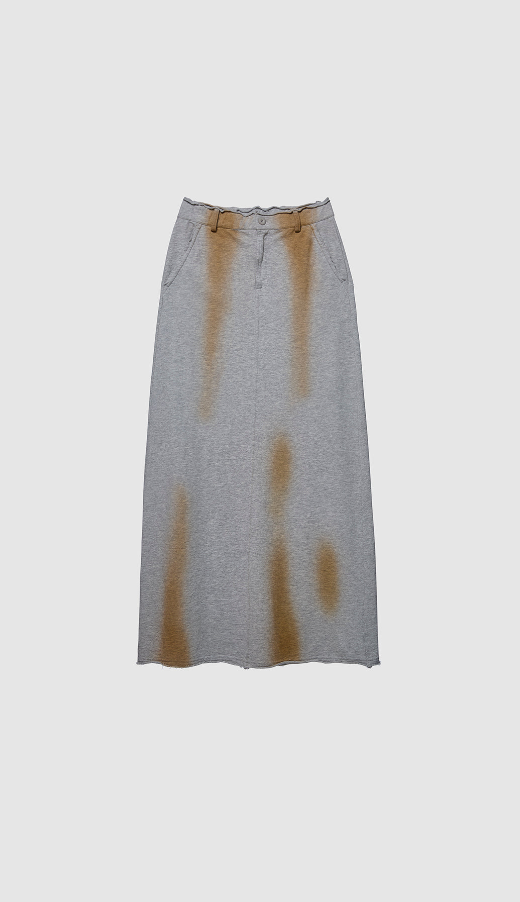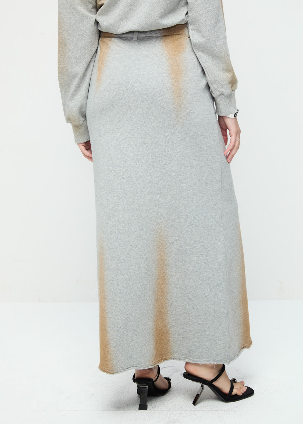 A-line midi skirt crafted from top-dye grey terry fabric, enhanced with a distressed spray-paint effect for an edgy, street-style vibe. Features a front zip with button closure and pairs perfectly with a matching long-sleeve top to create a standout festival look.