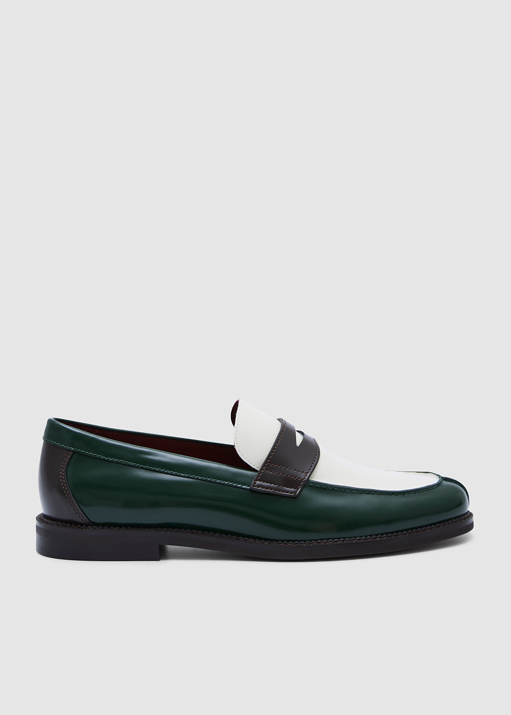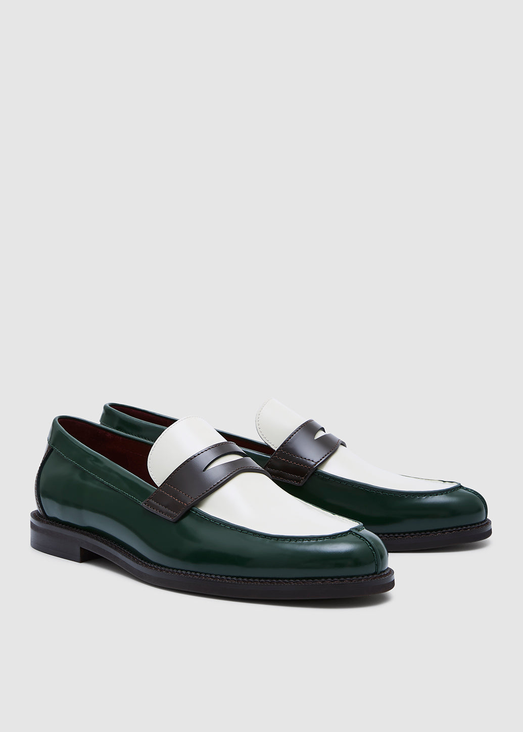 Leather loafers with a modern twist featuring a sleek black-and-white color-block design and polished gold-tone hardware on top. The smooth leather finish adds a refined touch, while the bold details elevate your outfit with standout style and confident steps.