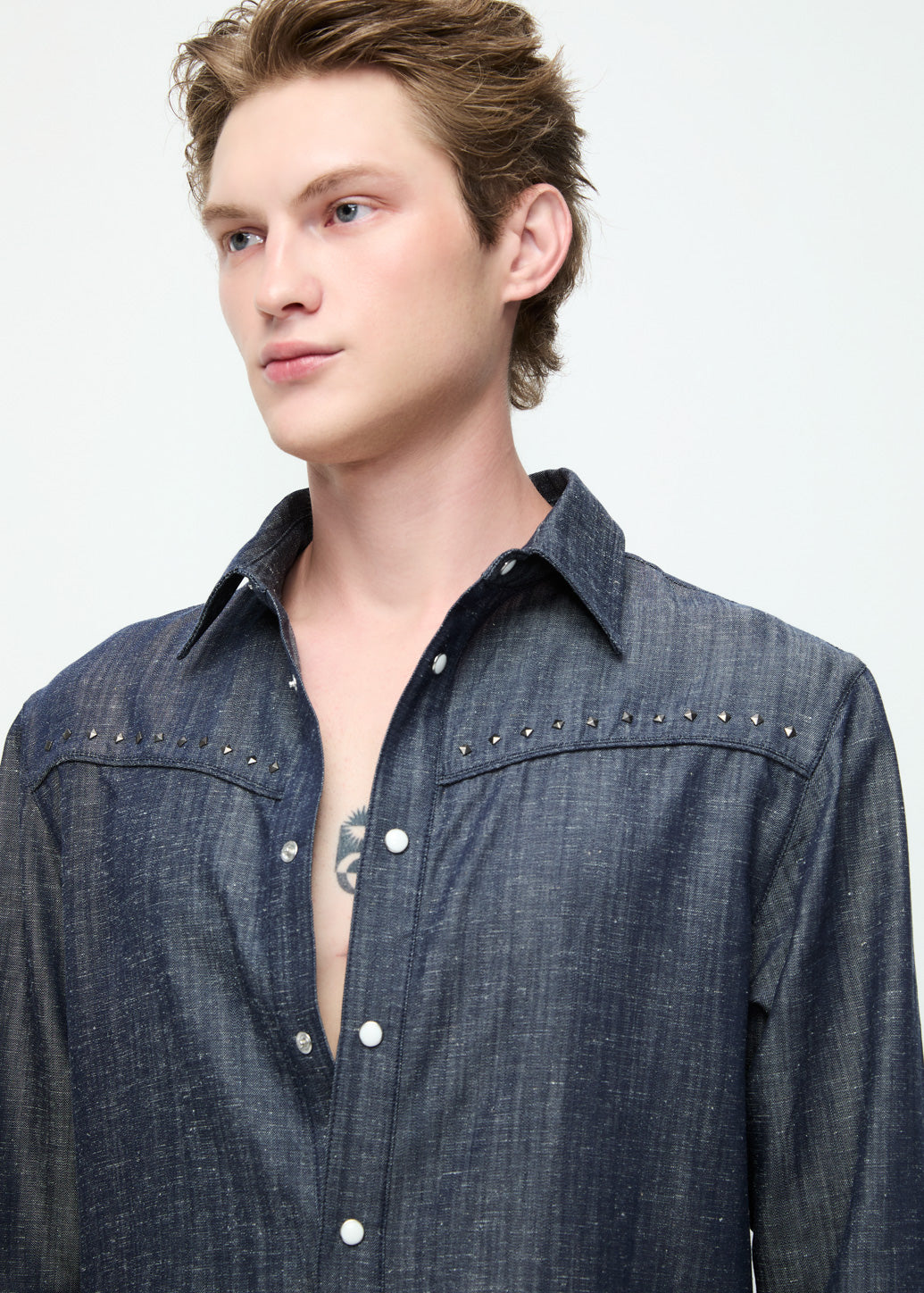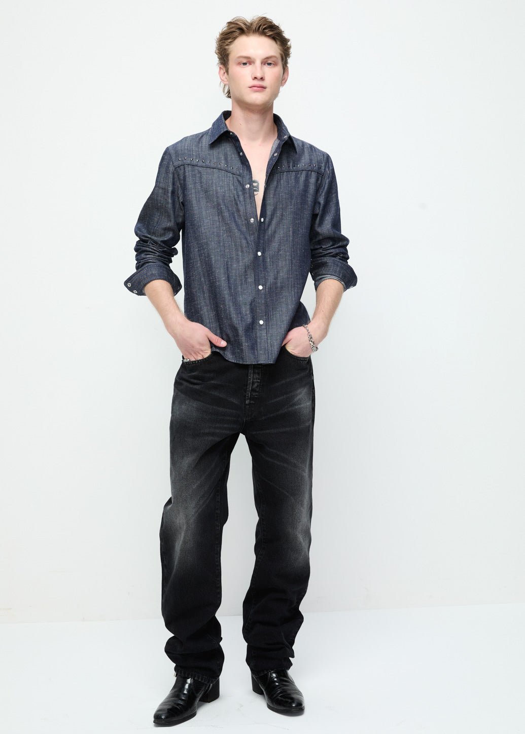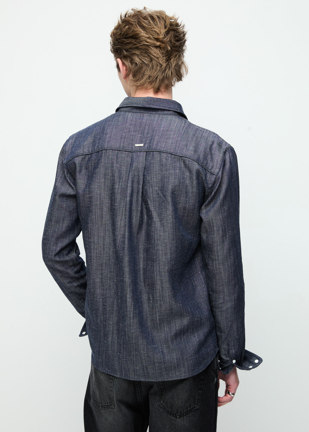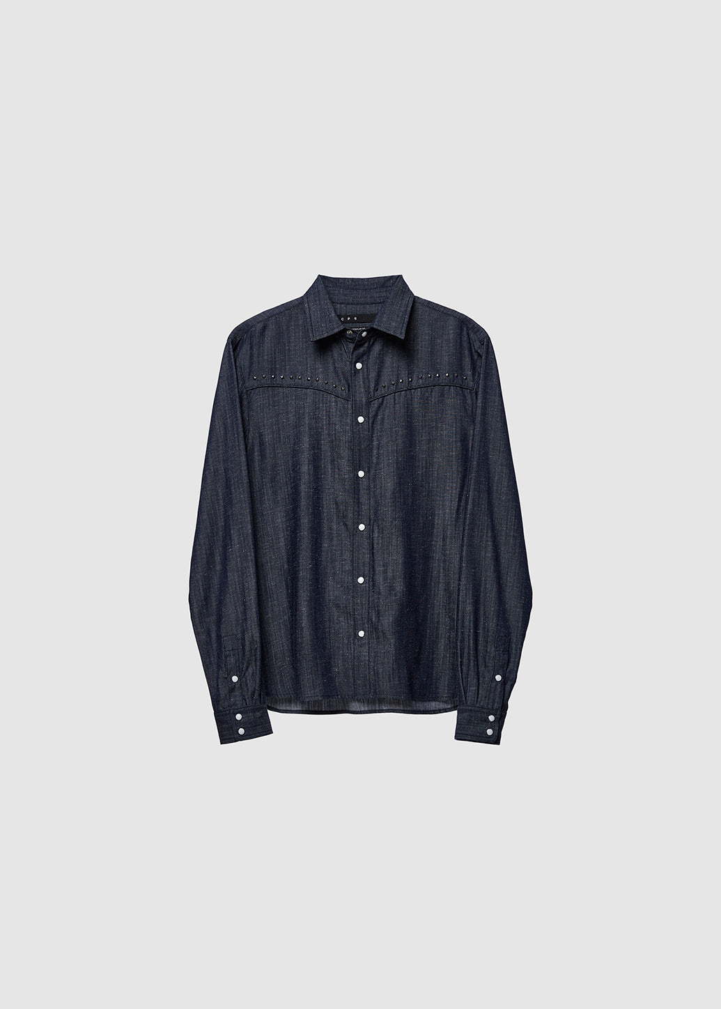 This long-sleeve shirt features a tailored fit crafted from sleek twill fabric, offering a refined yet edgy appeal. Detailed with silver-tone hardware—including silver buttons and studs along the upper yoke—it combines classic with a modern attitude. The deep navy hue adds a timeless touch and exudes confidence casual look.