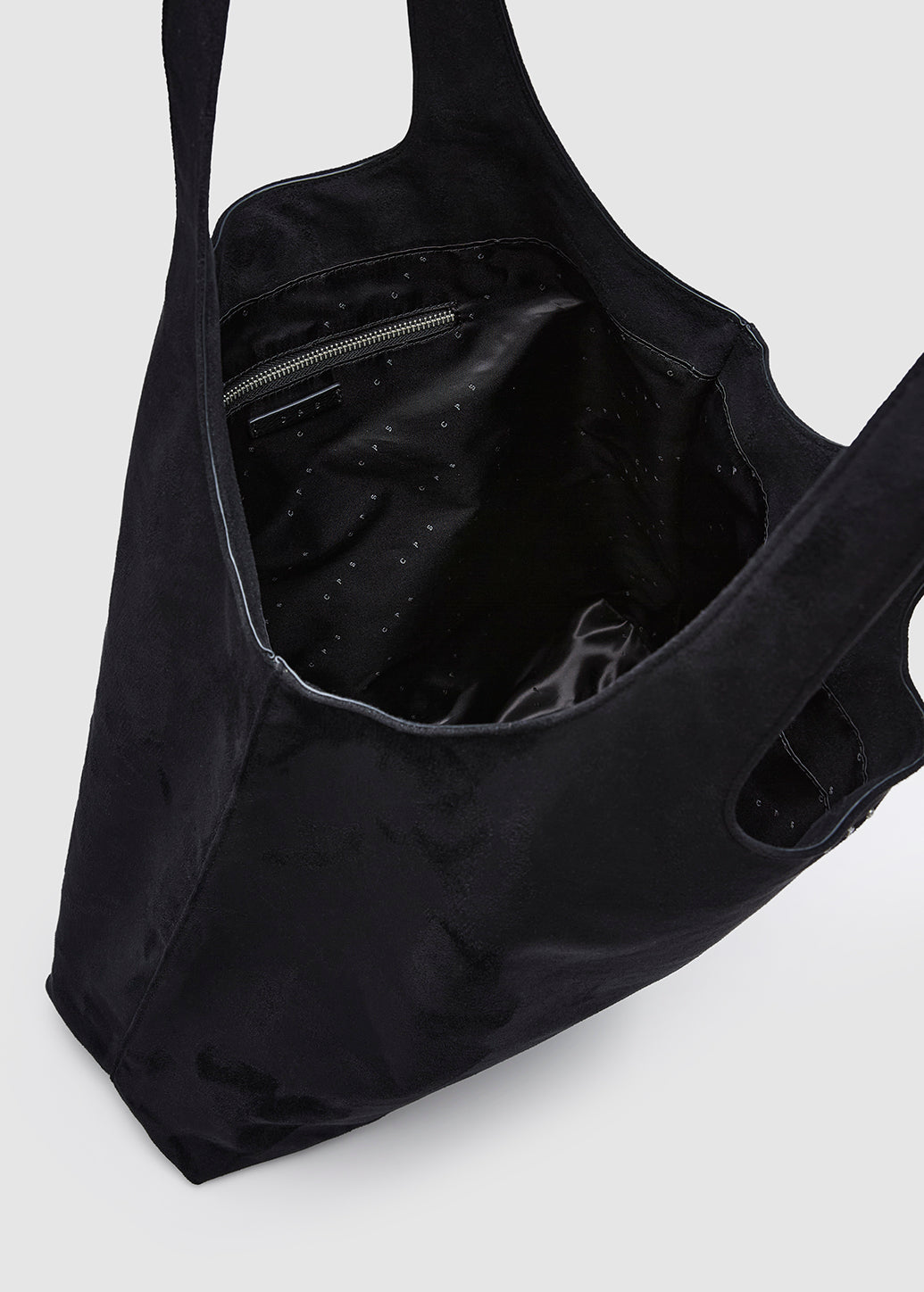 A tall black tote bag designed perfectly for everyday functionality. Made from lightweight polyester, it is durable and easy to maintain. The design emphasizes minimalism with a small logo, allowing it to complement a variety of styles.