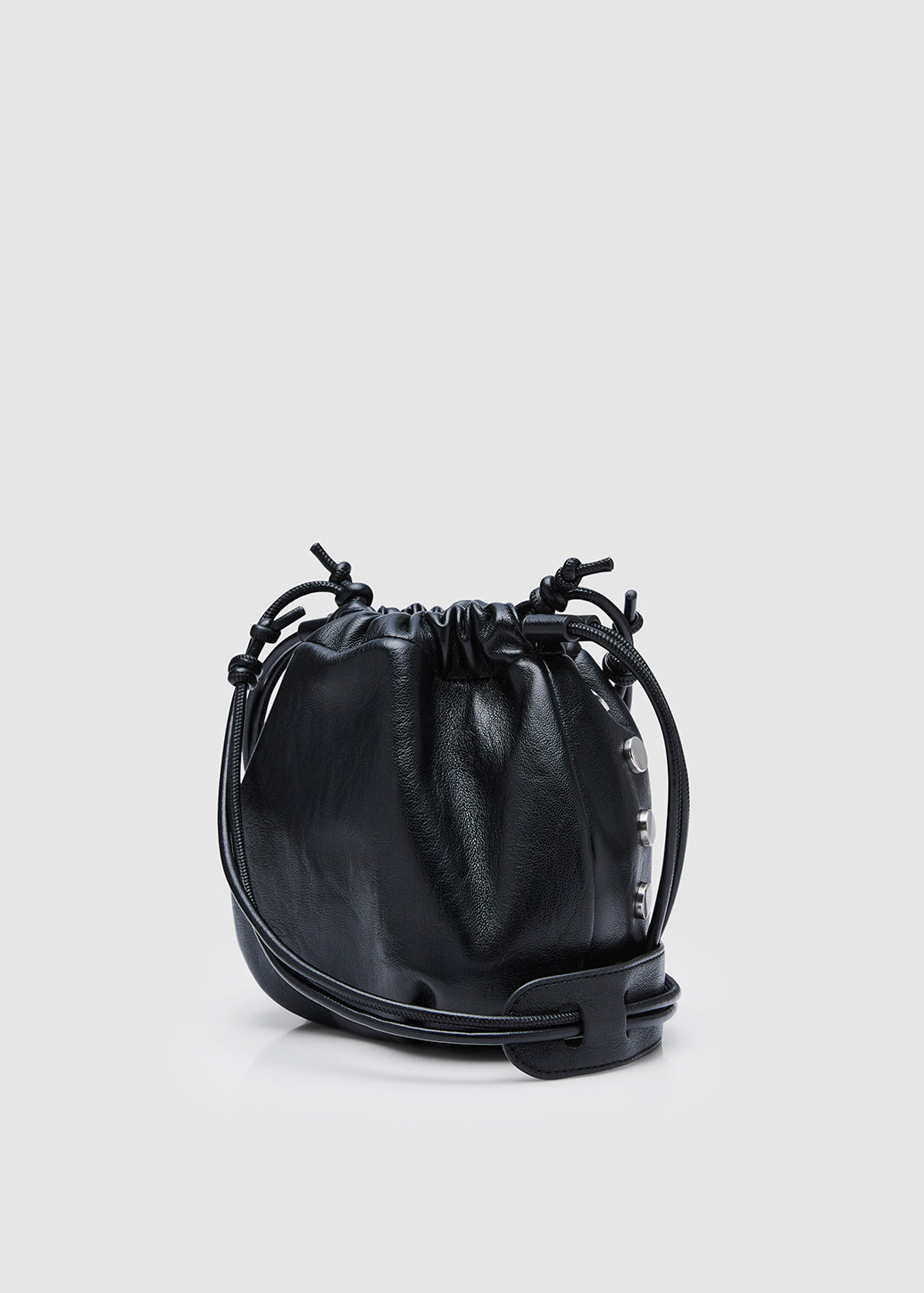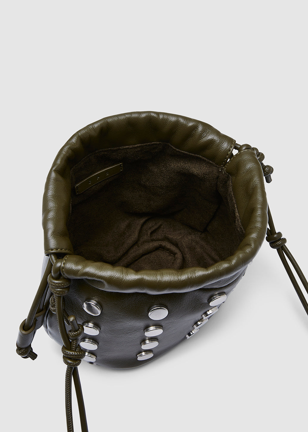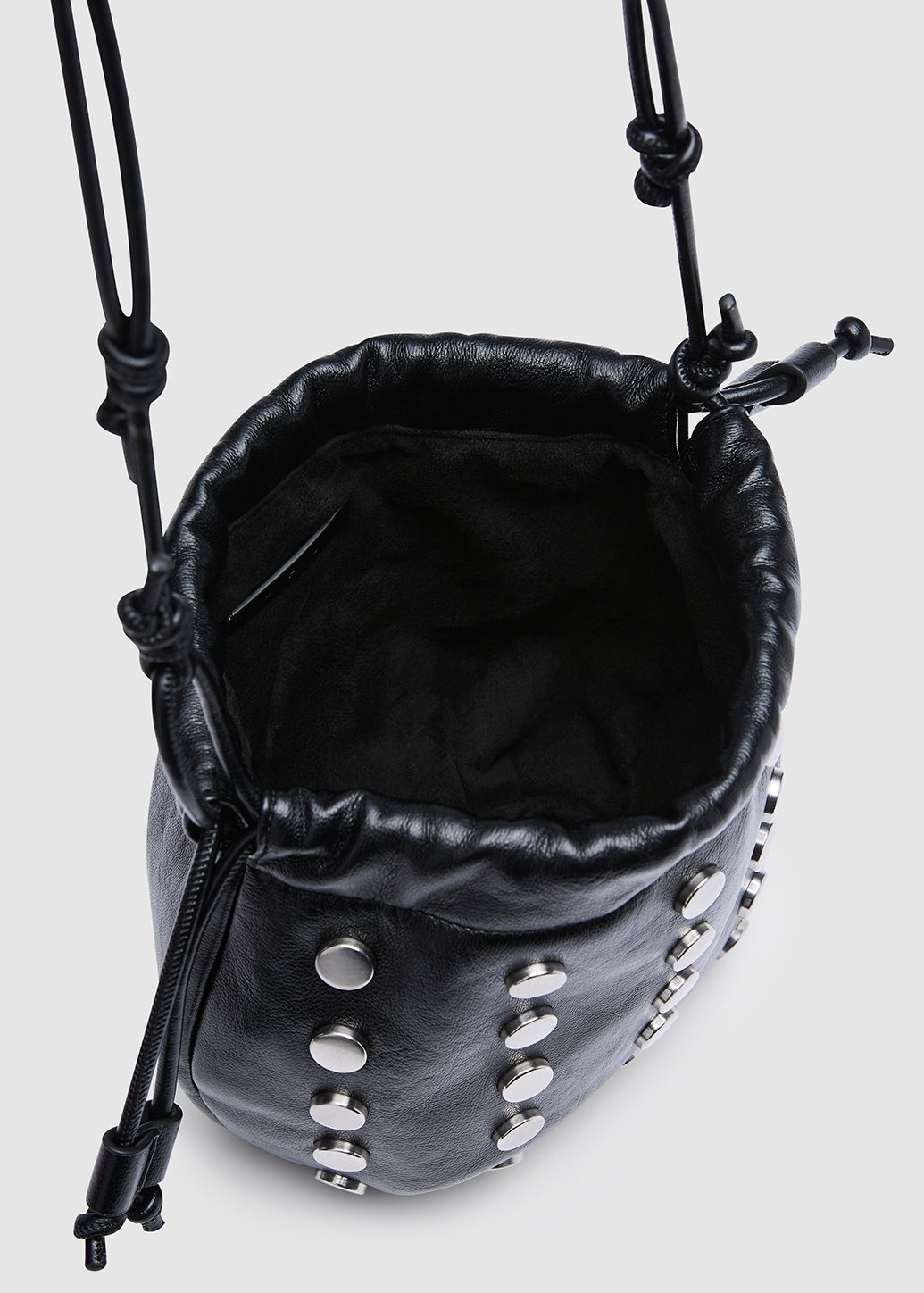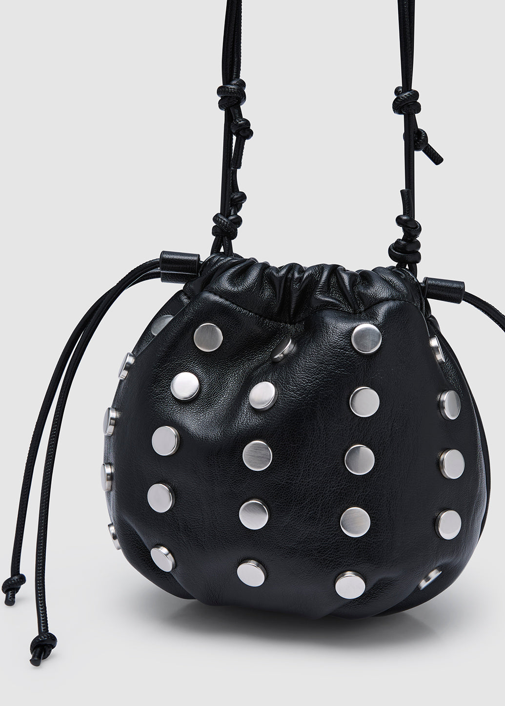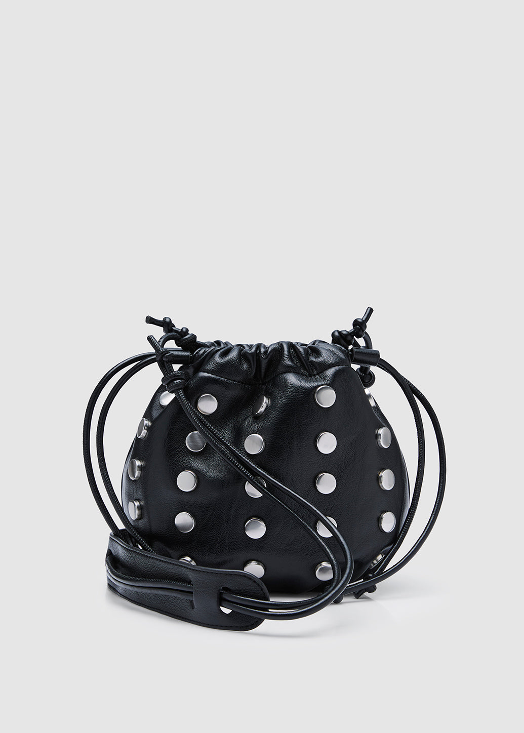 A bucket bag made from PU suede leather. The body is boldly decorated with scattered silver-toned metal studs across the body, giving it an edgy look. It features a practical drawstring closure at the top. The perfect statement accessory for adding a rock-chic flair in every color.
