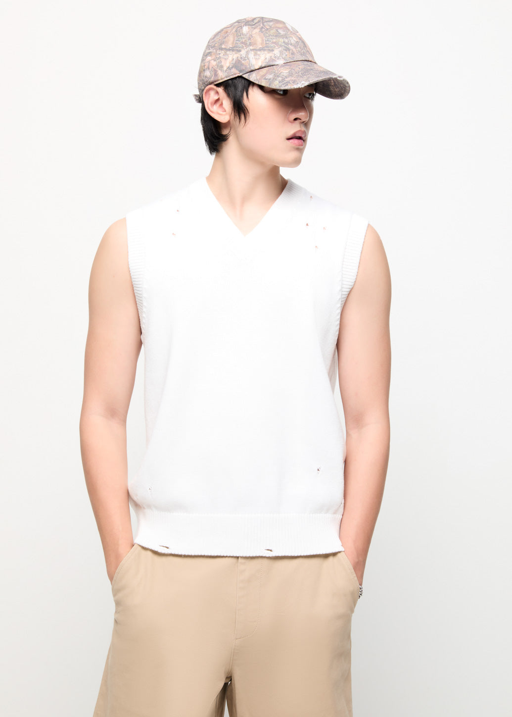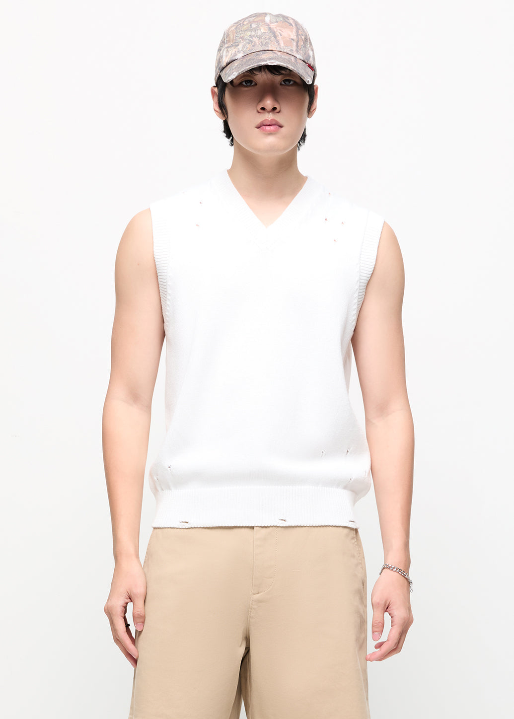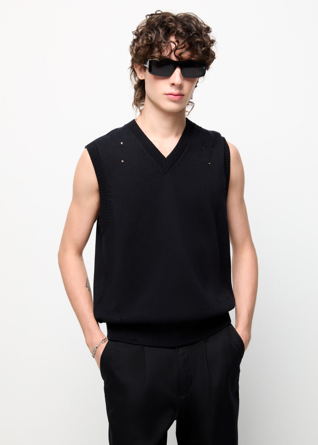 A knitted vest that stands out with its modern function and style. The smart design incorporates a rugged, cool element with a patterned distressed structure. Choose to wear it without a base layer or layer it over a shirt or t-shirt. It is suitable for building layered outfits for any ensemble.