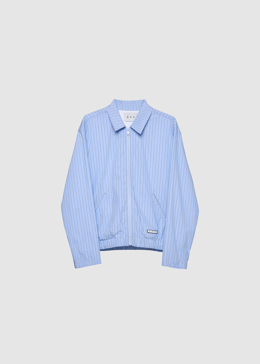 Blue and white vertical striped jacket that blends classic elegance with modern simplicity. Designed with a full-length zipper, allowing versatile styling options. A key piece that elevates casual looks with a refined Modern Classic attitude.