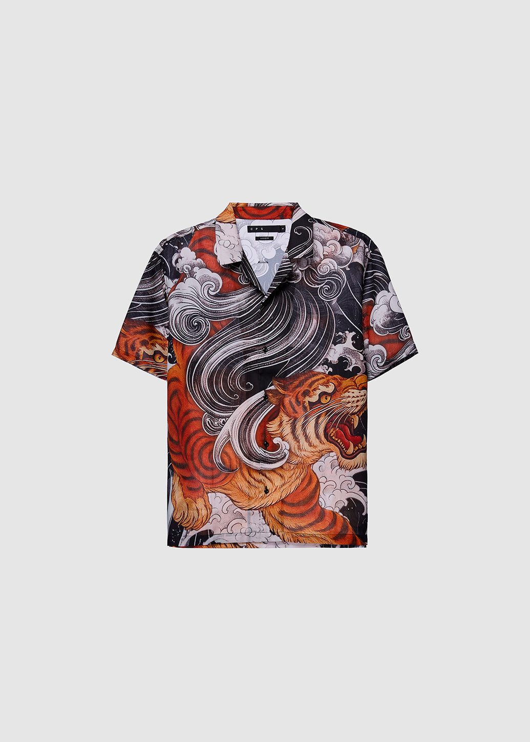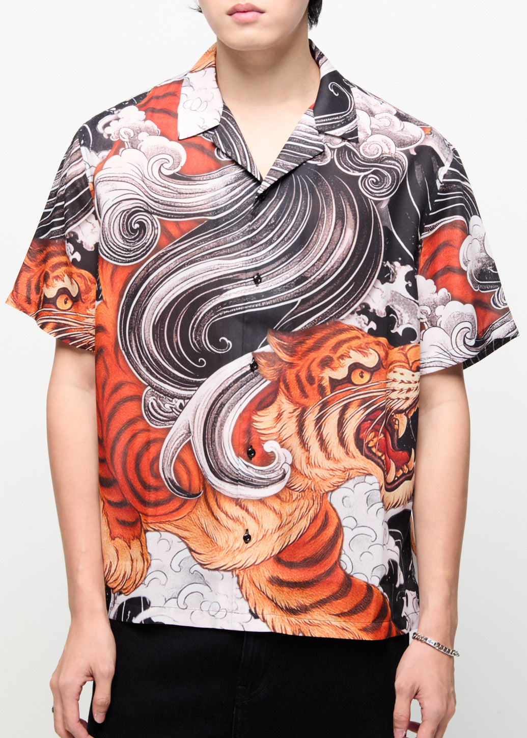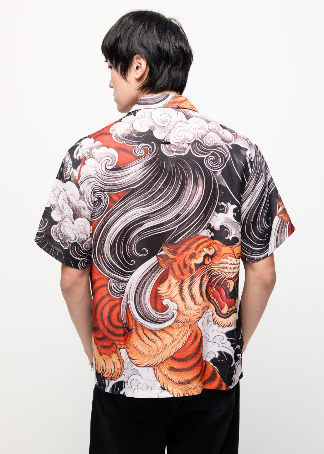 A short-sleeve shirt features a powerful graphic print to celebrate the Chinese New Year. Highlighted by a bold golden-yellow tiger motif that represents good fortune and strength. Comfortable to wear and perfect for festive looks that call for standout style.