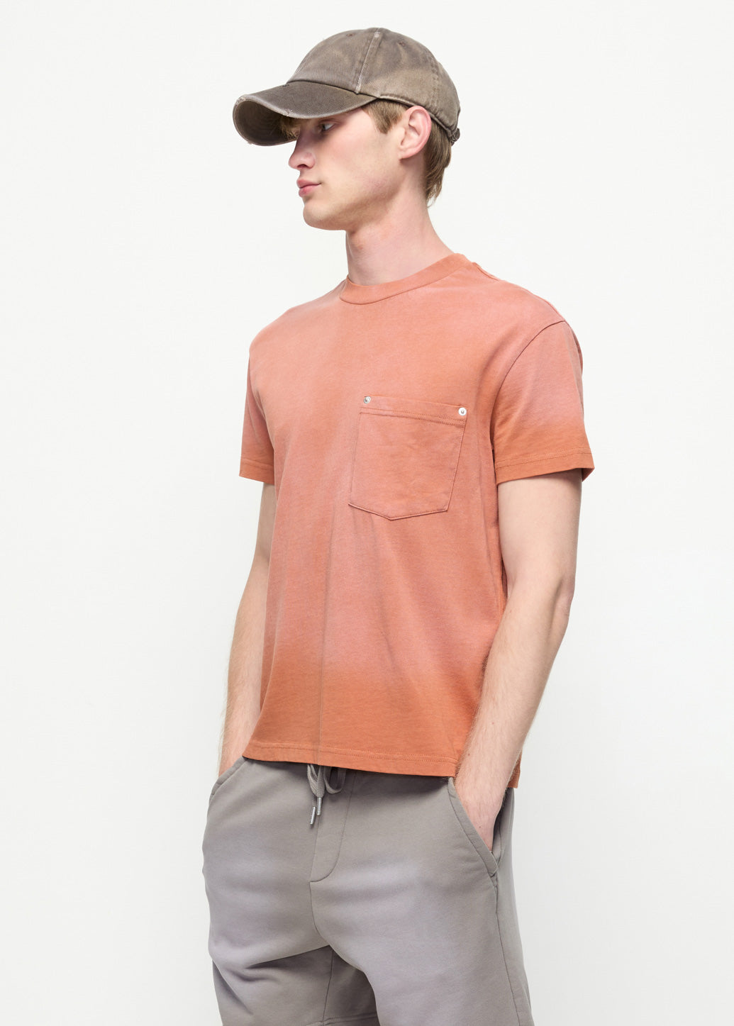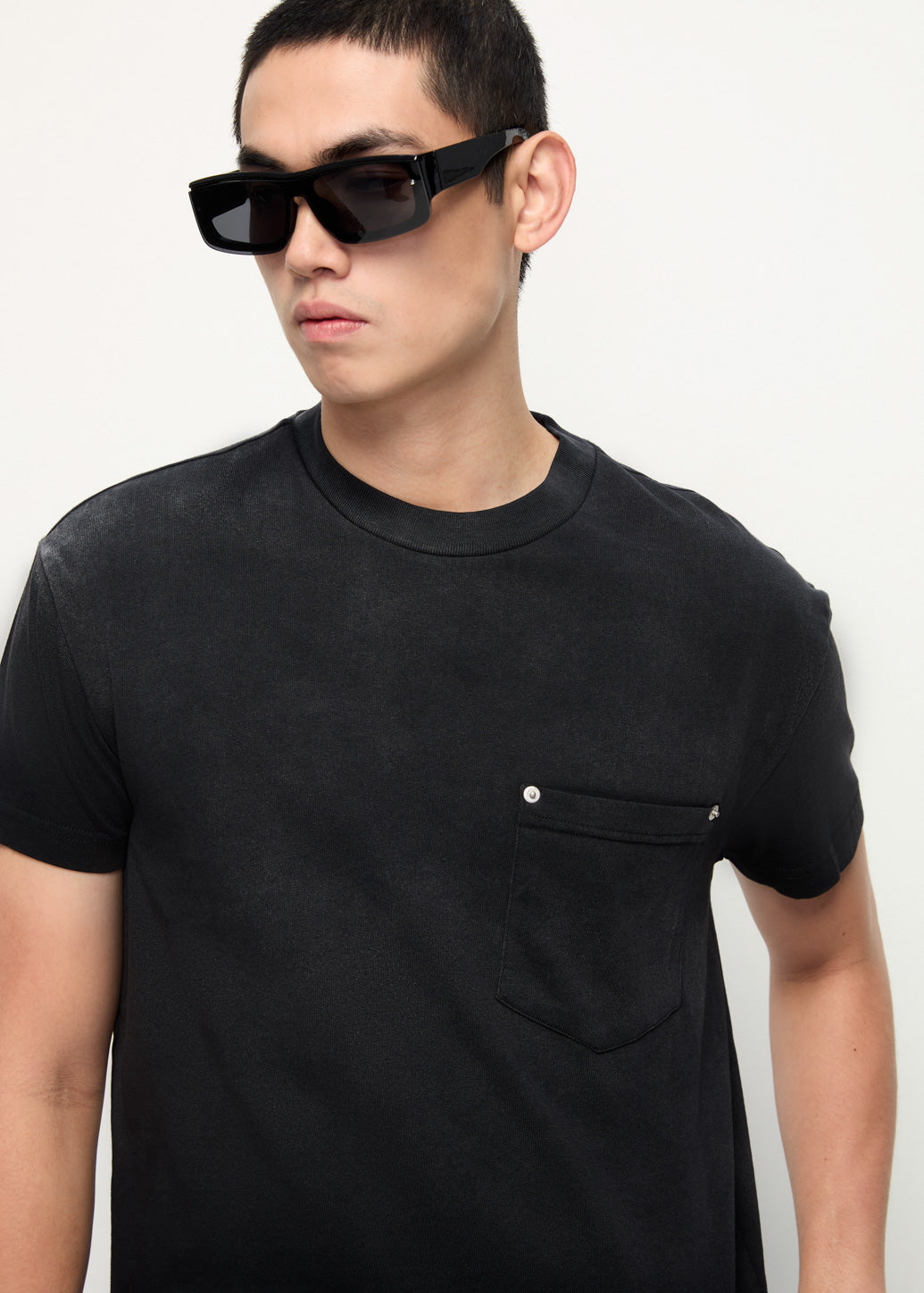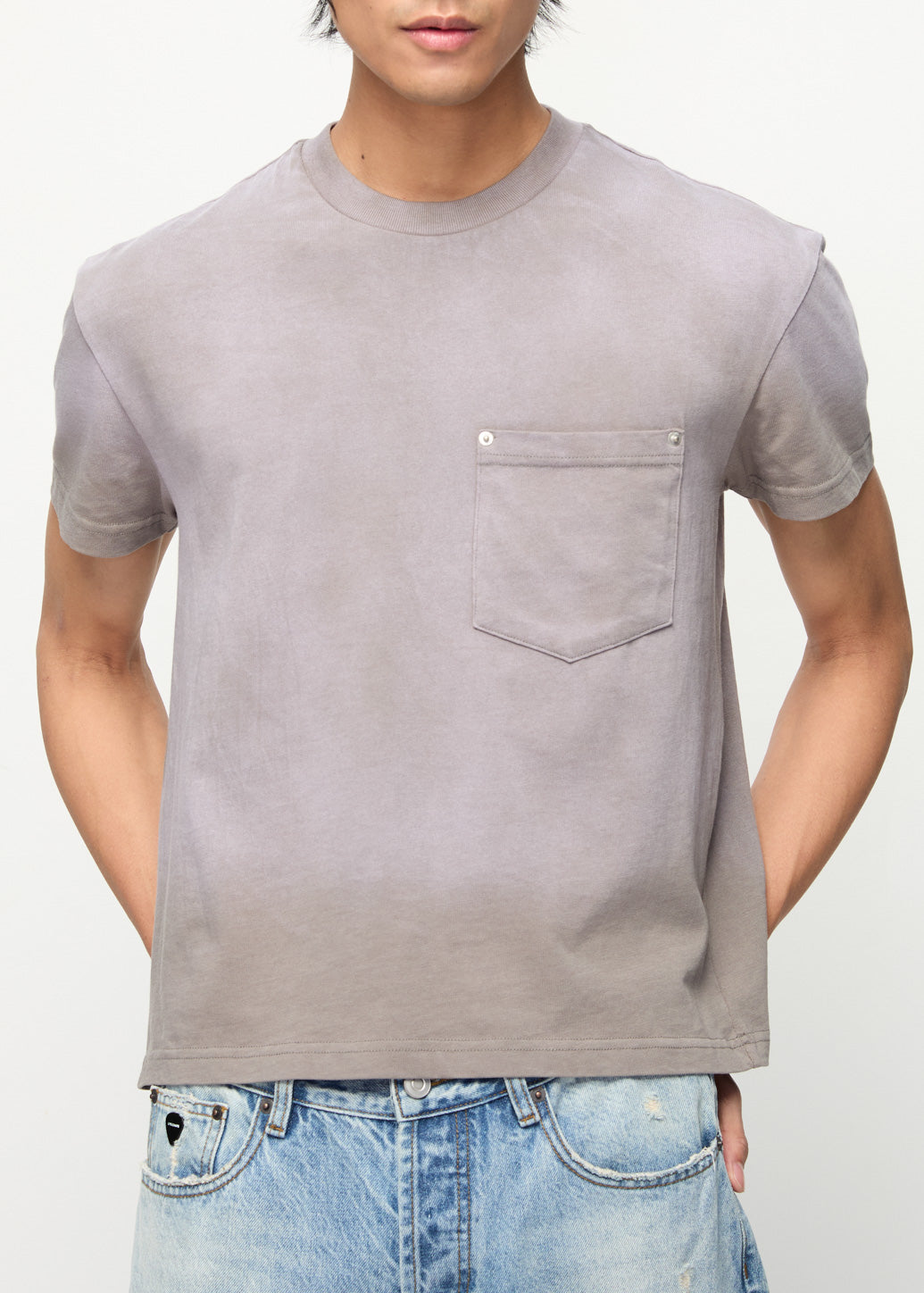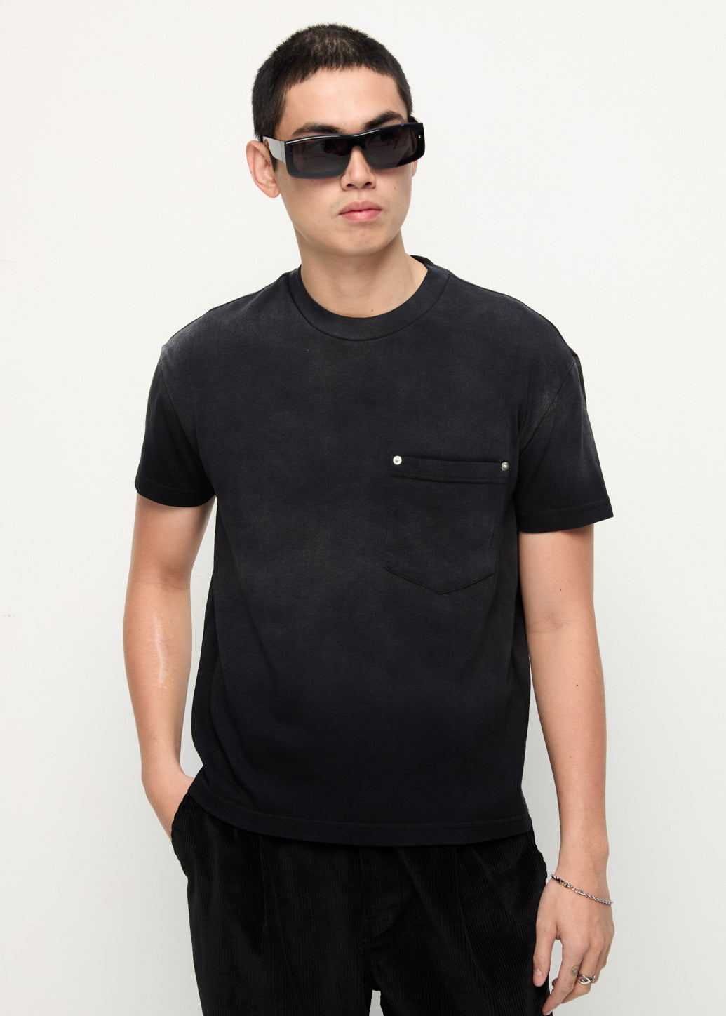 A round-neck T-shirt in a basic sun-faded tone, delivering an evenly sun-faded washed fabric with a refined vintage look. Finished with a chest pocket patch, this versatile essential is designed for easy mix-and-match styling, perfectly suited for everyday wear.