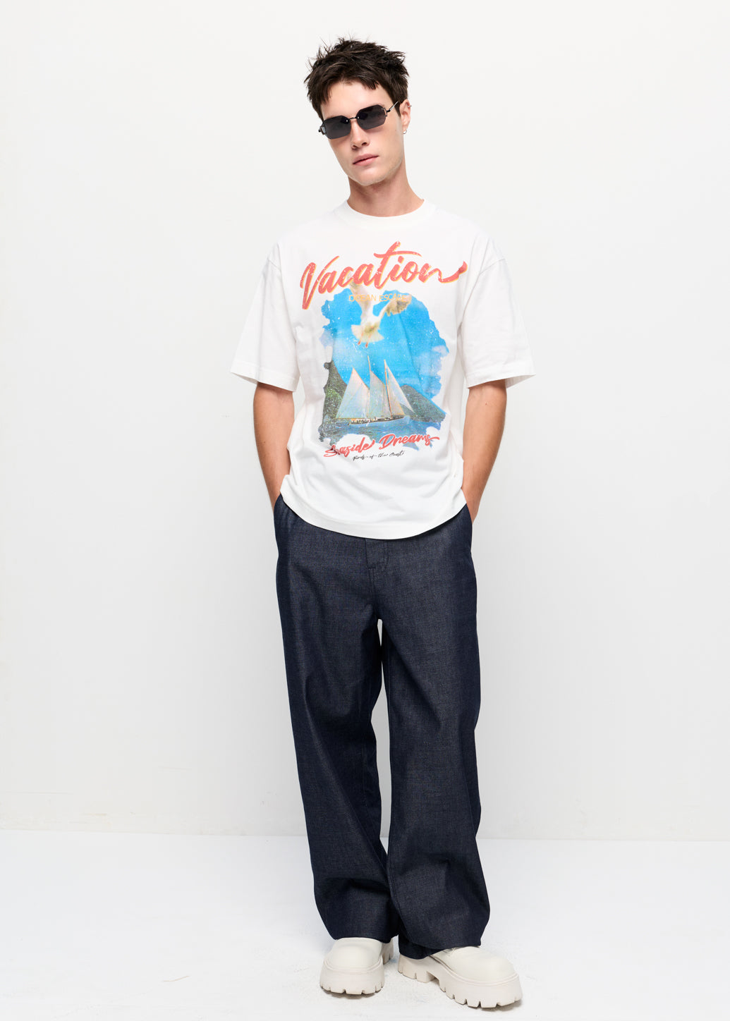 This relaxed-fit T-shirt features short sleeves and a classic round neckline. It showcases a bold sailing graphic print in vibrant colors for a relaxed, lively style. Lightweight and easy to wear, it brings a playful summer vibe that works effortlessly from city days to beach getaways.