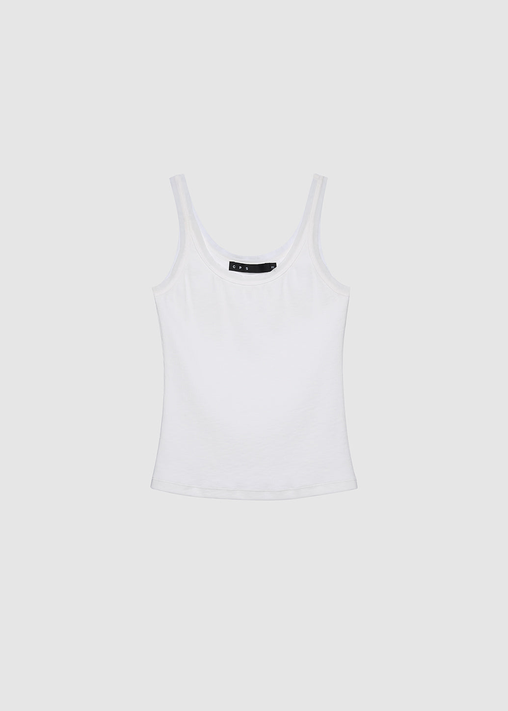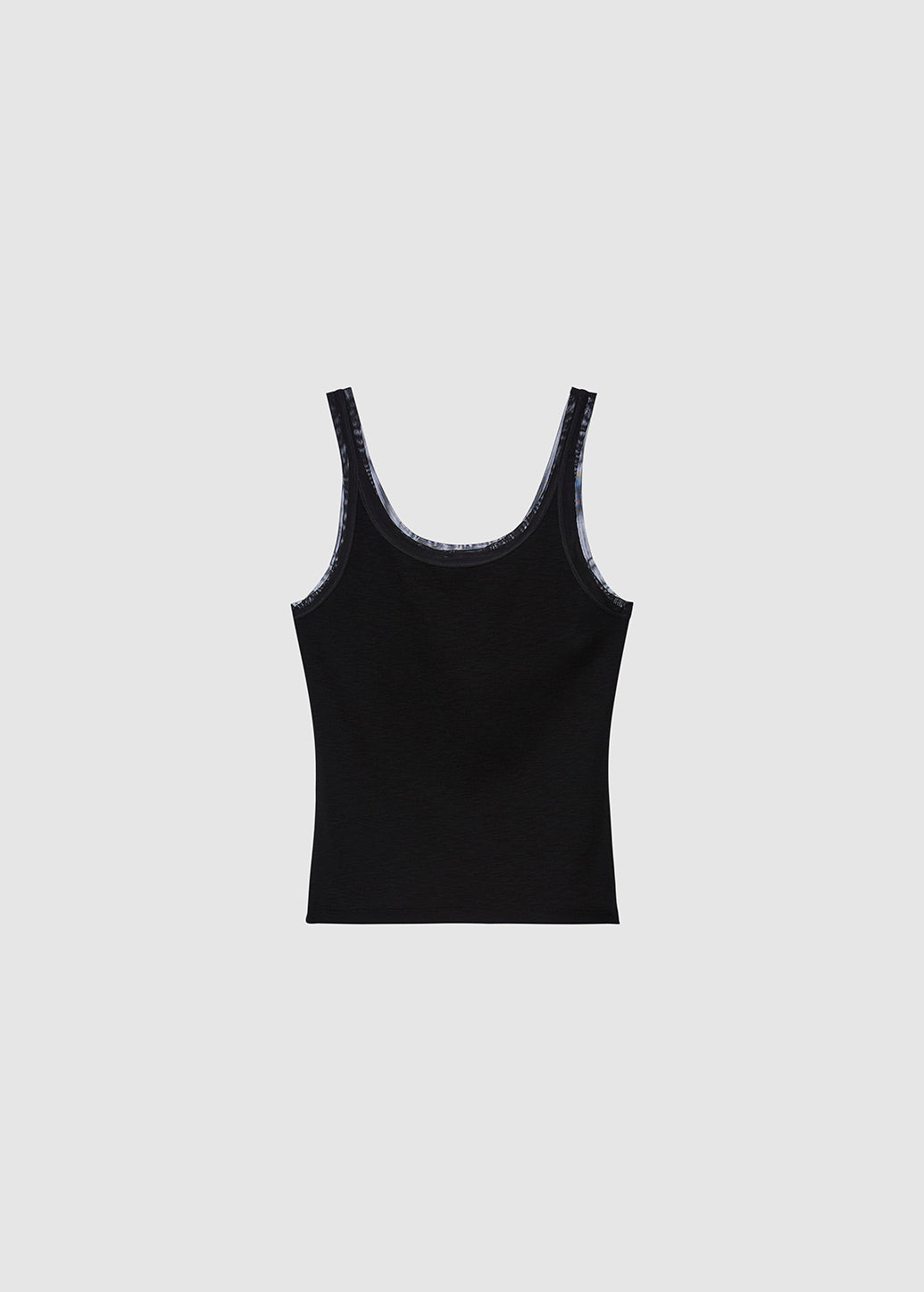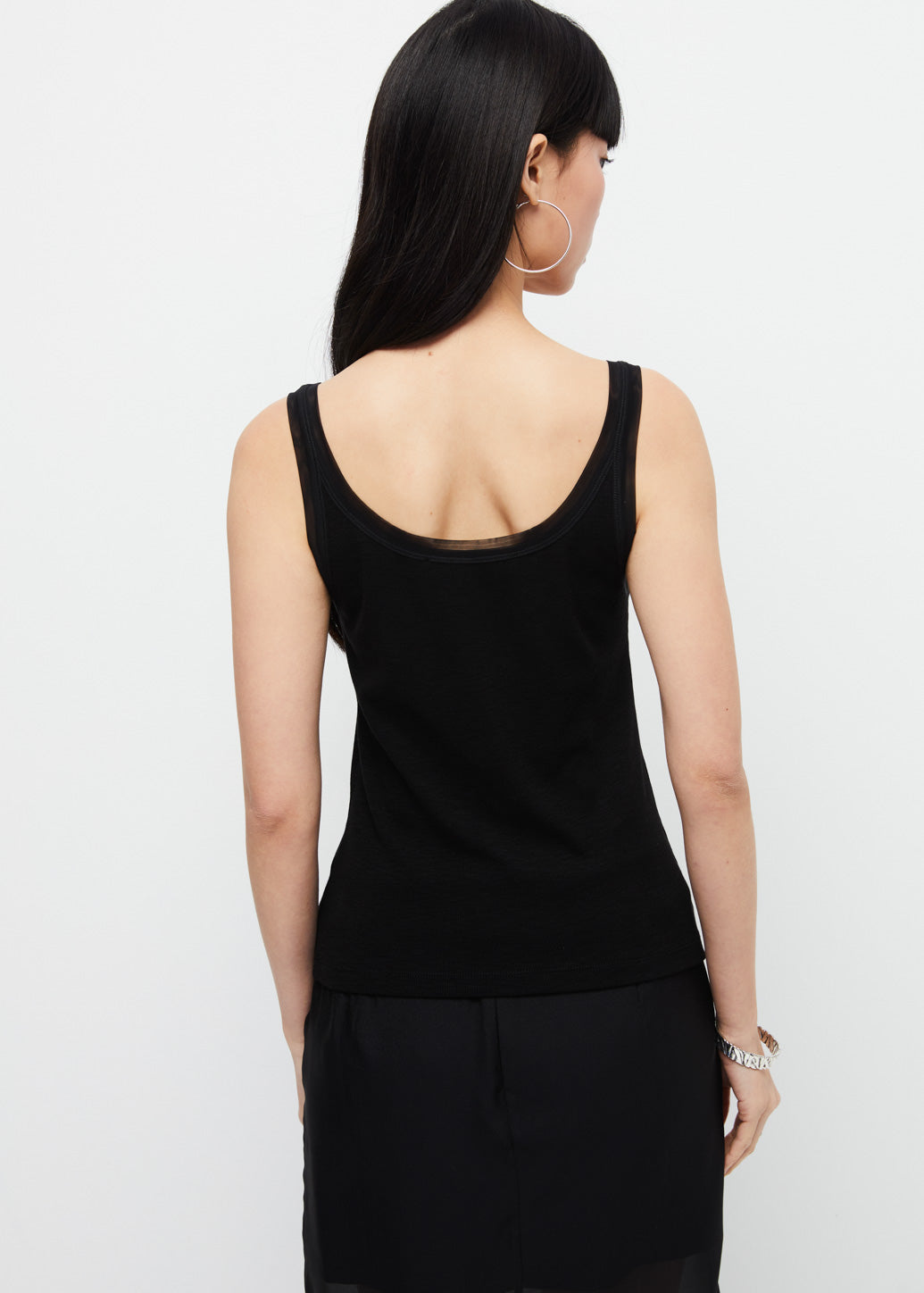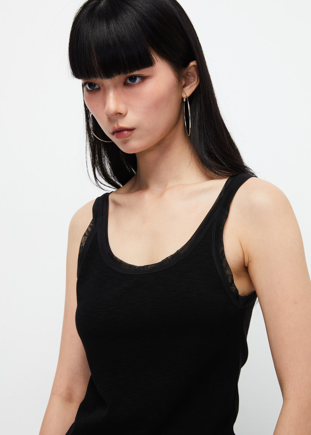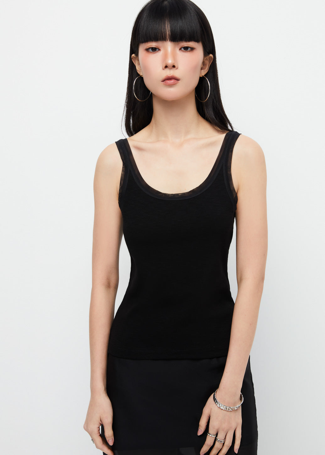 Basic solid-colored tank top with a comfortable, deep neckline. It stands out with delicate sheer trim detail, adding a touch of dimension and a subtle sexy-chic vibe. Wear it alone for a clean look or layer it under your favorite jacket for a classy, casual ensemble.