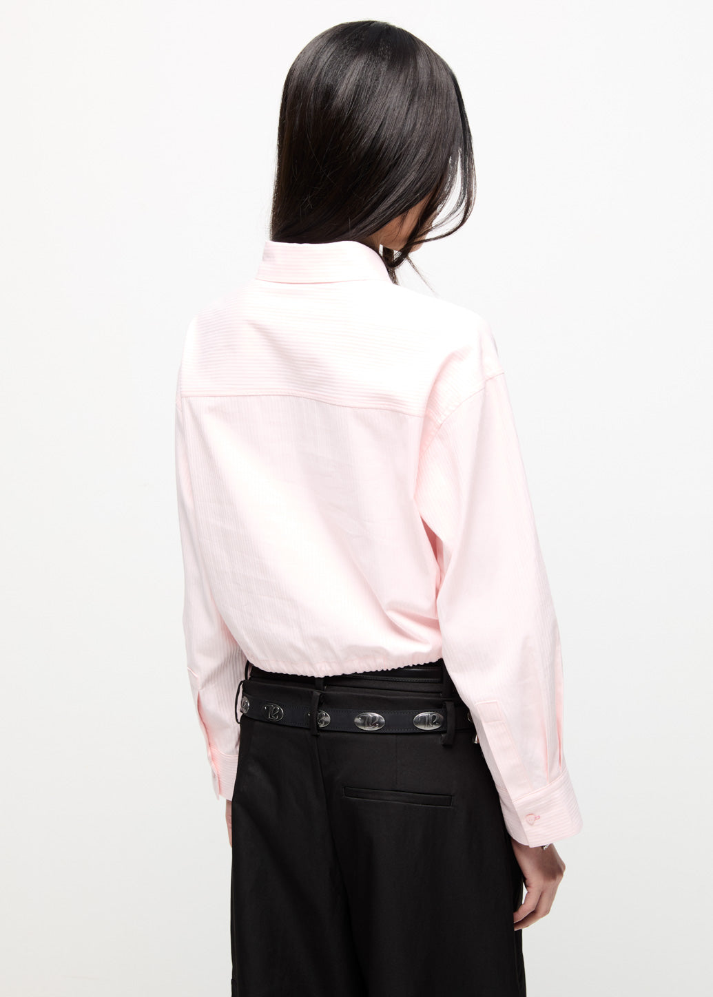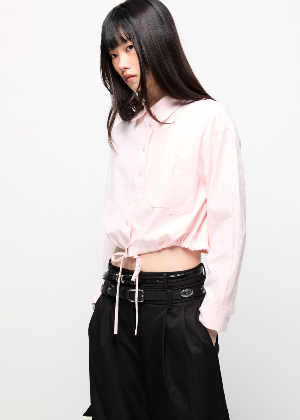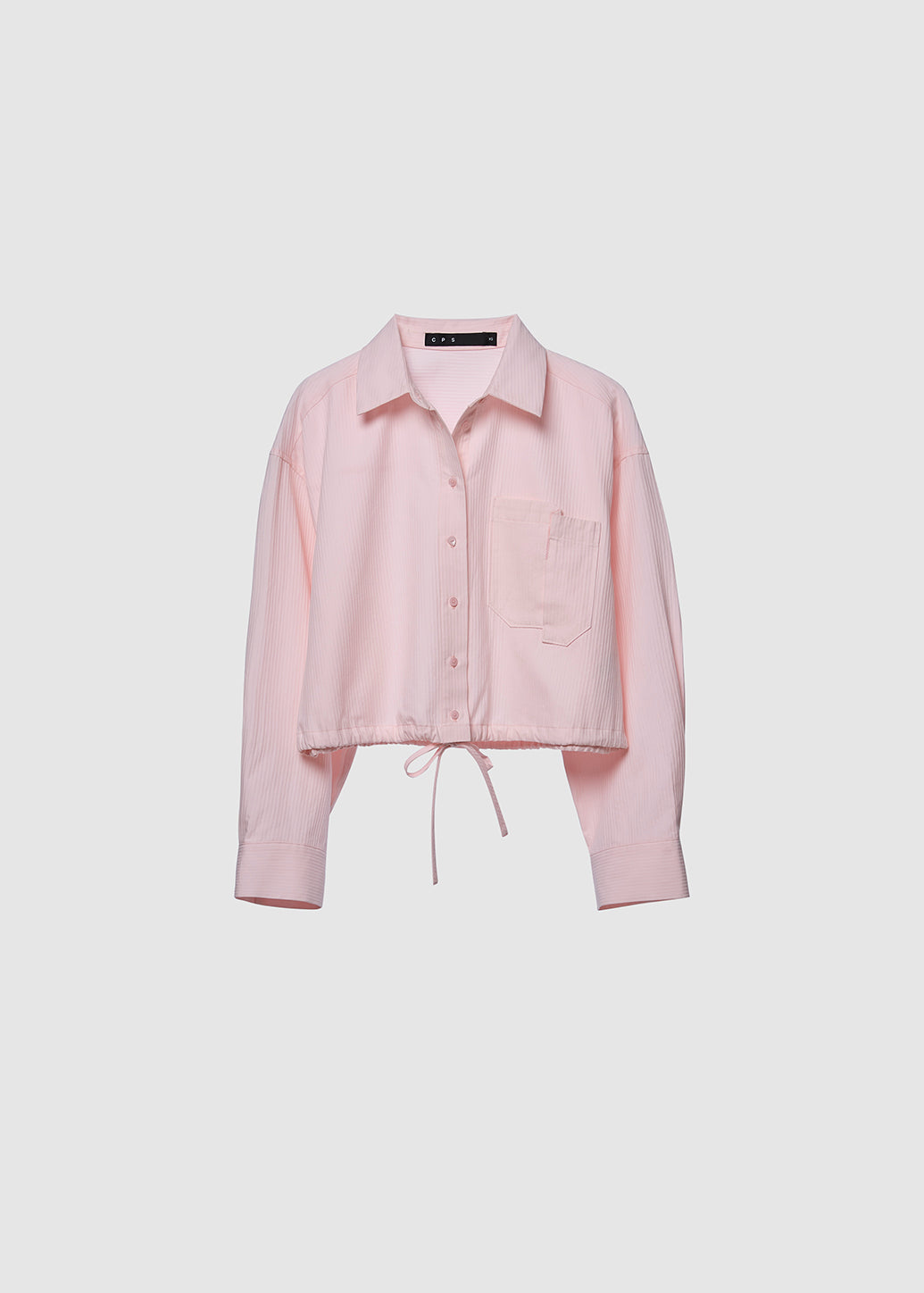 Cropped long-sleeve shirt in a soft pink tone for a chic and feminine look. Features patch pocket details and an adjustable drawstring hem to enhance the silhouette. Finished with iconic C P S guitar-pick logo buttons, blending utility-inspired cool with feminine charm.