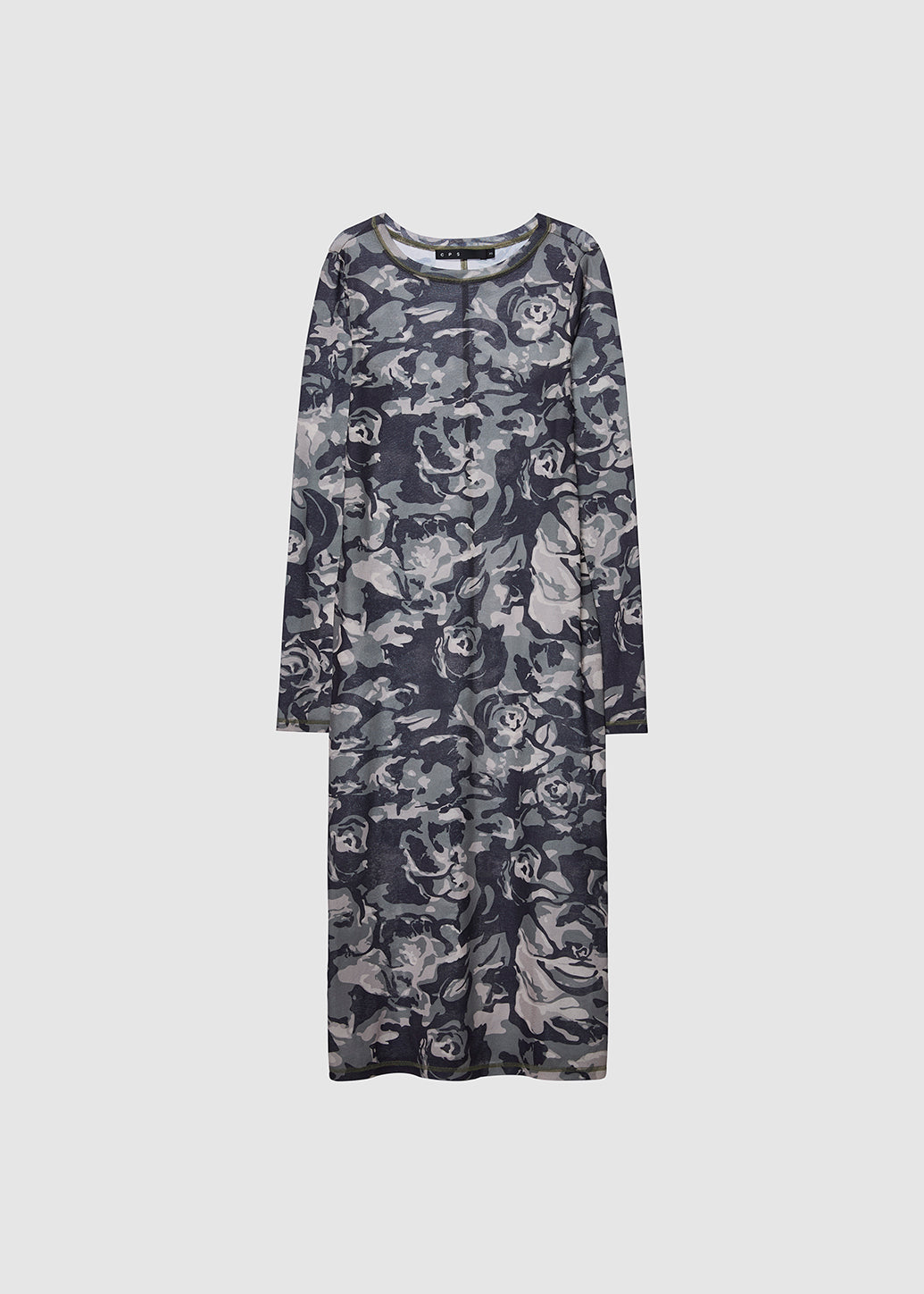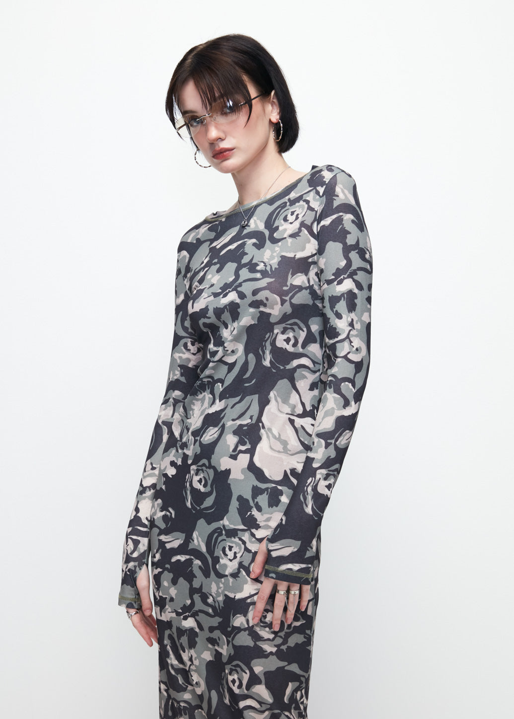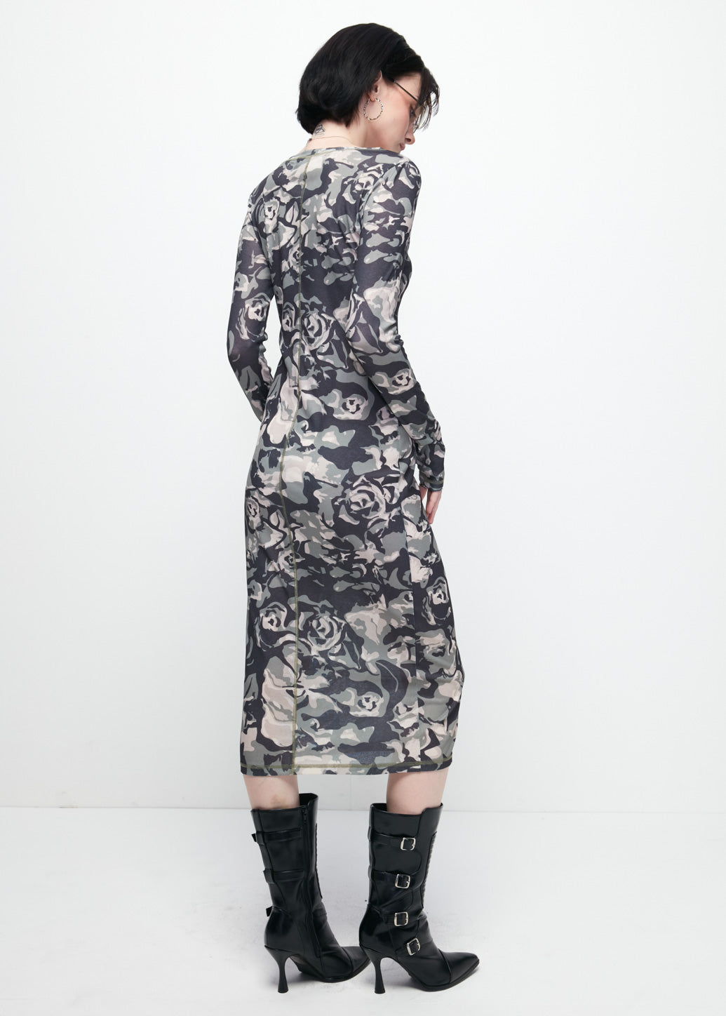 Midi-length mesh dress that combines cool attitude with femininity. Designed with long sleeves and a classic crew neckline, and highlighted by a bold camouflage print. Delivers a confident and modern street-style look with every mix and match.