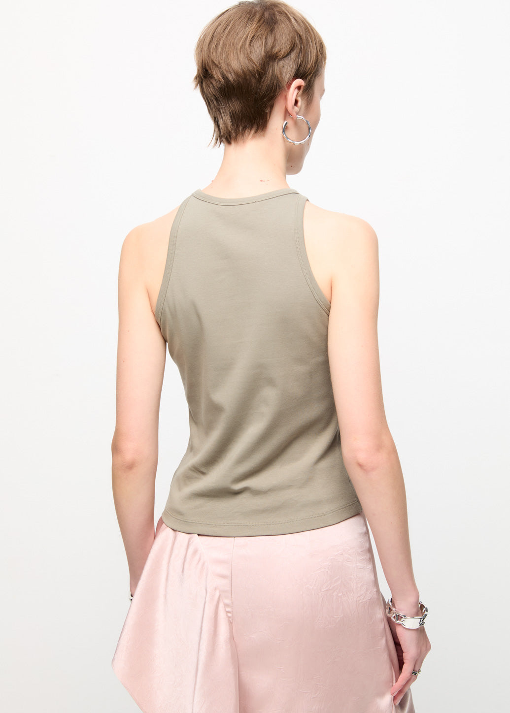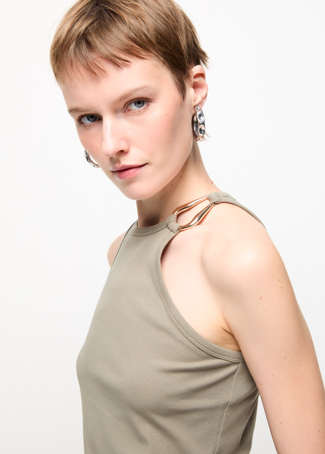 A halter-neck top featuring a standout hardware buckle detail at the collar for an edgy touch. The design beautifully highlights the shoulders and neckline, offering a modern chic look. Pair it with denim pants for both casual and street-style outfits.