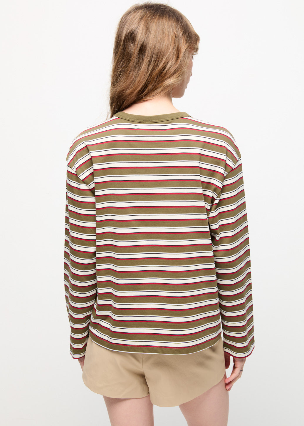 This oversized long-sleeve tee delivers a classic casual vibe. Featuring a crew neck and minimalist green horizontal stripes, it pairs effortlessly with jeans or denim shorts for a relaxed everyday look.