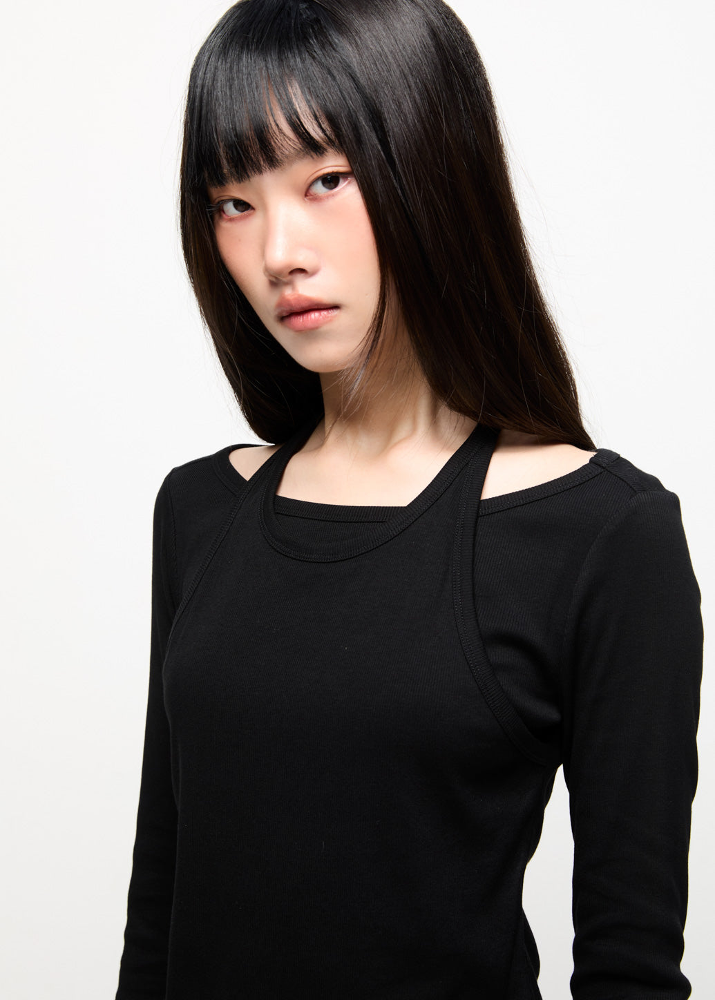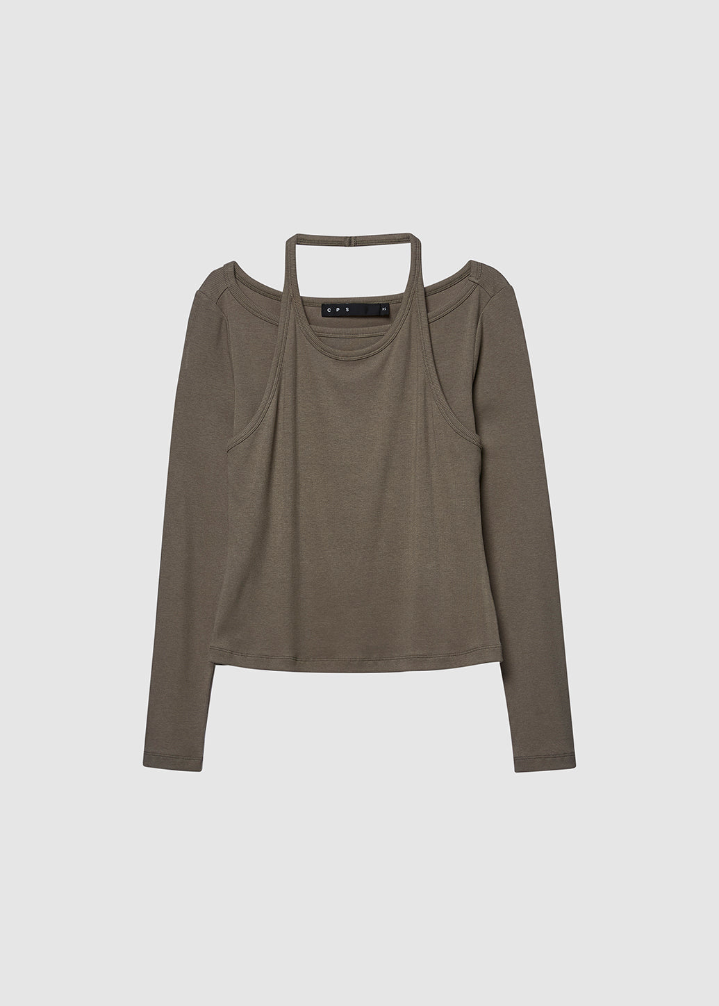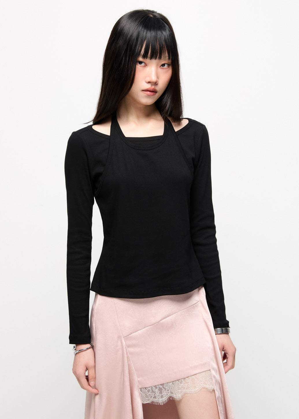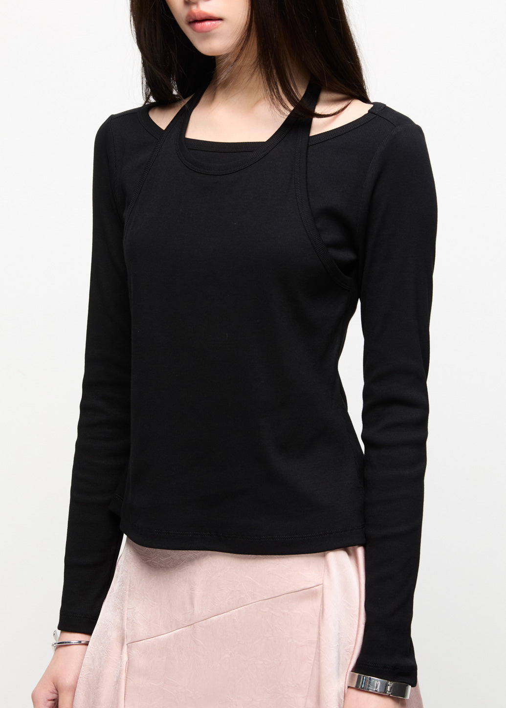 A stylish double-layered long-sleeve top that includes an outer halter tank sewn over an inner long-sleeve shirt. This piece provides a modern fashion look, perfect for achieving a layered aesthetic.