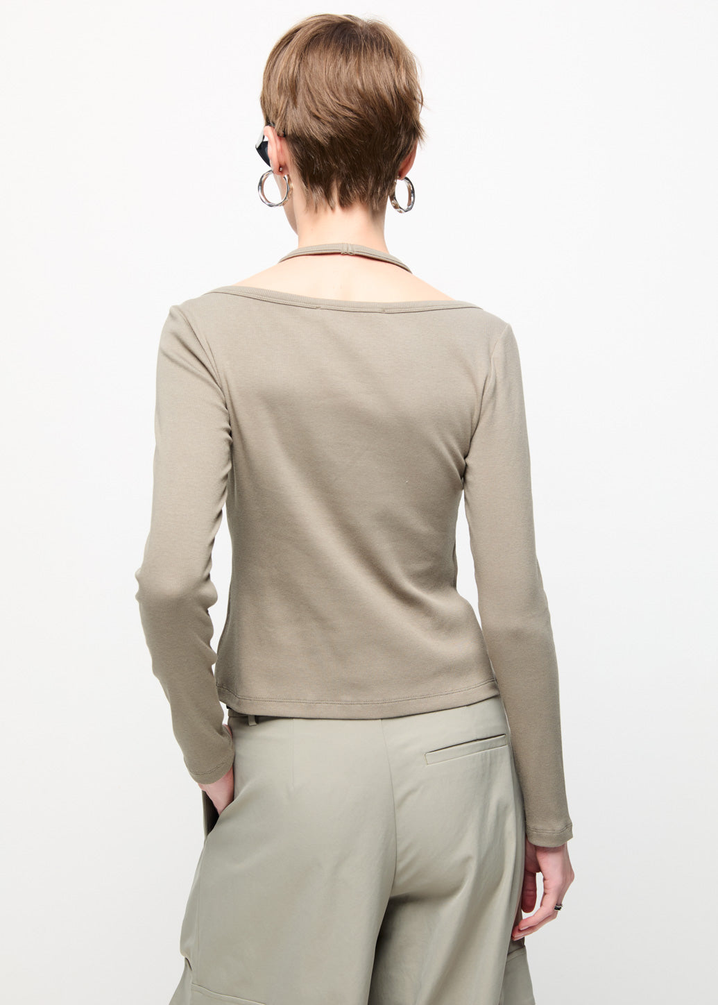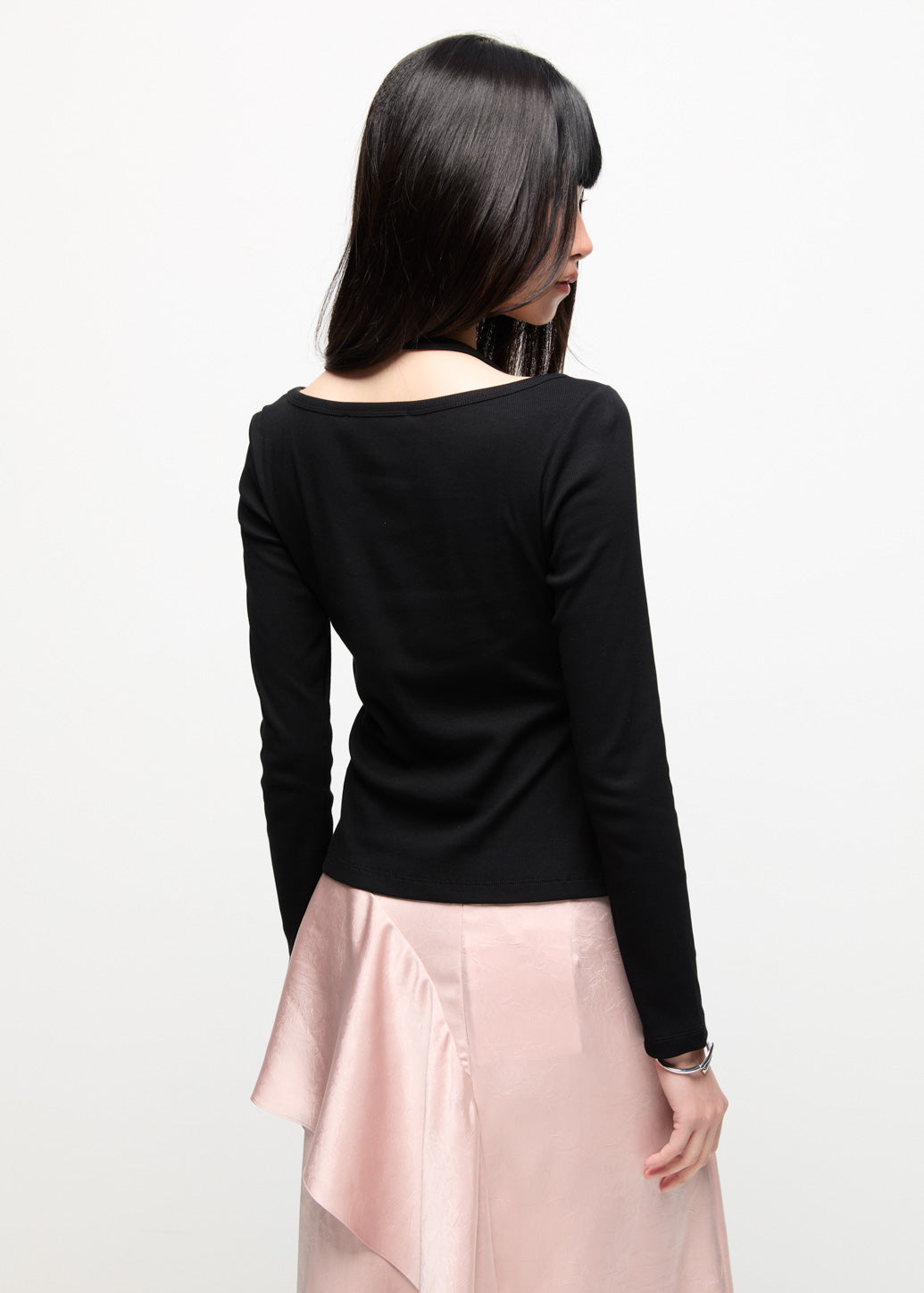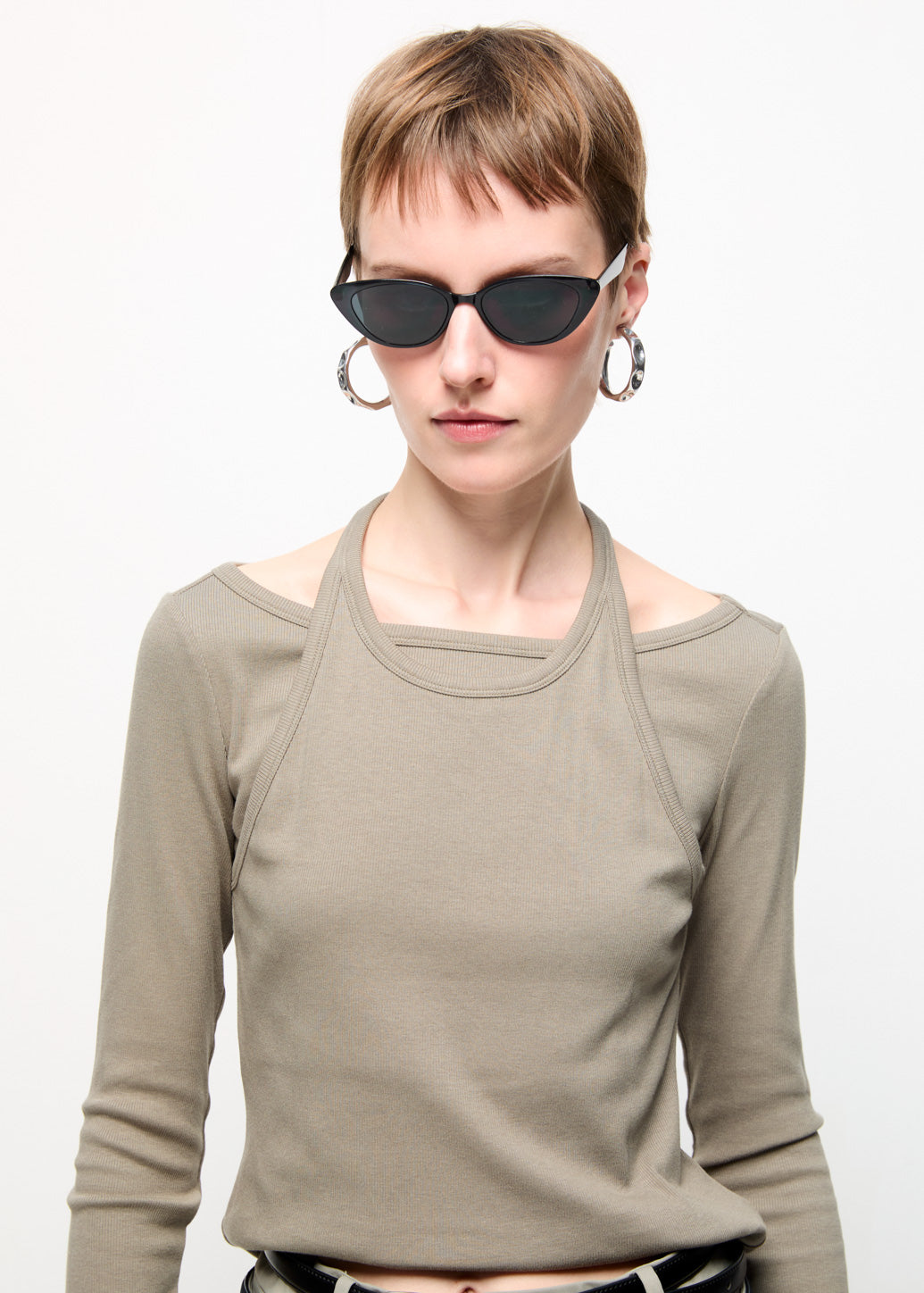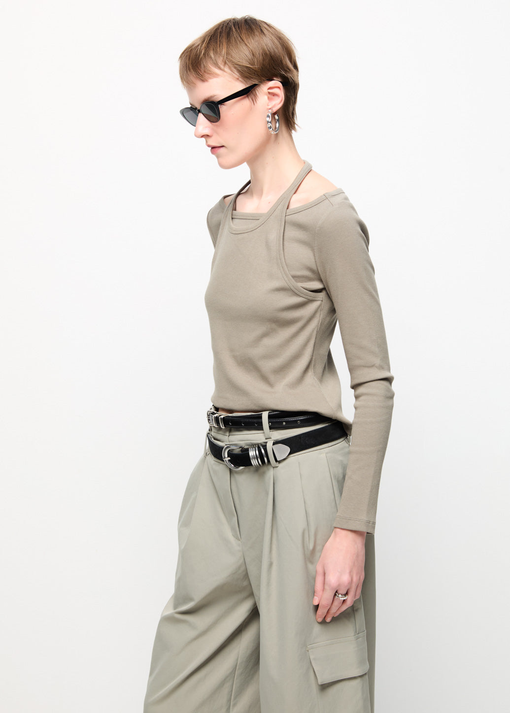 A stylish double-layered long-sleeve top that includes an outer halter tank sewn over an inner long-sleeve shirt. This piece provides a modern fashion look, perfect for achieving a layered aesthetic.
