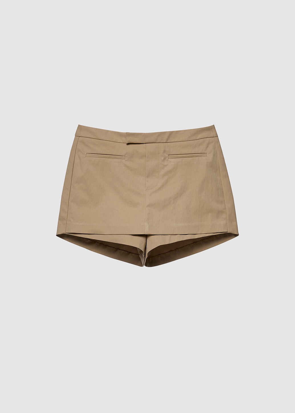 Beige skort to get into winter fashion. It features a stylish design where the inner shorts are intentionally visible at the hem. With its layered construction and welt pockets, it exudes a sharp and modern style for everyday looks.