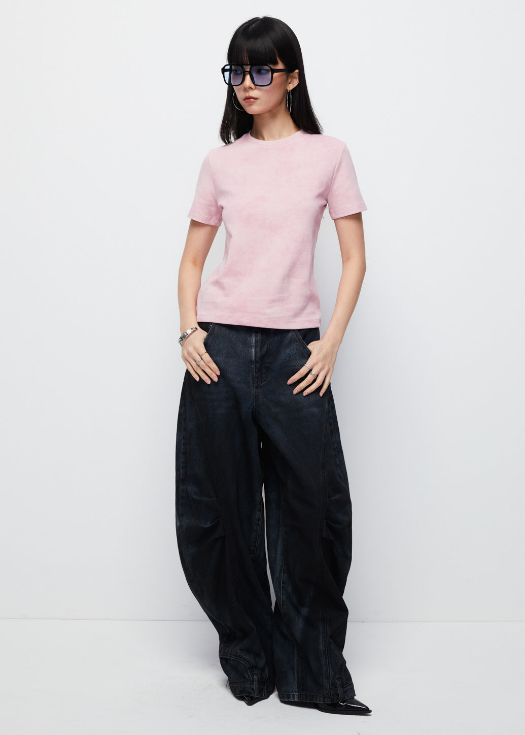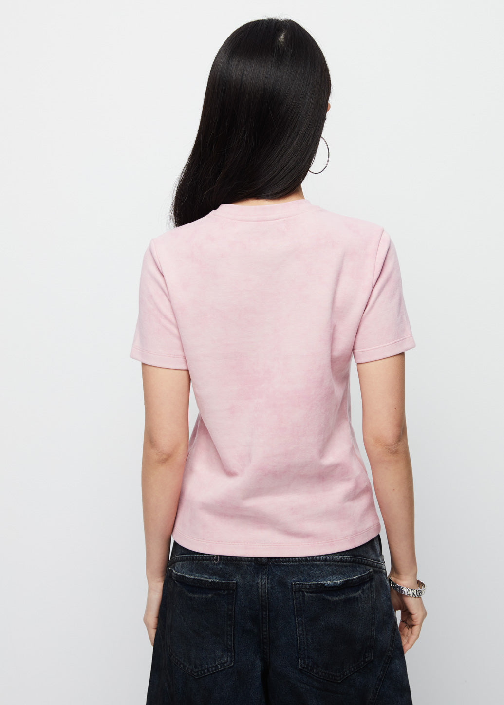 Basic short-sleeve crewneck T-shirt in a comfortable fitted cut for all body types. Available in two classic colors, black and pink, making it a statement essential for casual looks.
