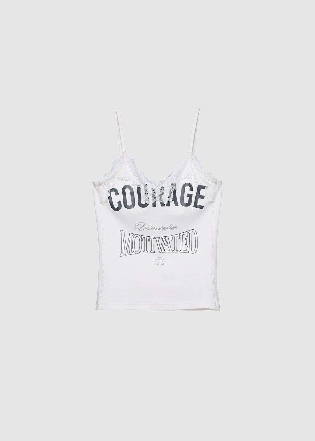 A chic blend of sporty graphics and sweet details. This camisole features a typography college graphic print on the front, softened by delicate lace trim along the neckline. Pair it with the matching bottoms for a modern, feminine street look.
