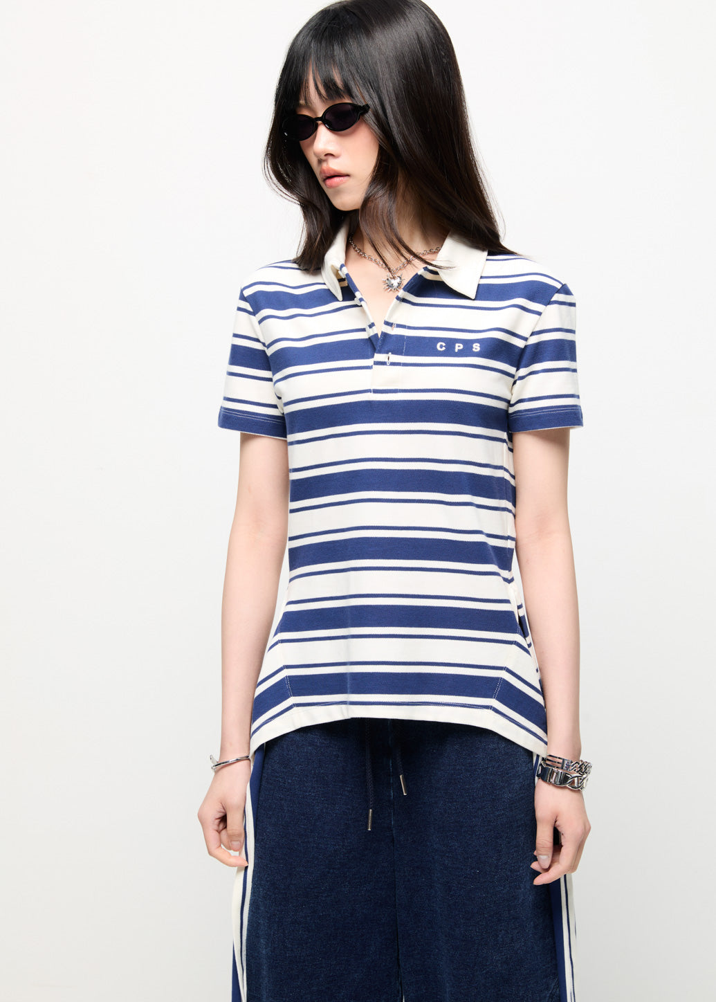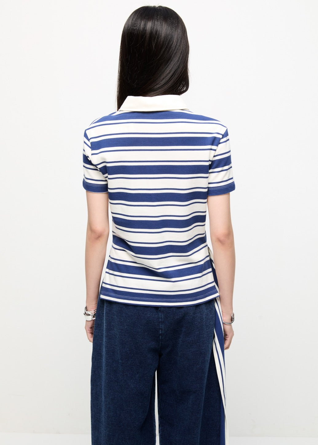 An oversized jersey polo shirt featuring horizontal stripes. It comes with unique long side ties that allow you to customize your style; leave them hanging for a chic gimmick, or tie them into a bow for a touch of sweet feminine style.