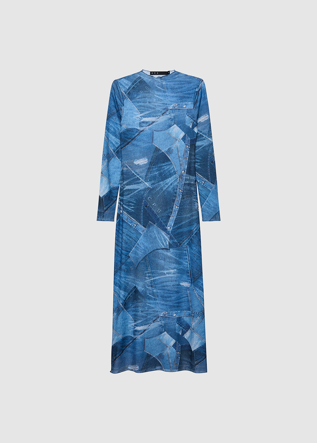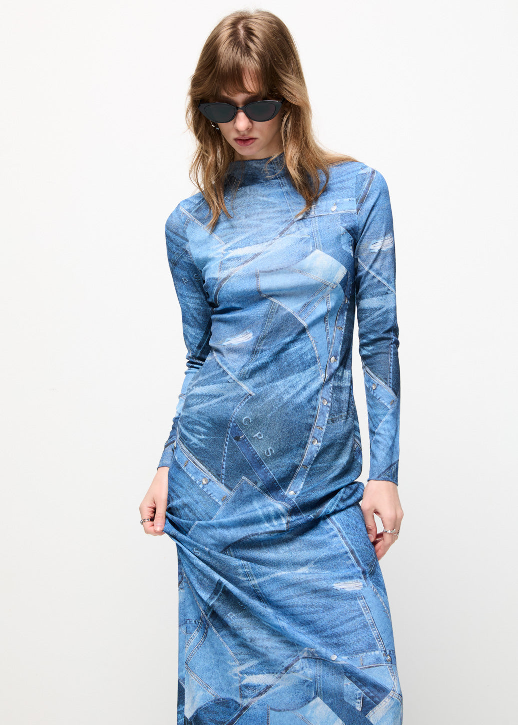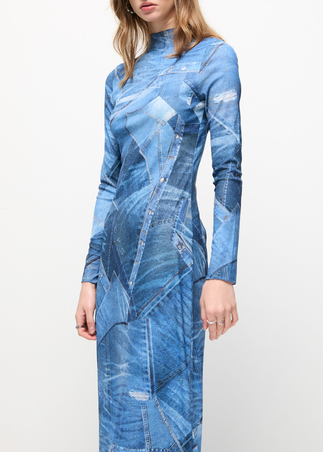 A long-sleeve maxi dress with a sophisticated mock-neck design. It blends elegant lines with a sporty aura through a Trompe L’oeil denim print, delivering a chic denim-inspired look for any occasion.