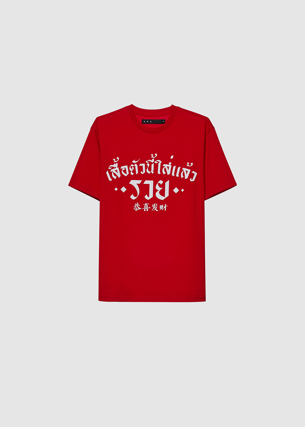 Experience street comfort with a festive twist. This oversized tee comes in an auspicious holiday shade and features a bold white graphic slogan: 'Wearing this shirt brings wealth.' It is a fun, fashionable way to embrace prosperity while adding a playful vibe to your festive wardrobe.
