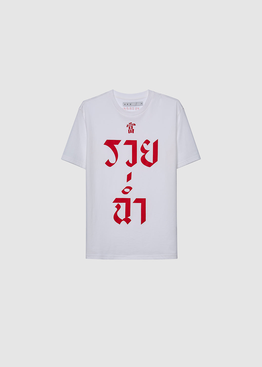 This oversized tee perfectly blends street fashion with fortune. It stands out with the Thai graphic text 'Ruay Cham' (Abundantly Wealthy), delivering a minimal-cool vibe. Celebrate Chinese New Year with elevated style and a touch of prosperity.