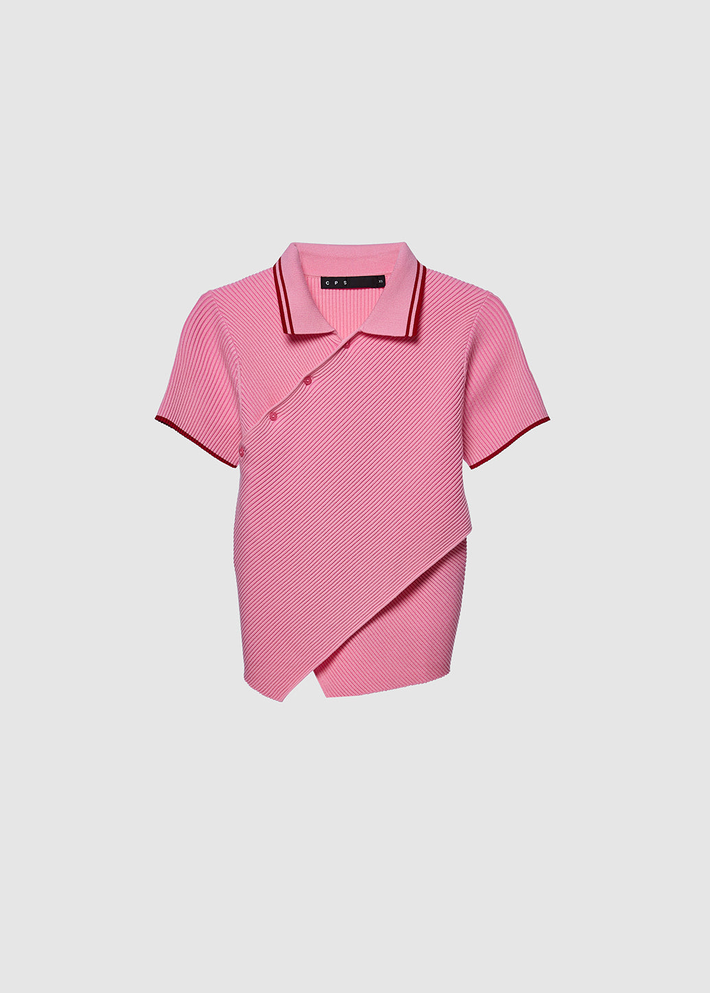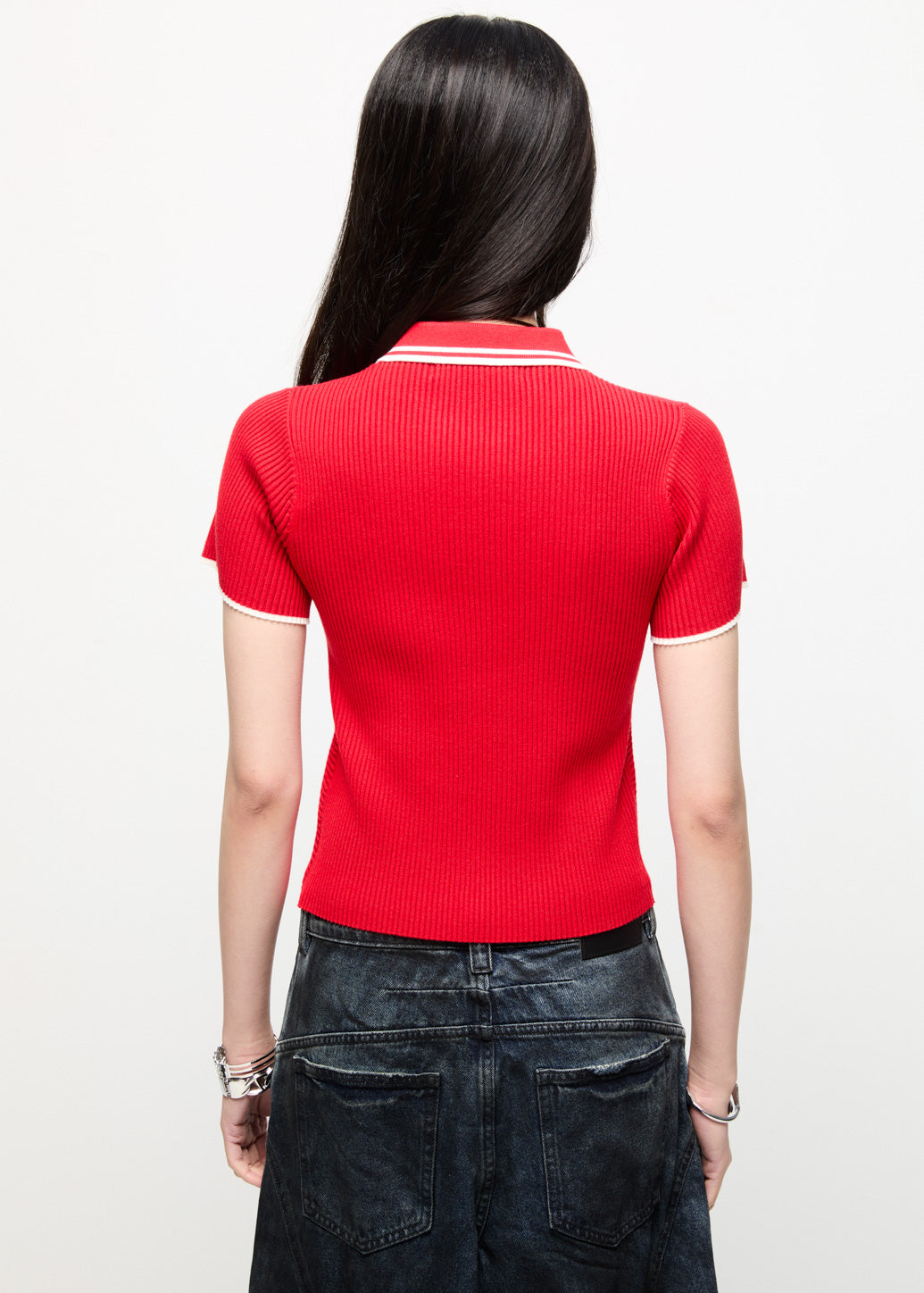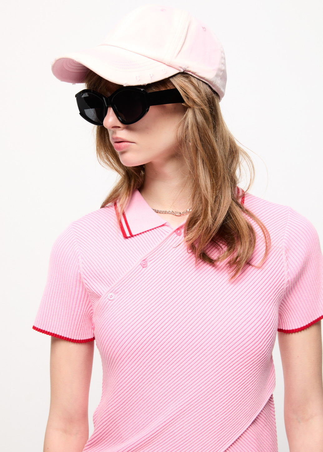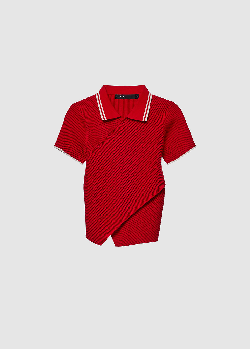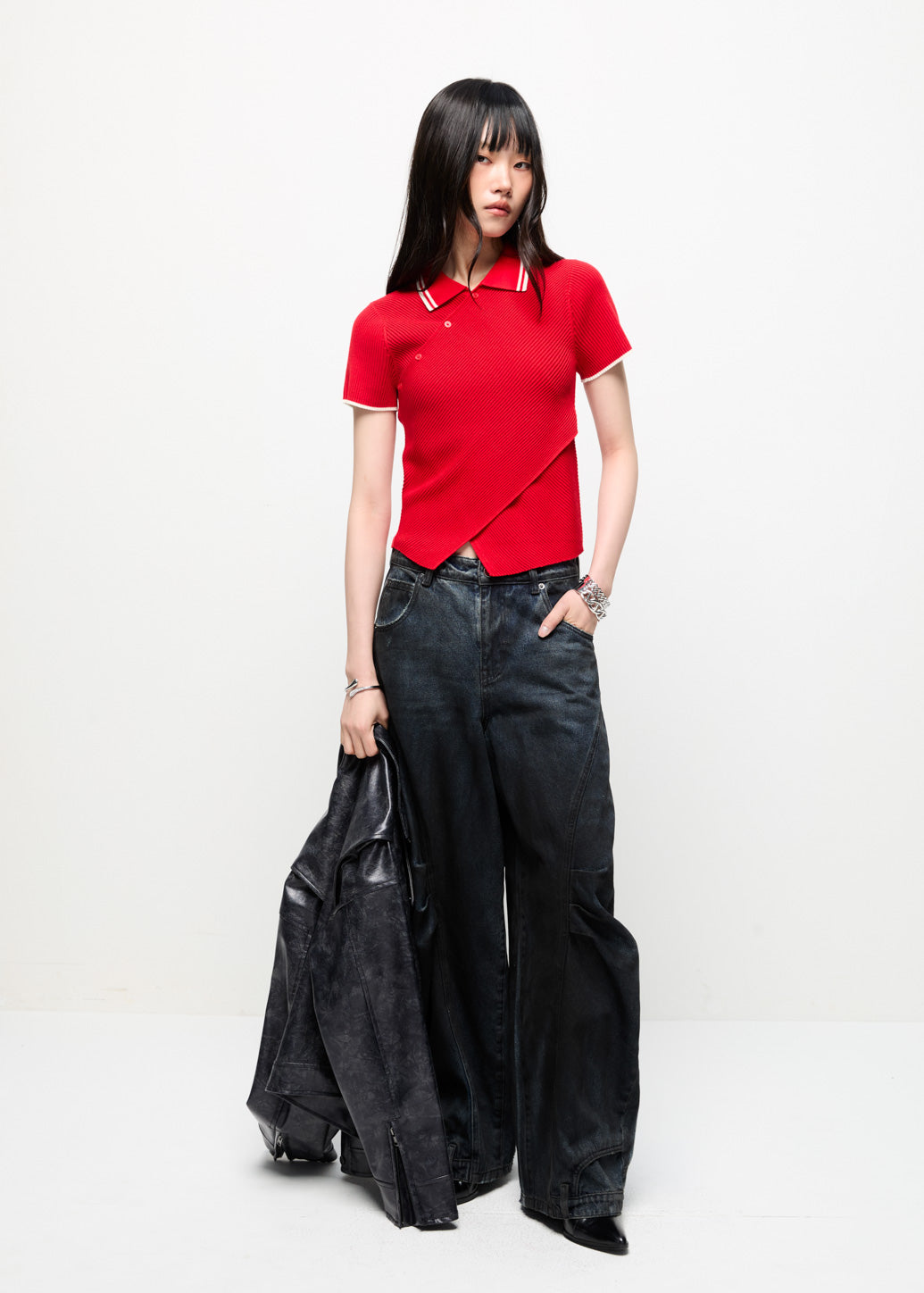 A short-sleeve top that brings a bright and festive energy to your Lunar New Year celebrations. It features a striped collar and a unique wrap-over front design, creating a flattering silhouette. This piece perfectly merges smart minimal, clean lines with a playful, modern twist.