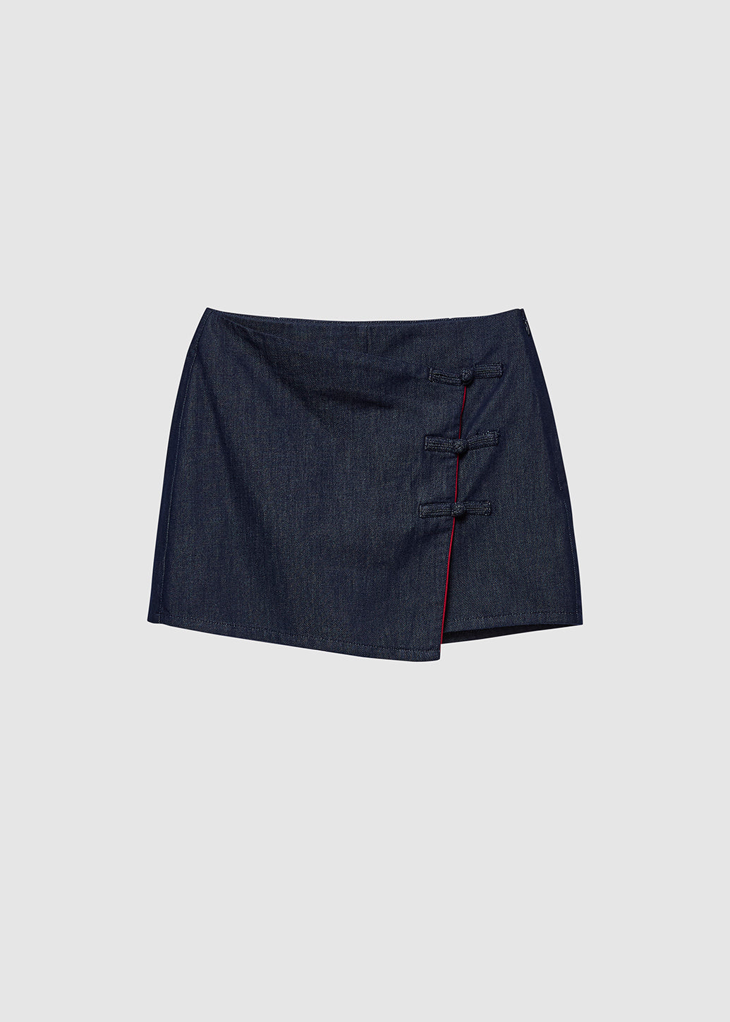 This mini skirt is a perfect match for the Lunar New Year. It features a wrap-around design that creates elegant layered dimensions, secured by Chinese buttons on the side for an Oriental flair. Finished with red piping, it captures the auspicious essence of the festive season.