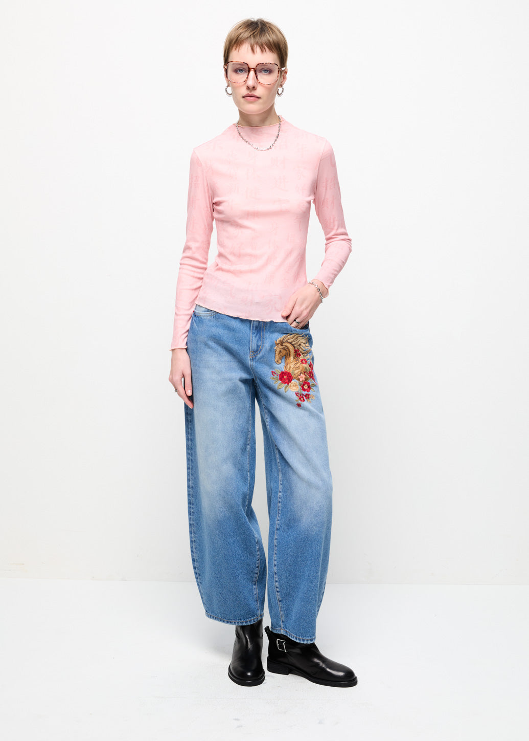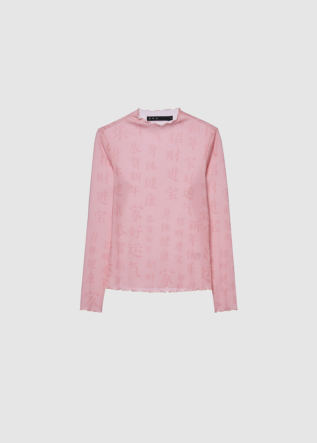 Modern and chic, this high-neck long-sleeve top features a soft scalloped high collar for a relaxed, feminine touch. Made from stretch fabric, it is finished with an all-over flocked Chinese character print that adds rich texture, perfectly balancing แ้รแ edge with elegant femininity.