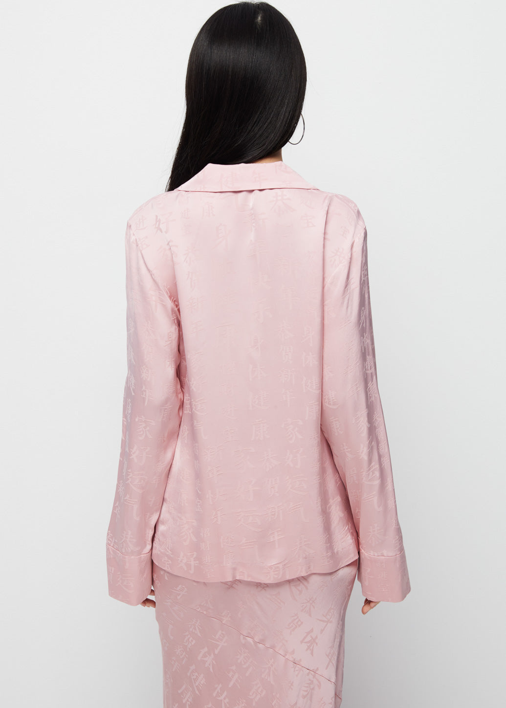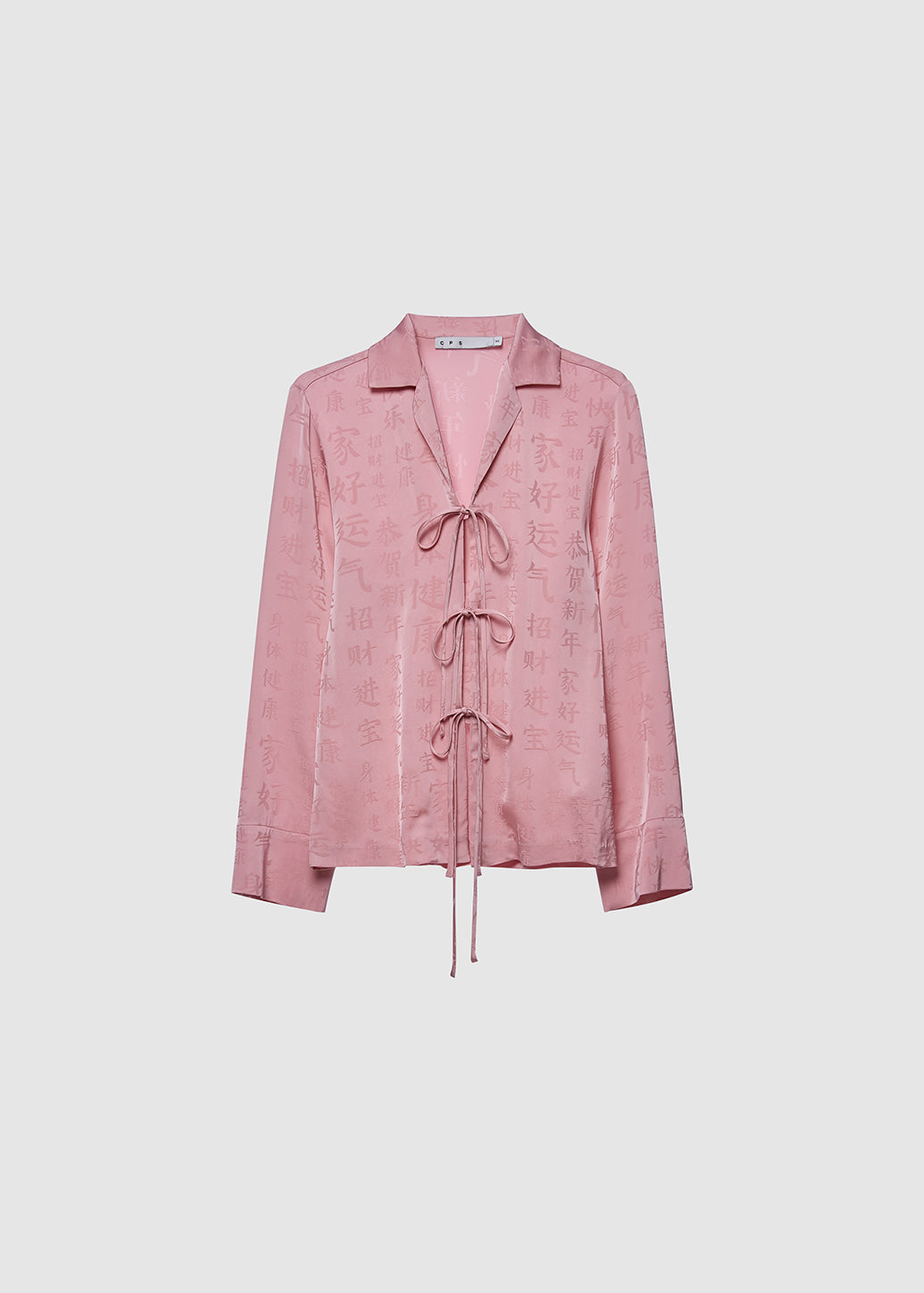 This pink long-sleeve blouse captures a feminine yet uniquely edgy aesthetic. It features an all-over Chinese character print and a standout front lace-up closure instead of buttons. This design offers a charming casual look that perfectly matches the festive holiday celebration.