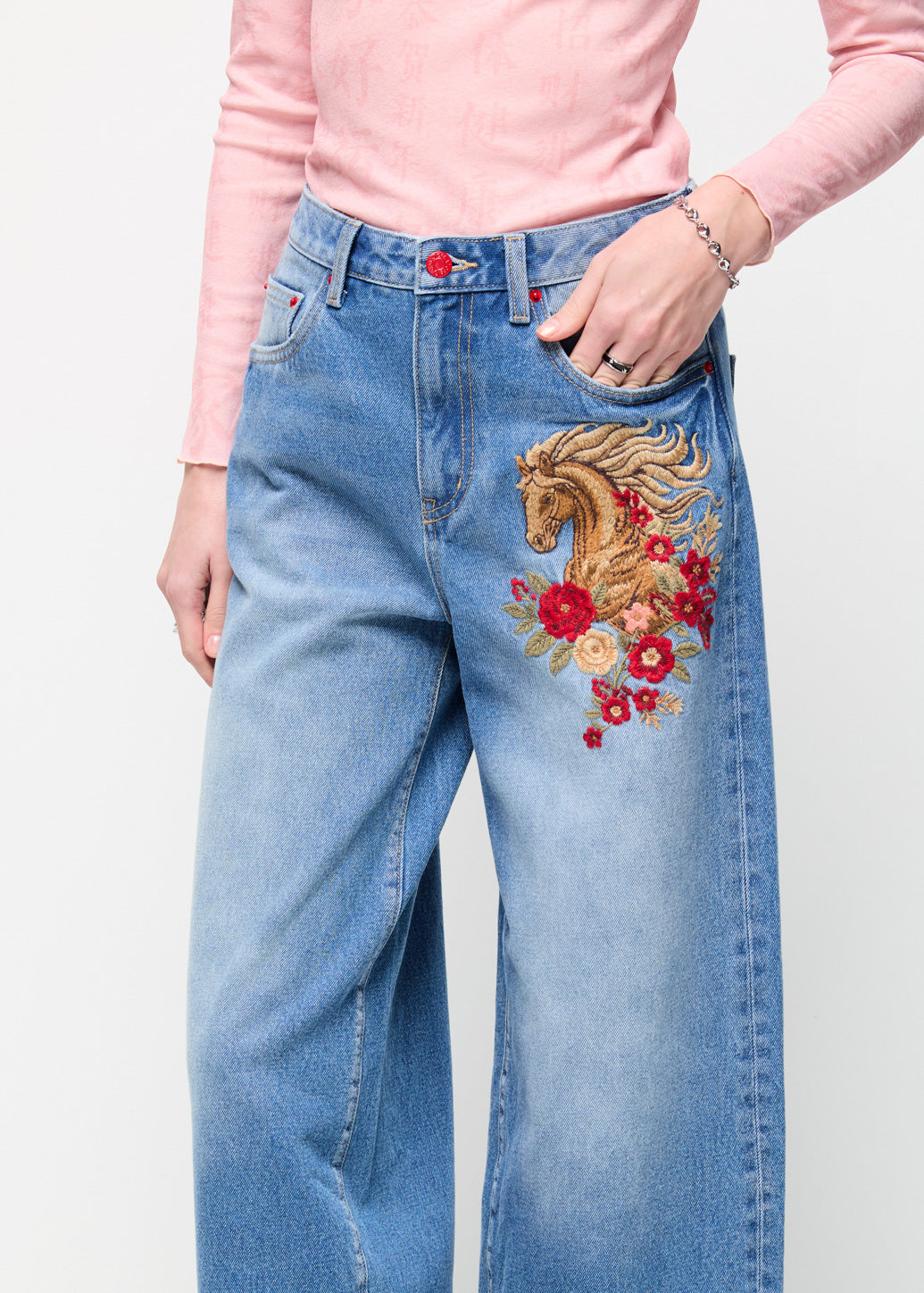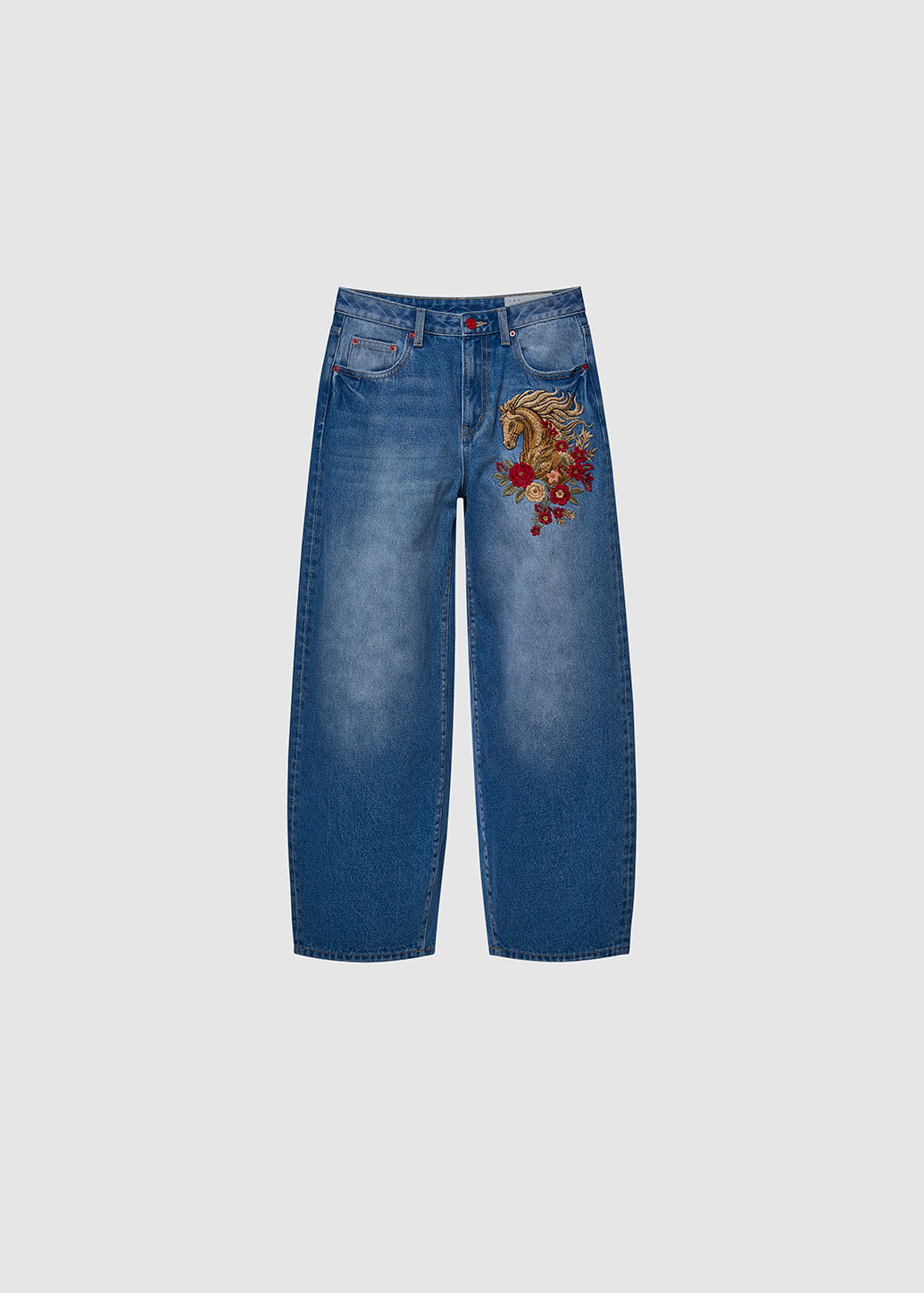 These barrel-leg jeans feature a modern curved silhouette and are enhanced with exquisite horse embroidery representing elegance and auspiciousness. Embrace the Year of the Horse in 2026; this denim piece perfectly blends street-style attitude with modern festive flair.