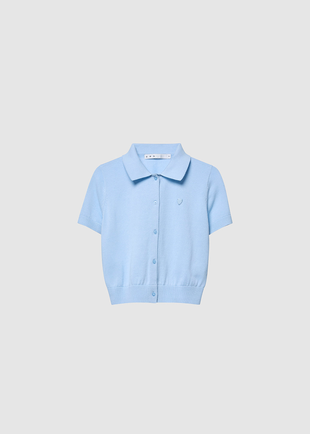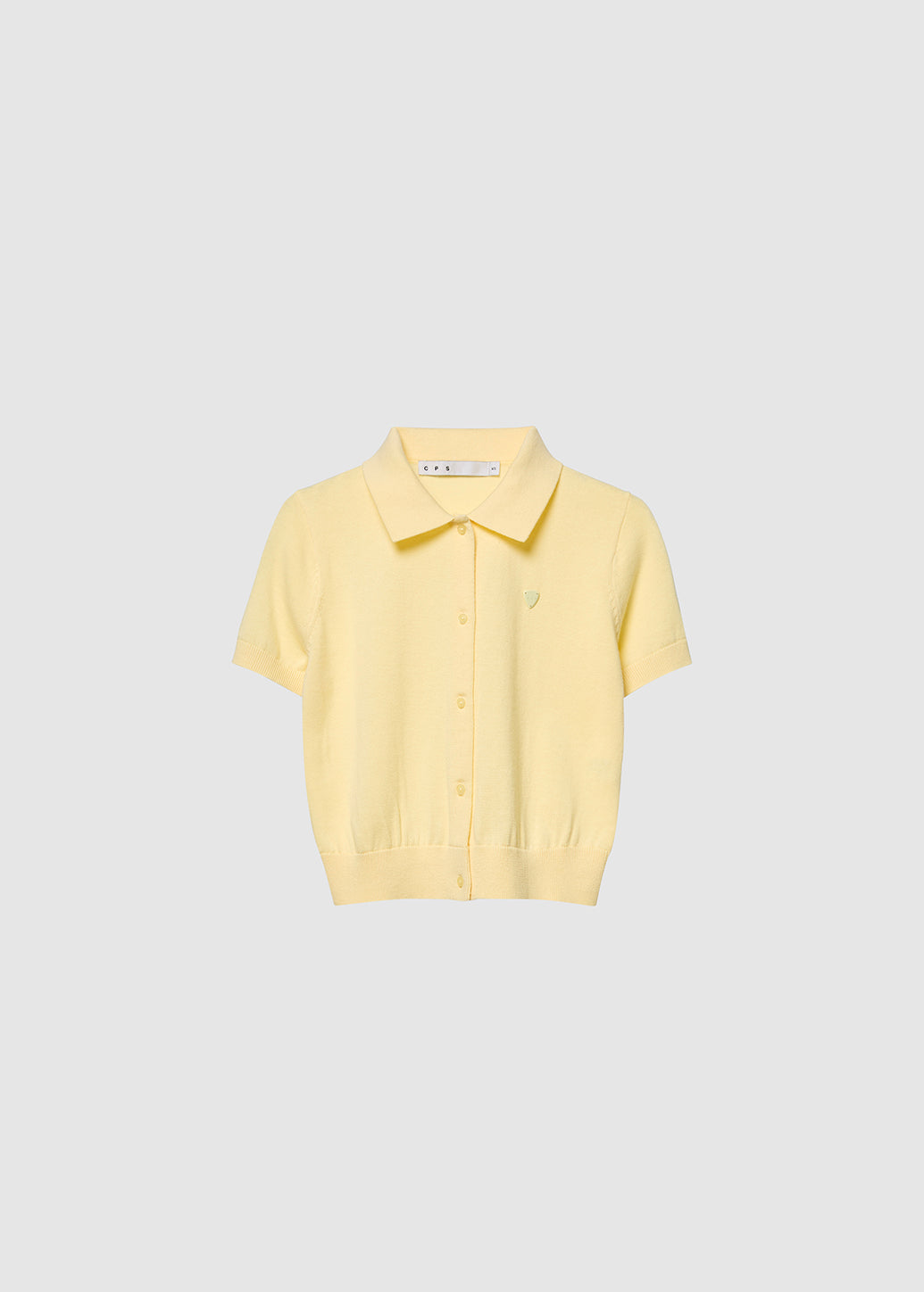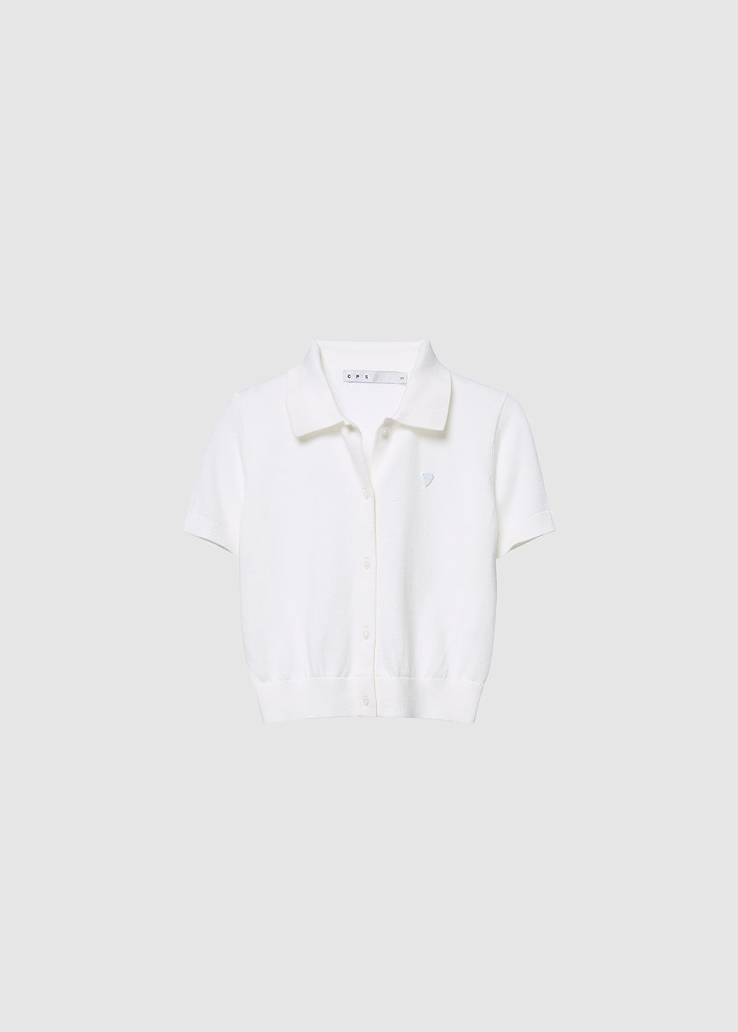 A classic knitted polo shirt with a full button-down front. Detailed with a tonal metal guitar pick logo on the chest. A distinctive CPS signature with ribbed collar, cuffs, and hem adds a refined touch, while the soft pastel tones balance a gentle sophistication with effortless cool.