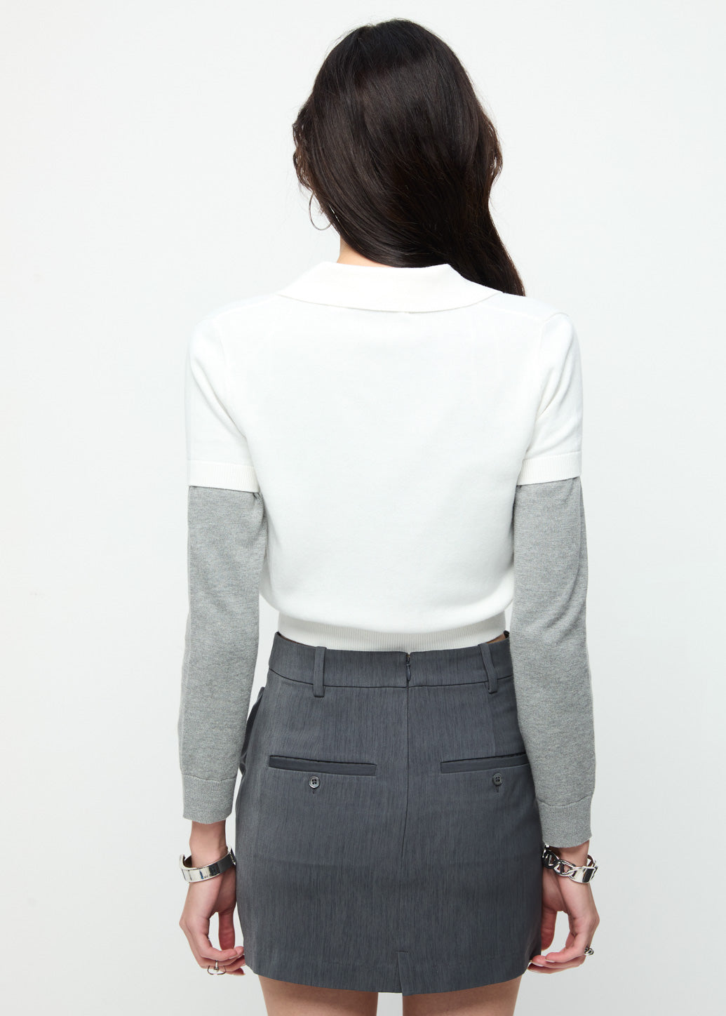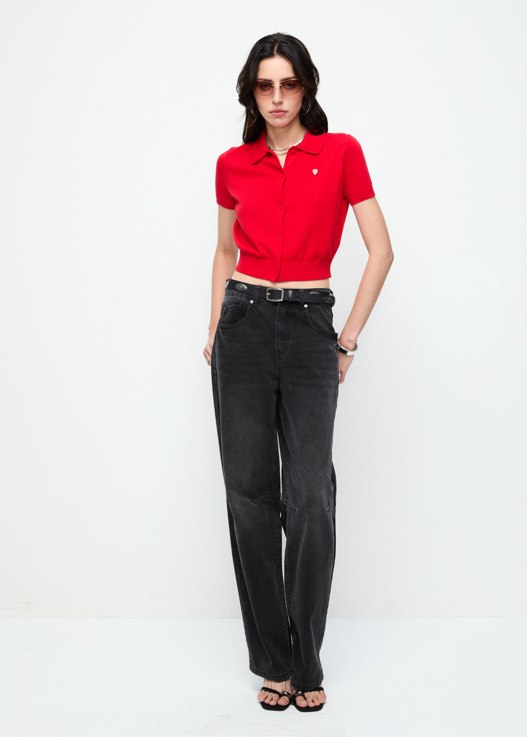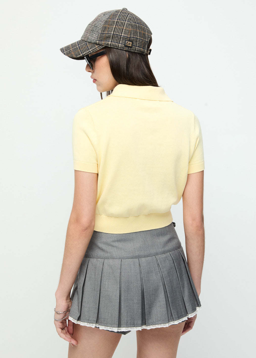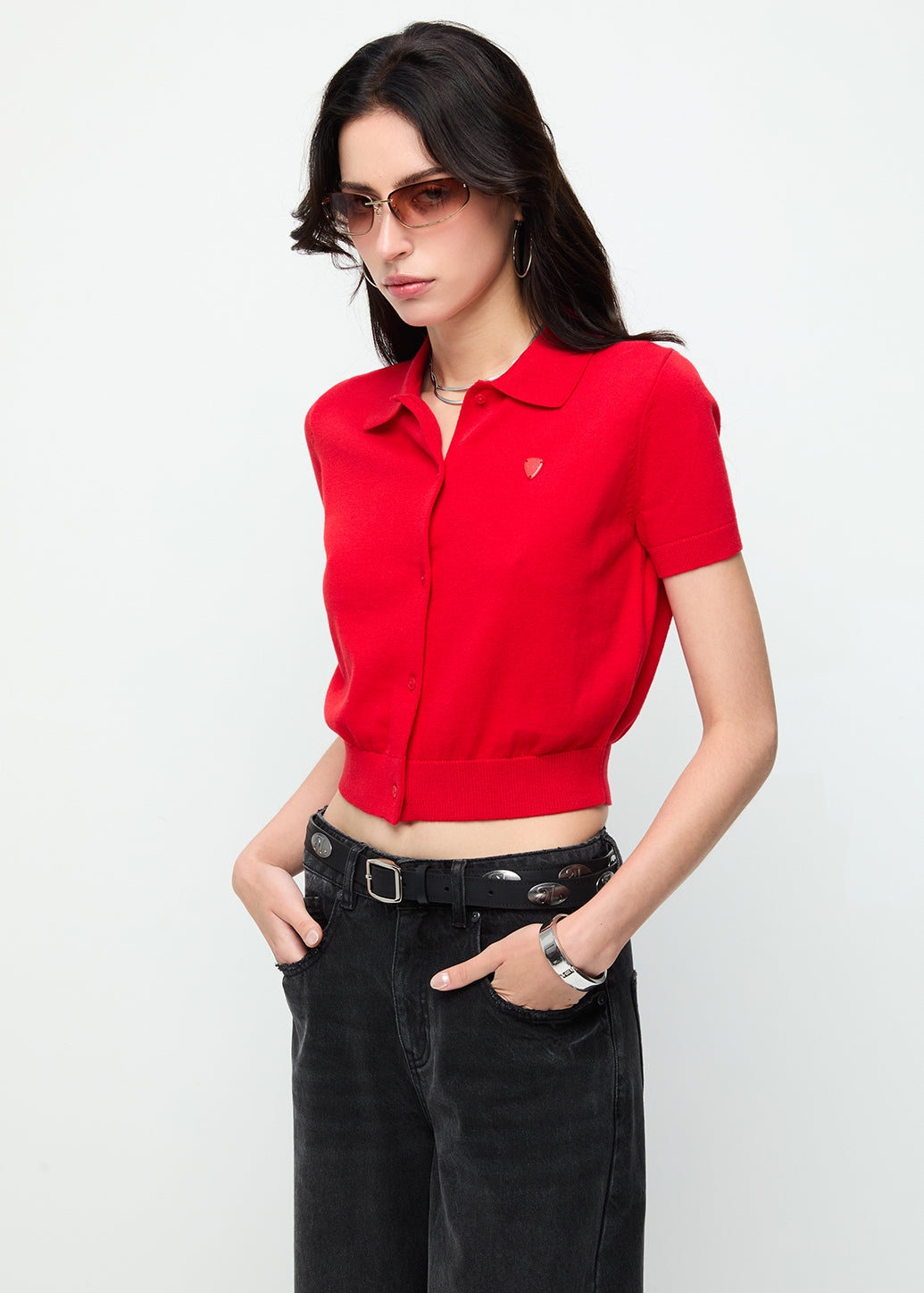 A classic knitted polo shirt with a full button-down front. Detailed with a tonal metal guitar pick logo on the chest. A distinctive CPS signature with ribbed collar, cuffs, and hem adds a refined touch, while the soft pastel tones balance a gentle sophistication with effortless cool.