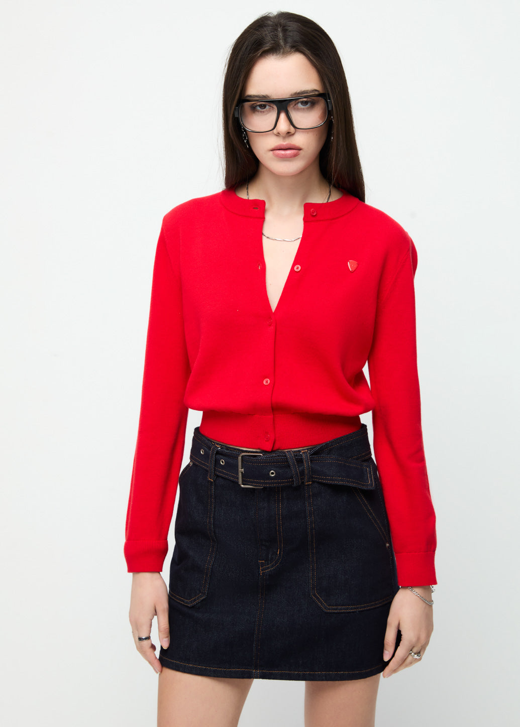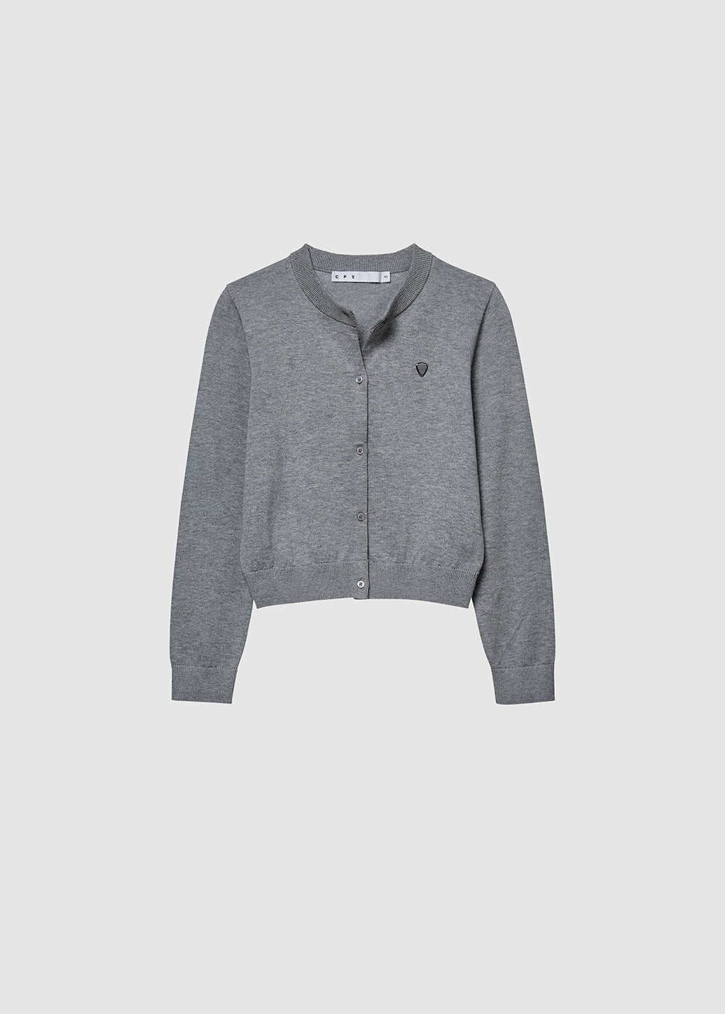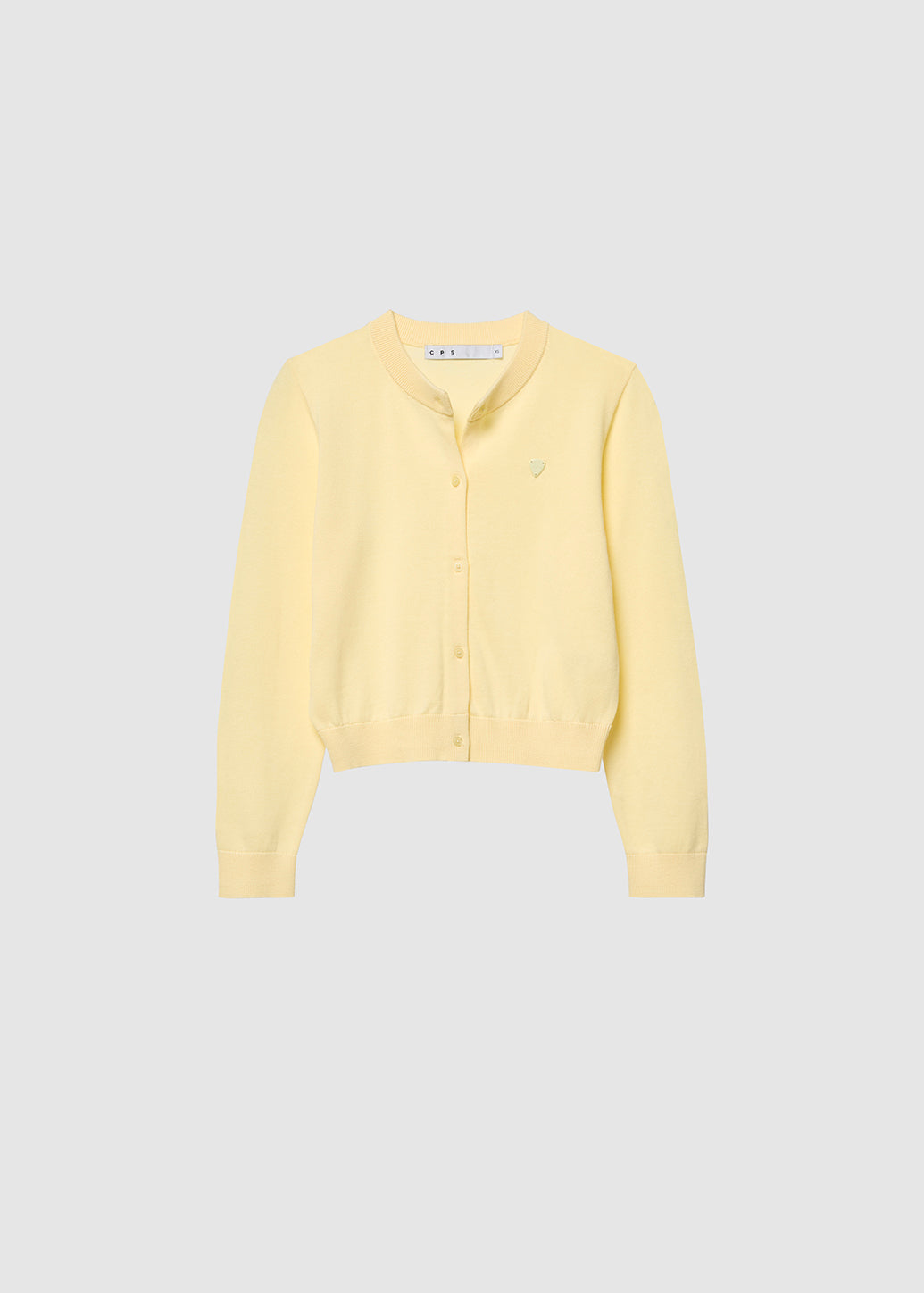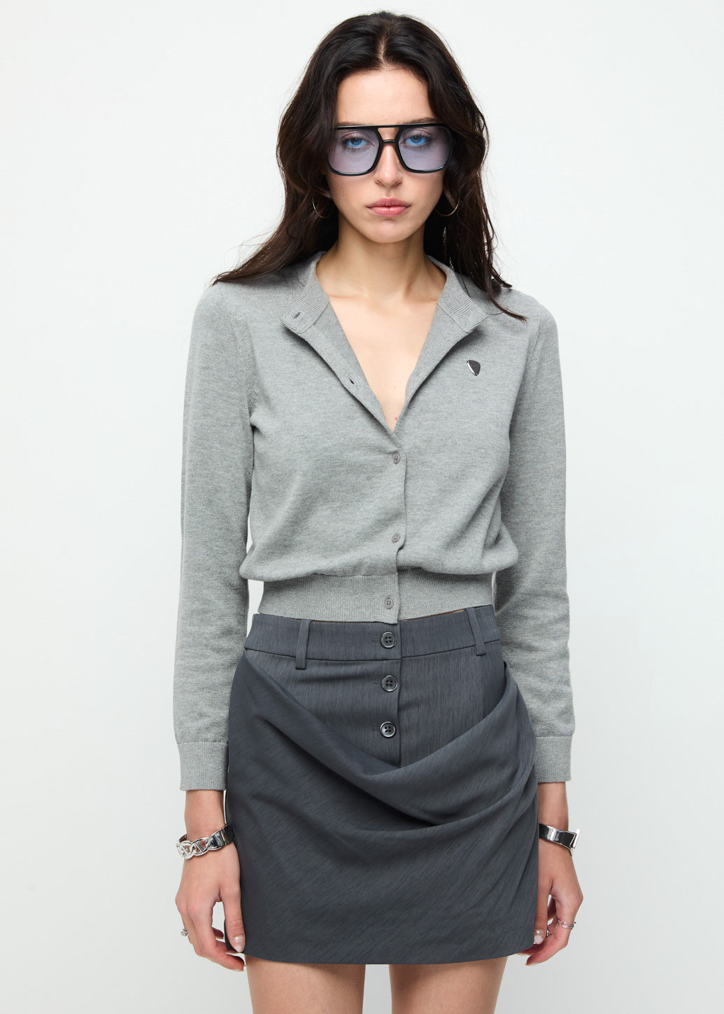 A cropped knitted cardigan with a modern edge, highlighted by a tonal guitar pick logo on the chest. Finished with ribbed detailing along the neckline, cuffs, and hem to define the silhouette of a chic yet minimal aesthetic. Perfect for mixing and matching with soft-toned items to get into feminine looks.